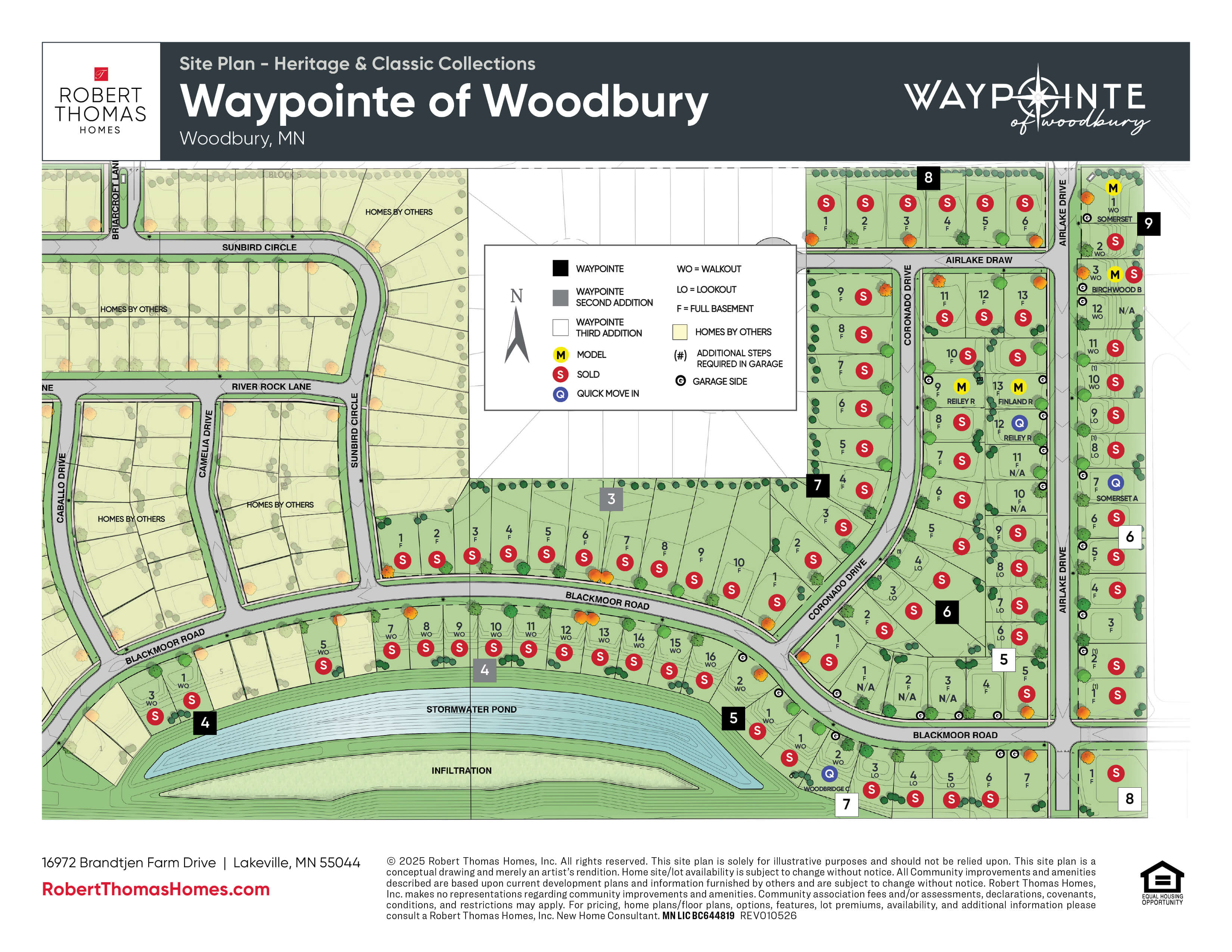 The thoughtfully designed development offers homesites nestled amongst open green spaces, tree-lined streets, and a large pond. Sidewalks and a trail system connect the neighborhood to the future Central Greenway regional trail along Woodbury Drive. Waypointe of Woodbury has convenient access to East Ridge High School and HealthEast Sports Center.