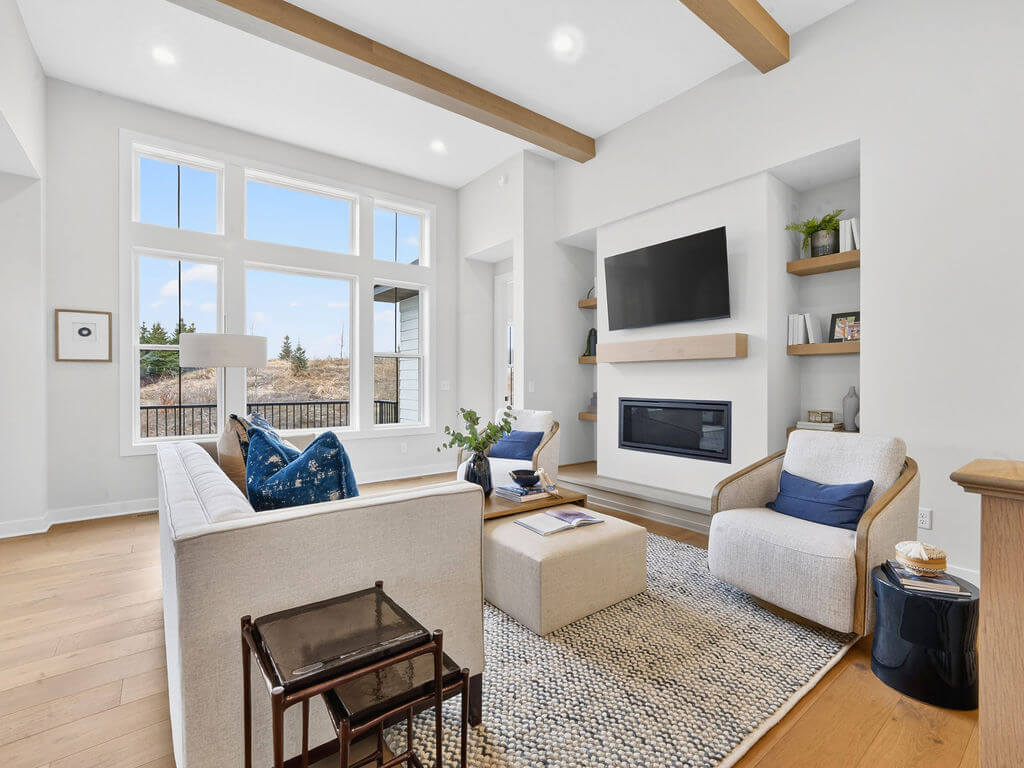 Architectural features – The 10’ vaulted wood ceiling in the foyer welcomes you in style. The gathering room beams rise to 12’, framing a floating-shelf fireplace perfect for family moments. Elegant arches guide you to the four-season porch, seamlessly connecting indoor and outdoor activities.