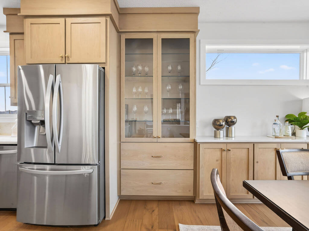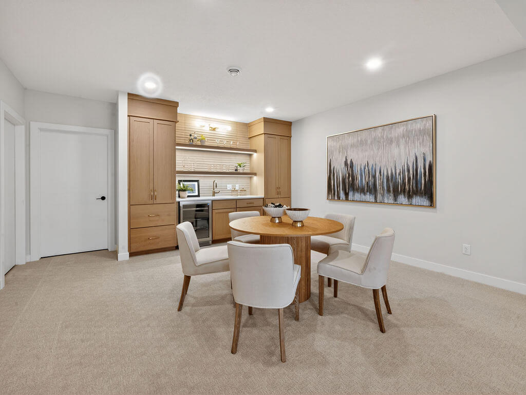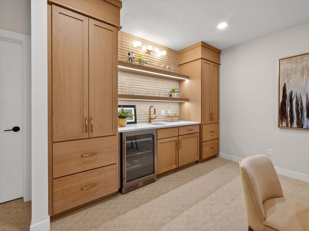 In the kitchen, a quartz backsplash pairs with custom built-in cabinetry that extends through the dining space, providing both visual continuity and ample storage. Throughout the home, layered textures add depth and character. Grasscloth wallpaper brings warmth to the flex room, while the primary shower features a striking fluted wood-grain tile accent wall.