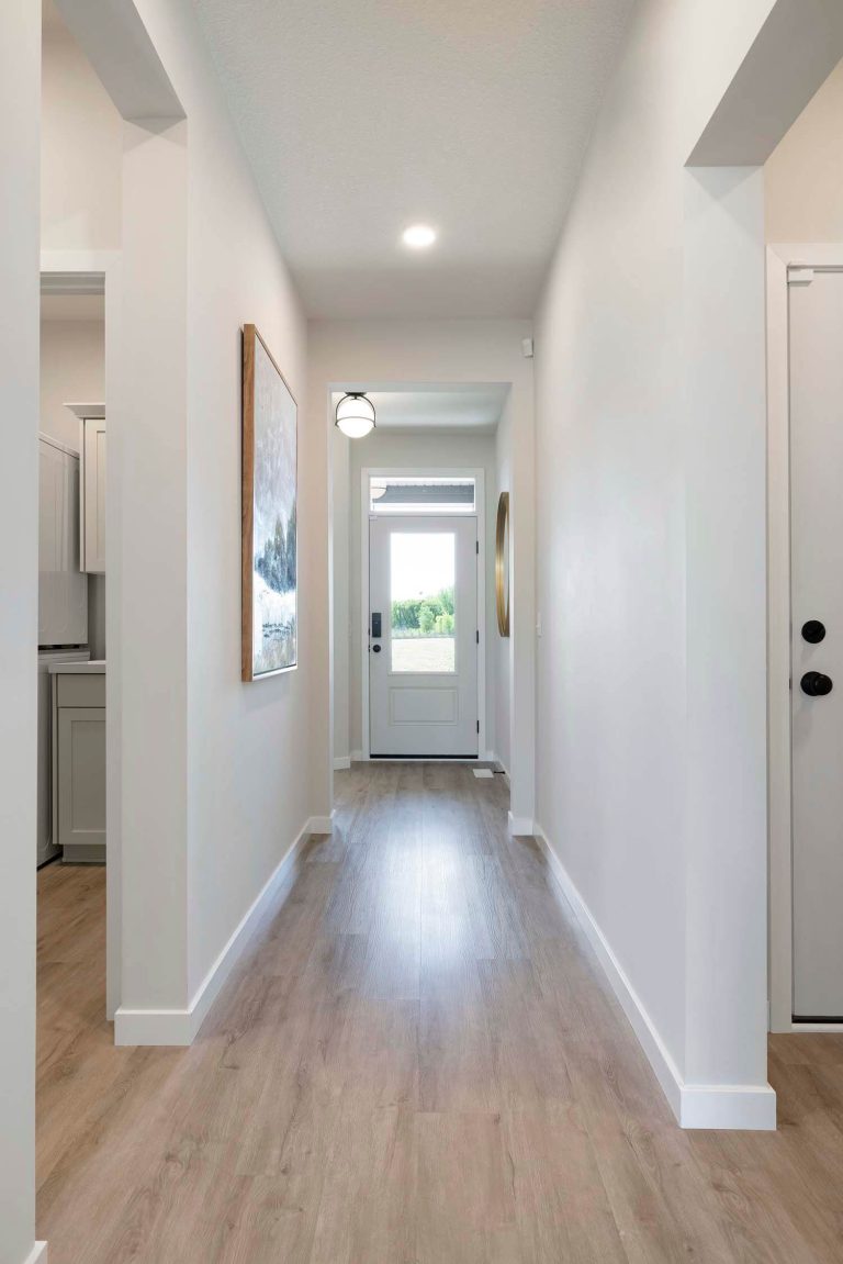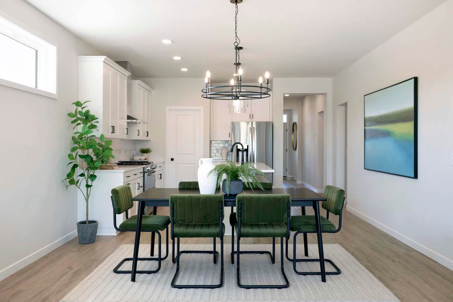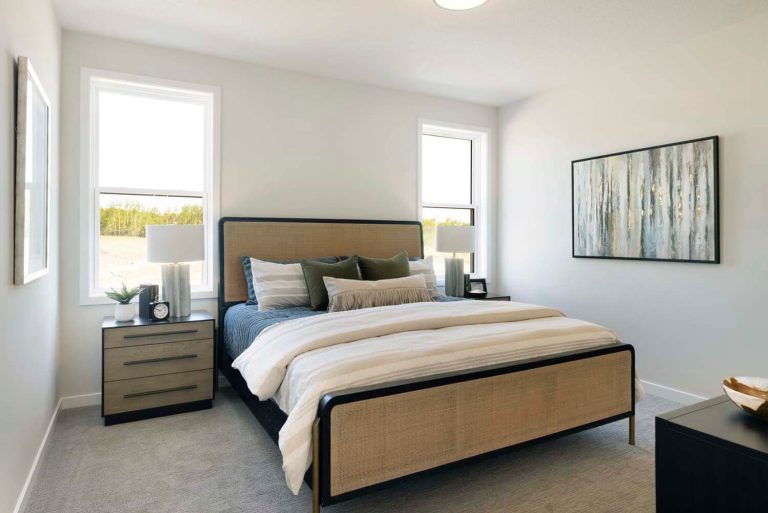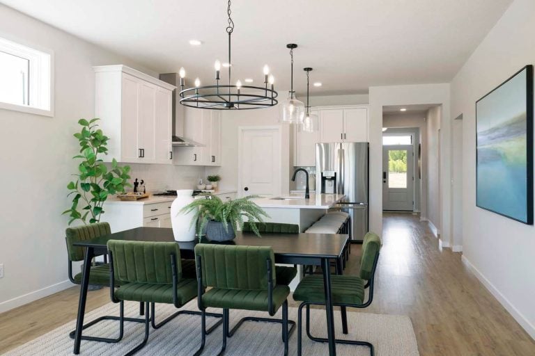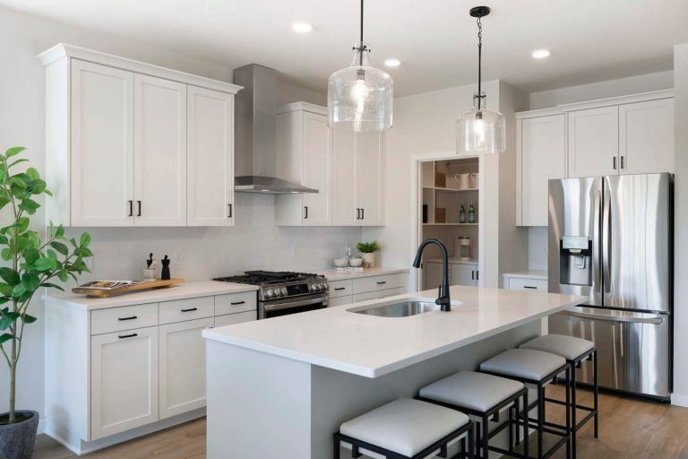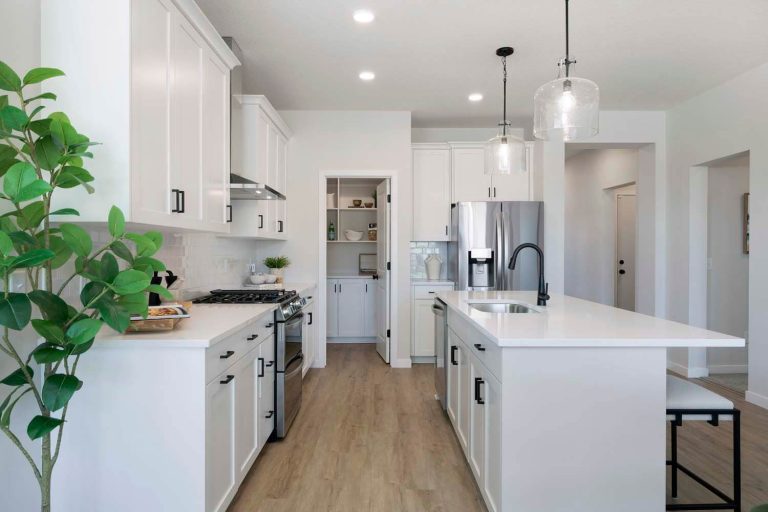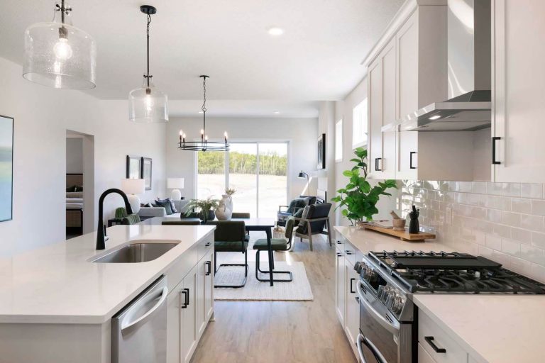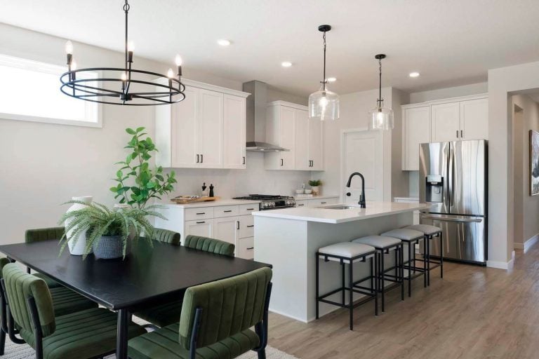 - Kitchen offers 42″ upper cabinets, gas range, French door refrigerator, double garbage rollout, and morning kitchen