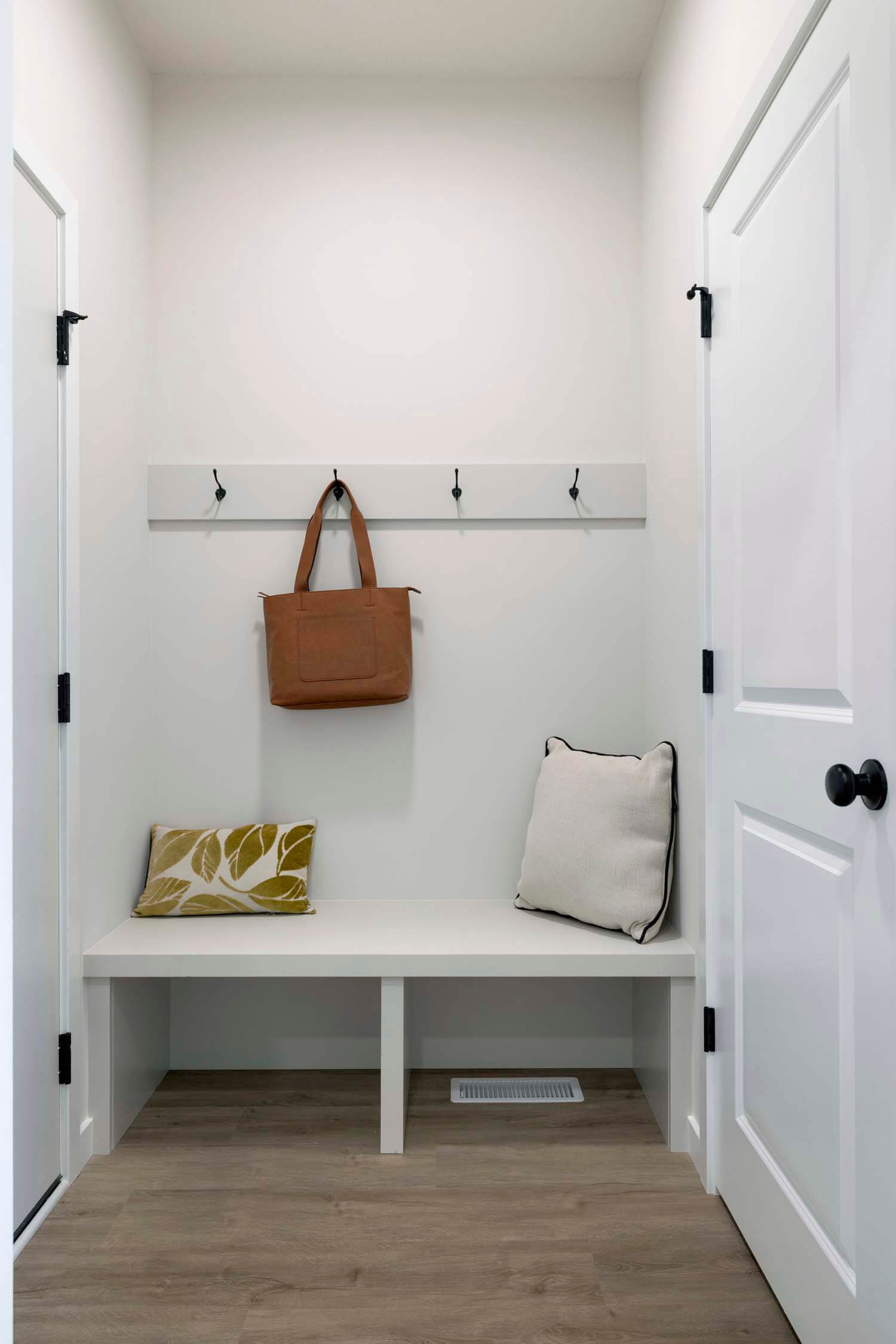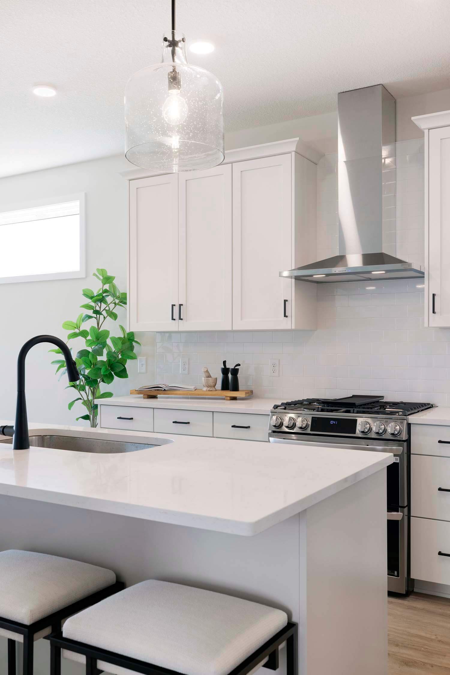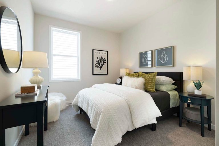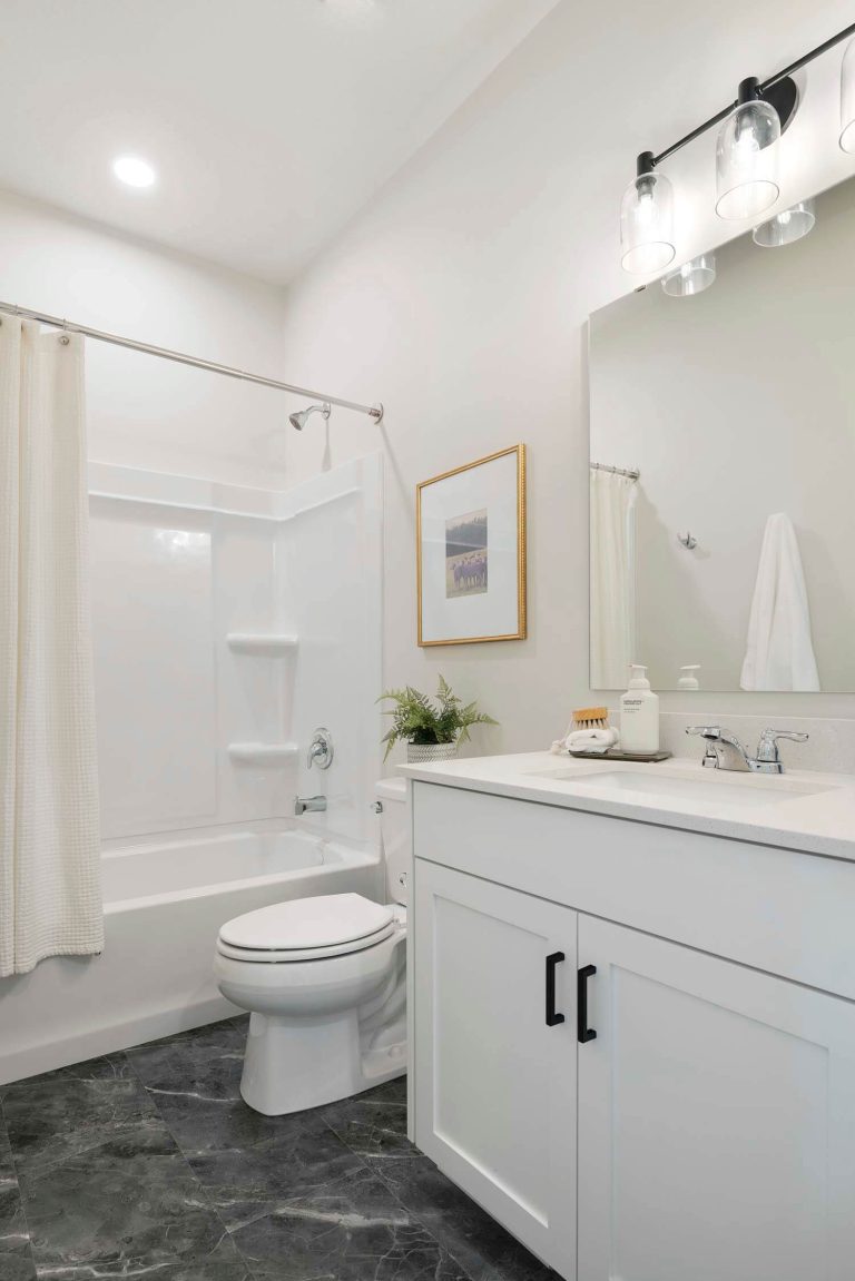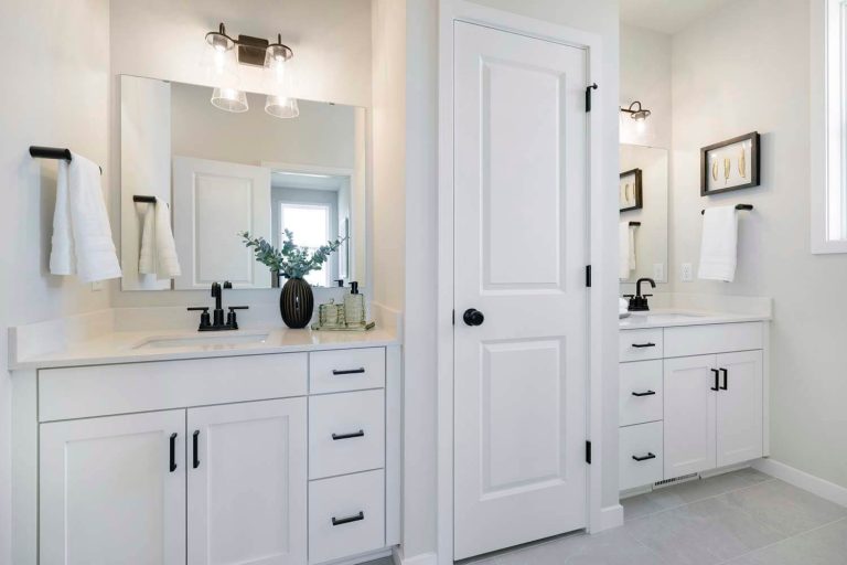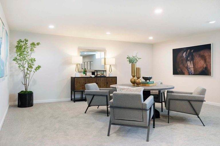 - Kitchen offers 42″ upper cabinets, gas range, French door refrigerator, double garbage rollout, and morning kitchen