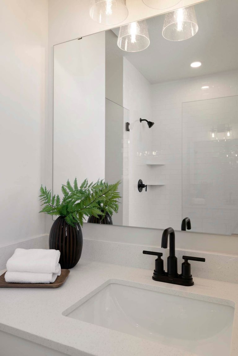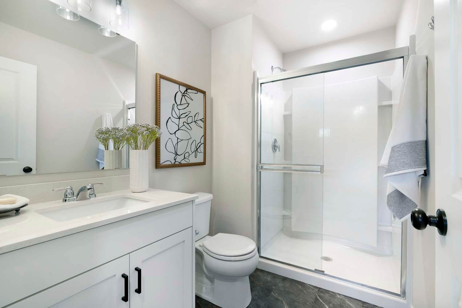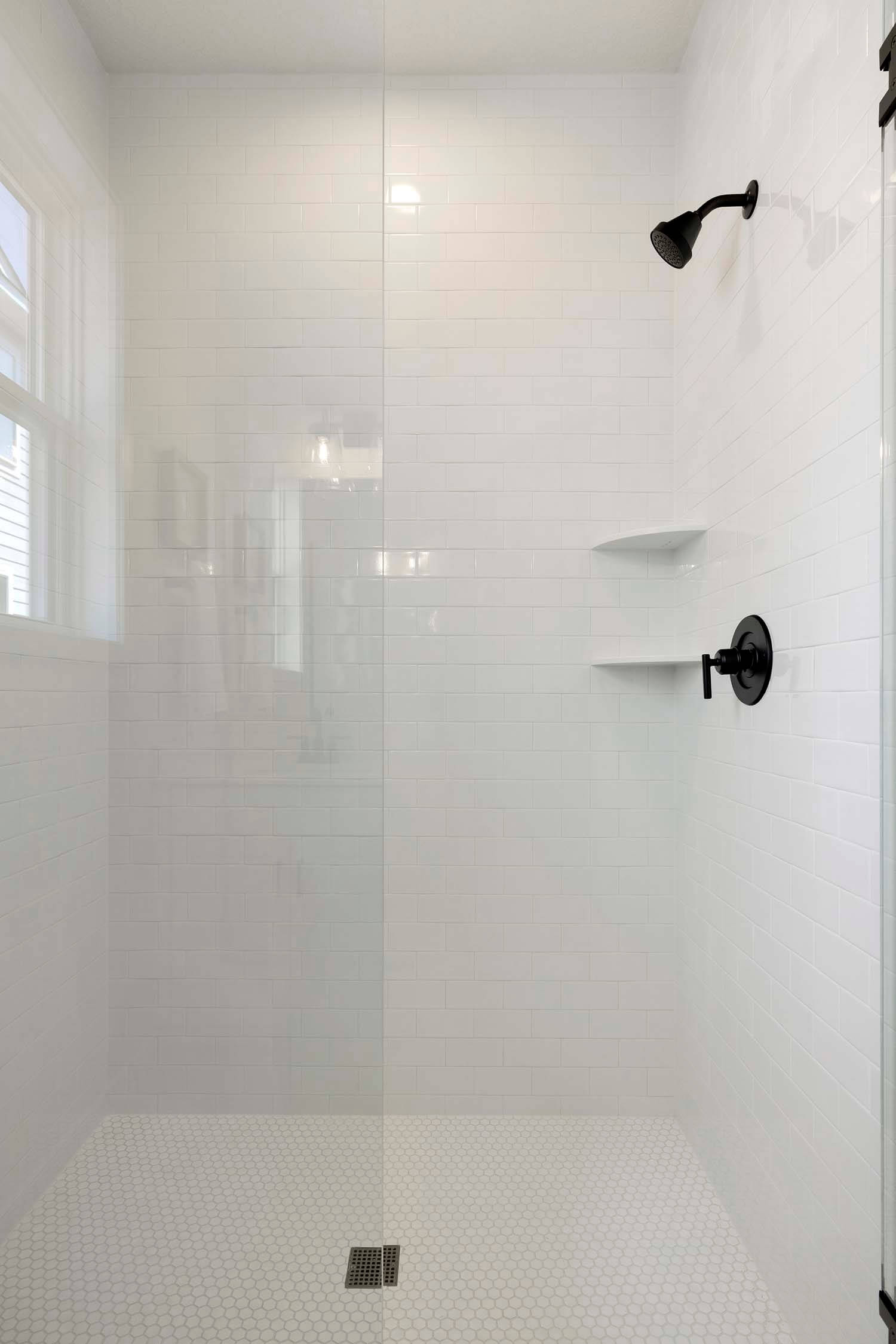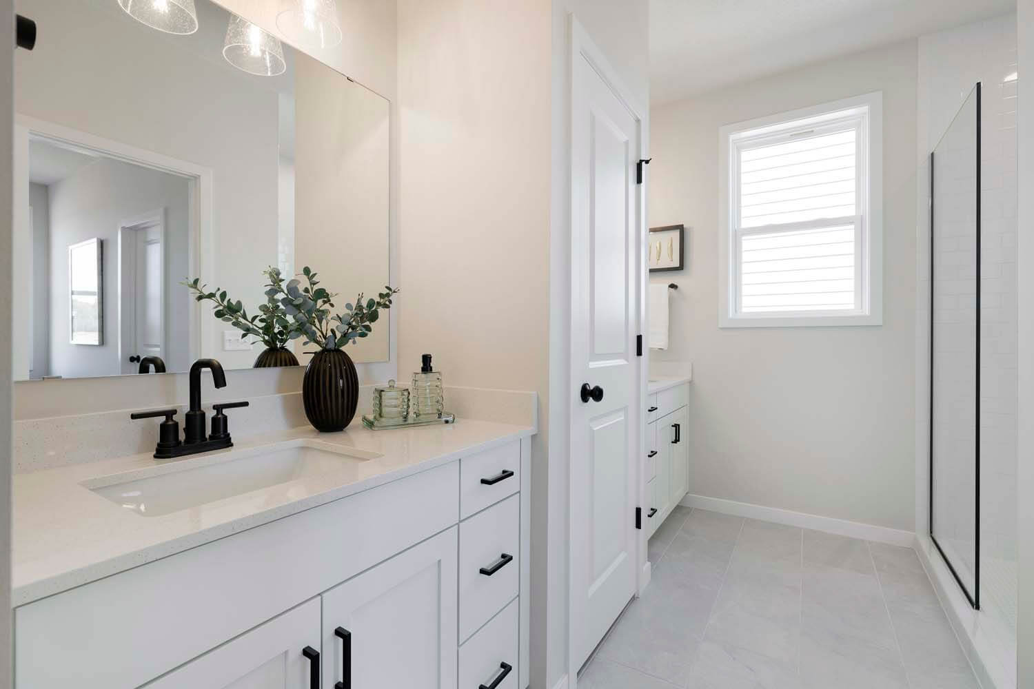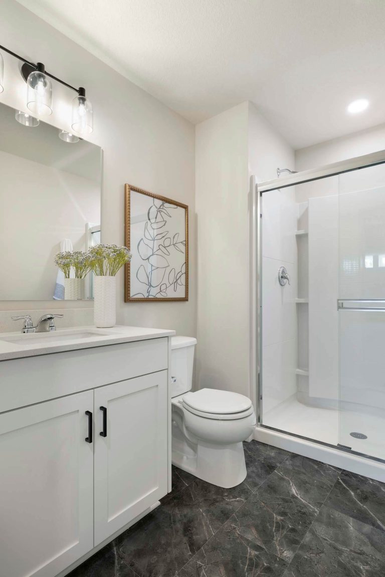- Owner’s suite features double vanity, large tiled shower with heavy glass swing door, and walk-in closet