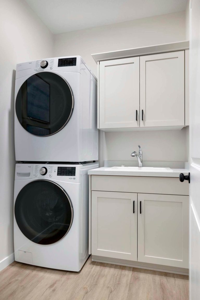 - Main level laundry room with stackable washer and electric dryer with laundry cabinet with sink