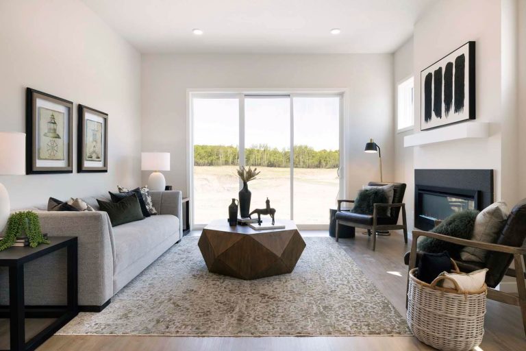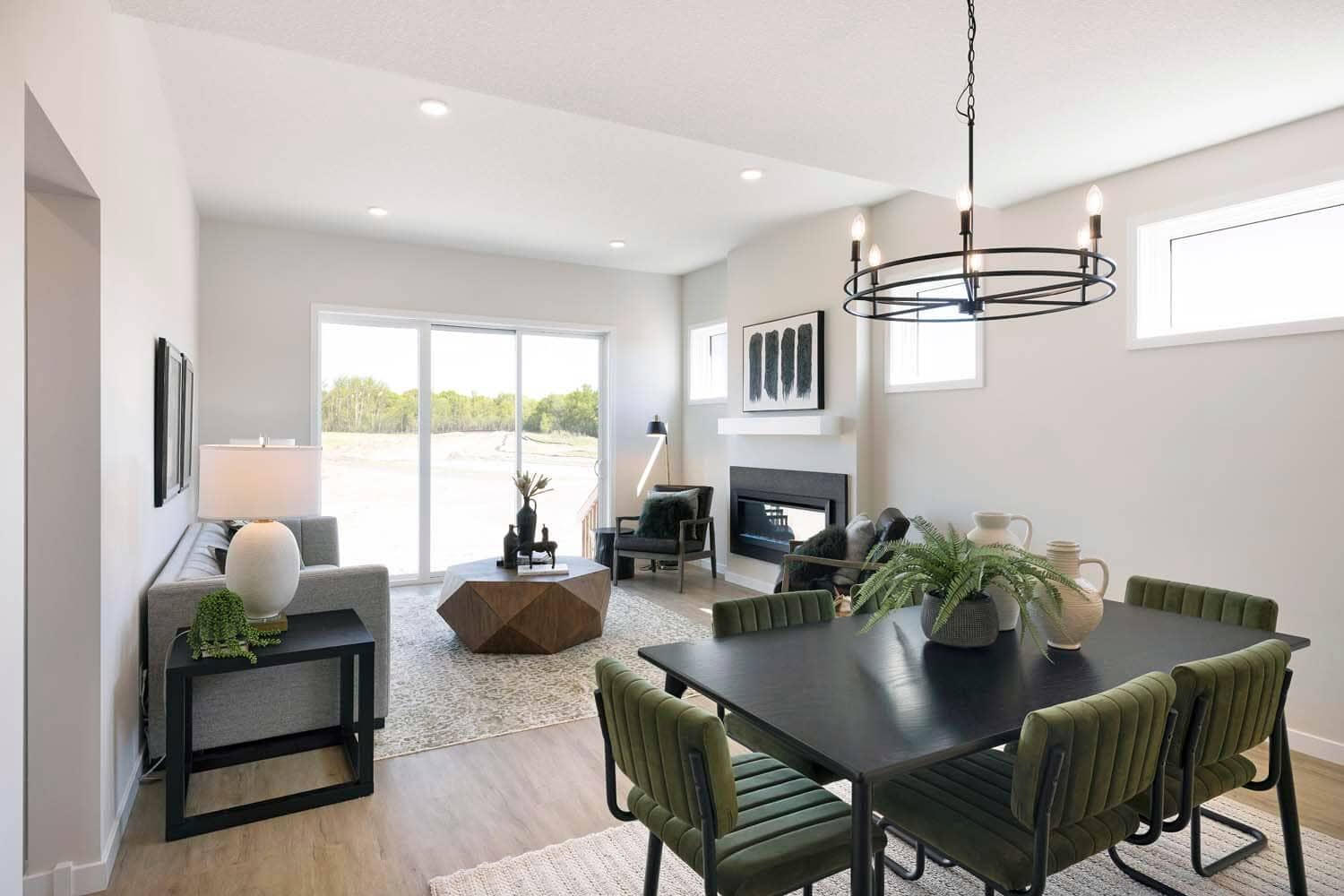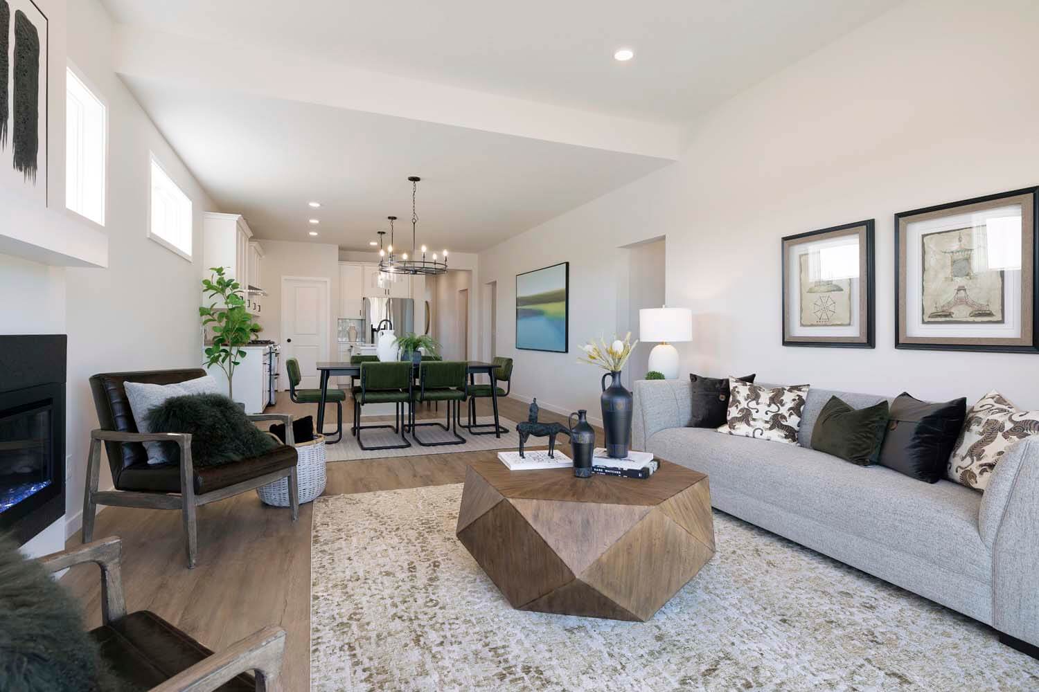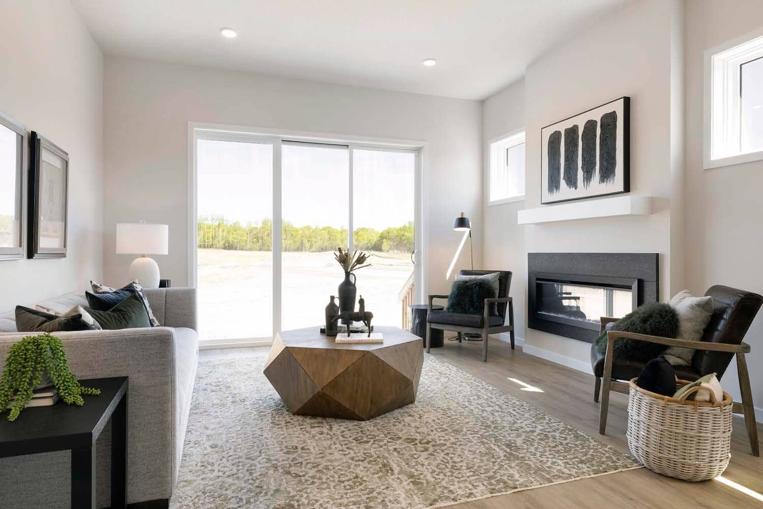 - Light-filled gathering room with electric fireplace.