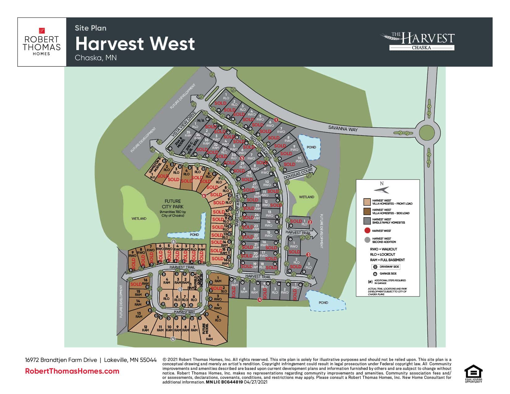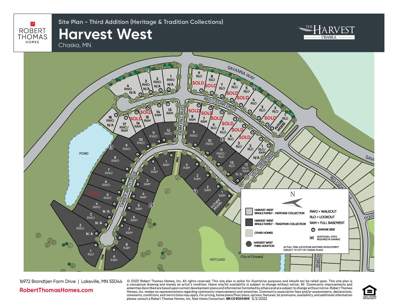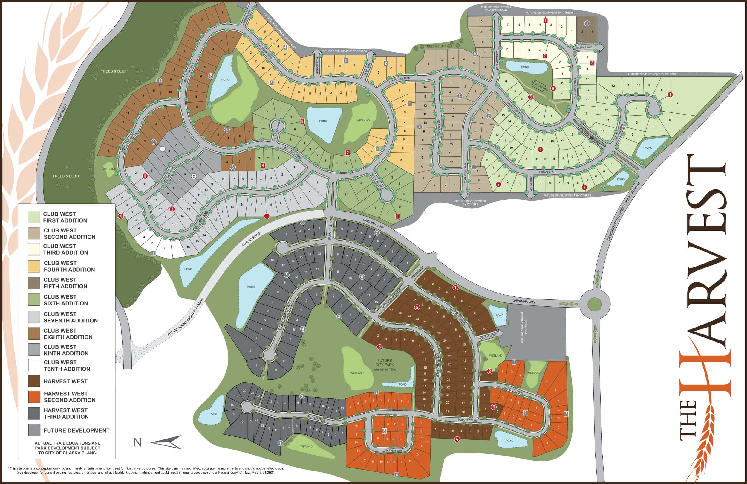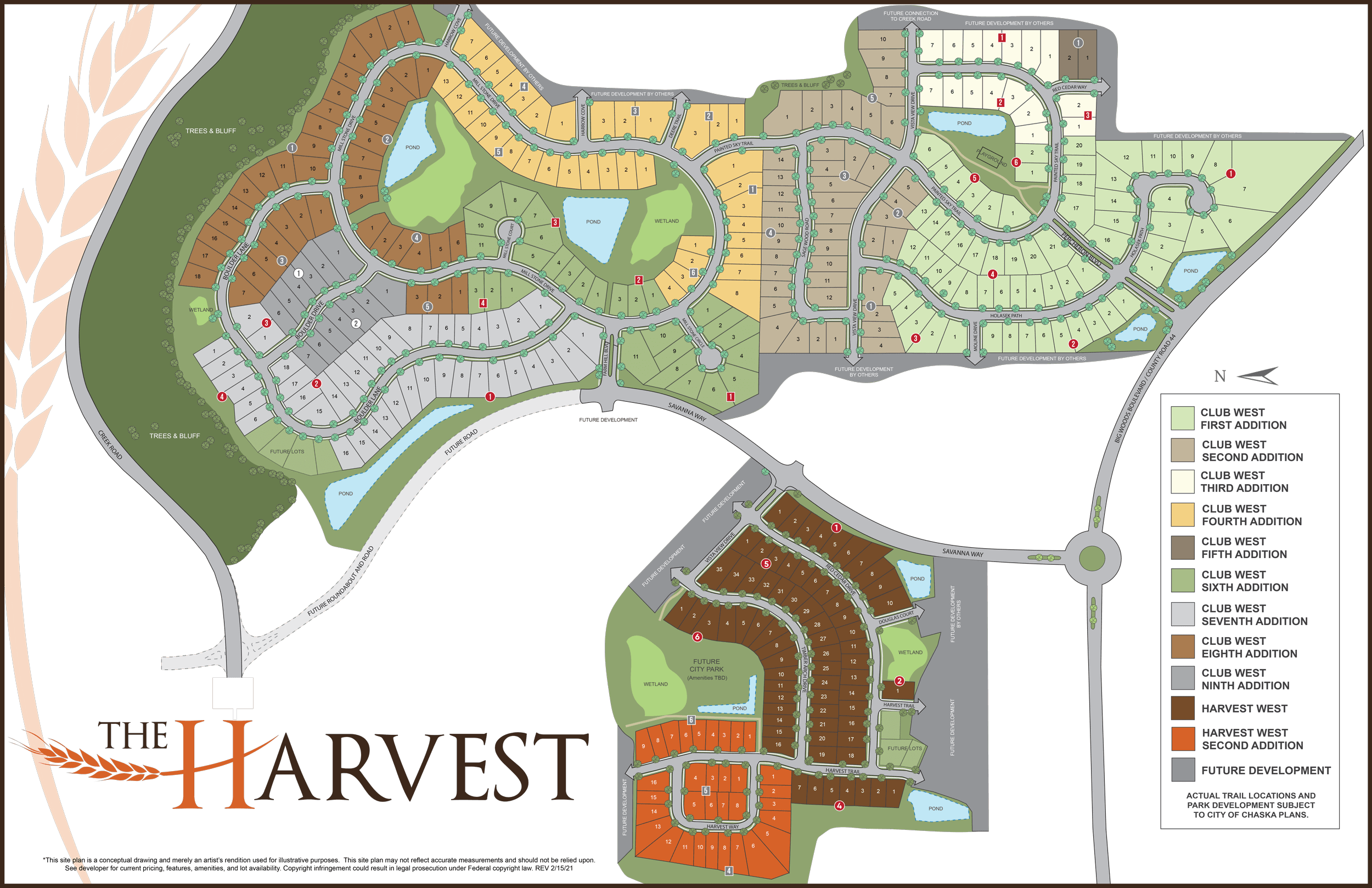 The Harvest features parks, tree-lined lots, trails and private wooded home sites. The neighborhood is just minutes away from historic downtown Chaska, Eden Prairie shopping center, movie theaters, and dining establishments.
