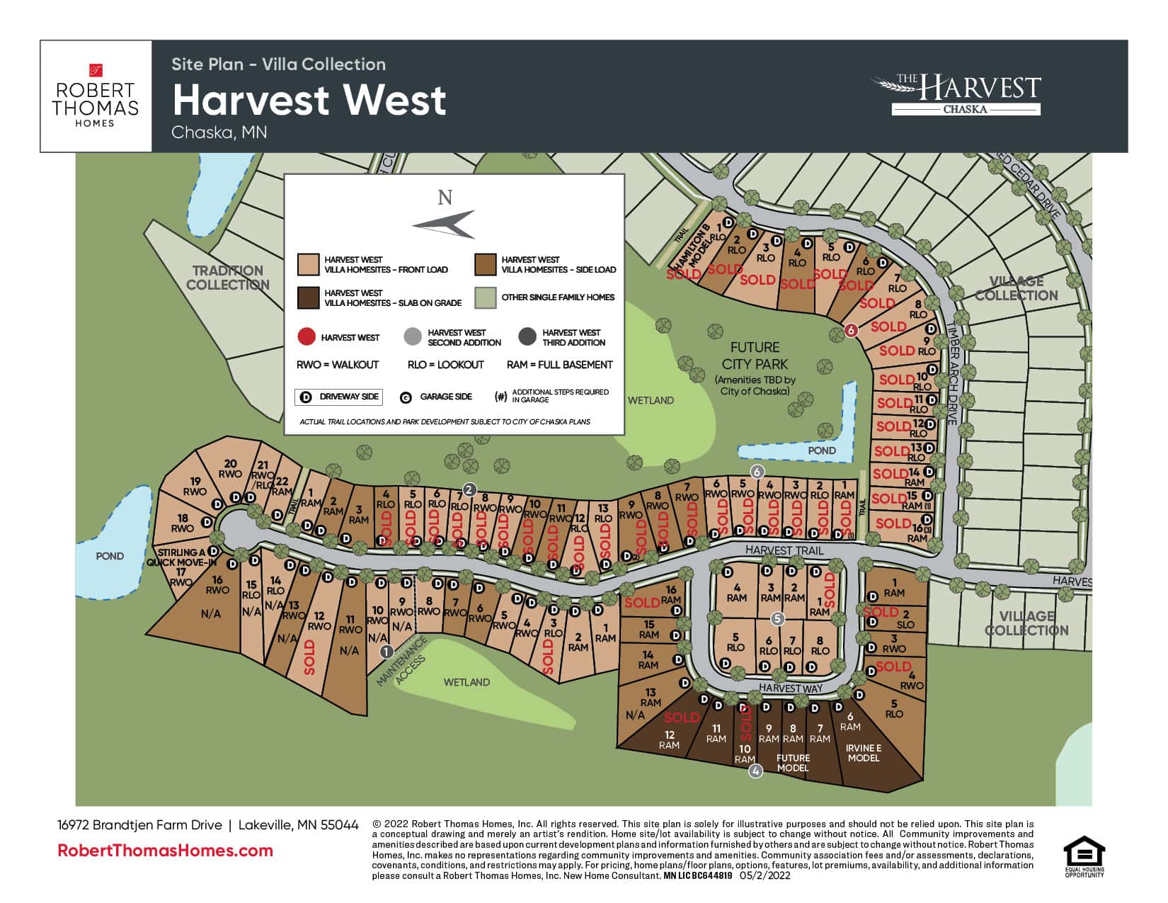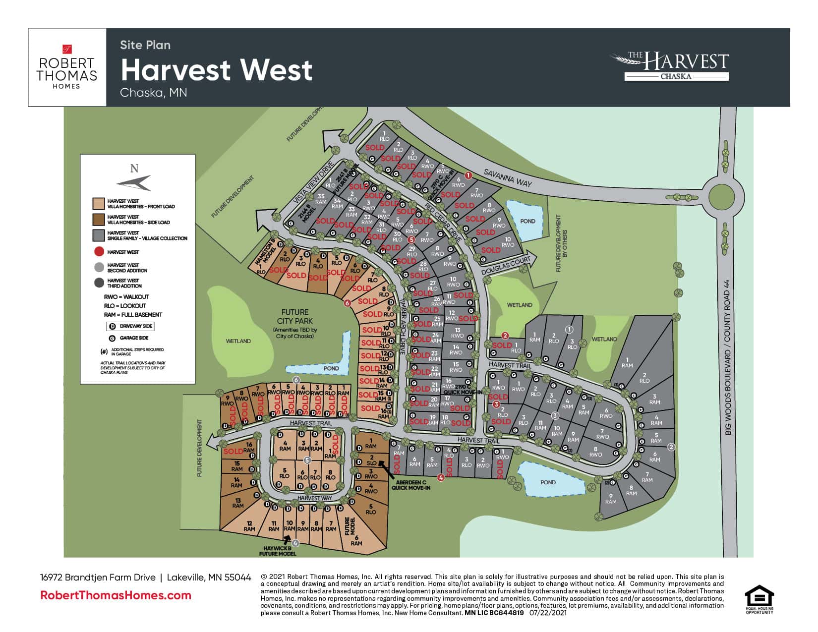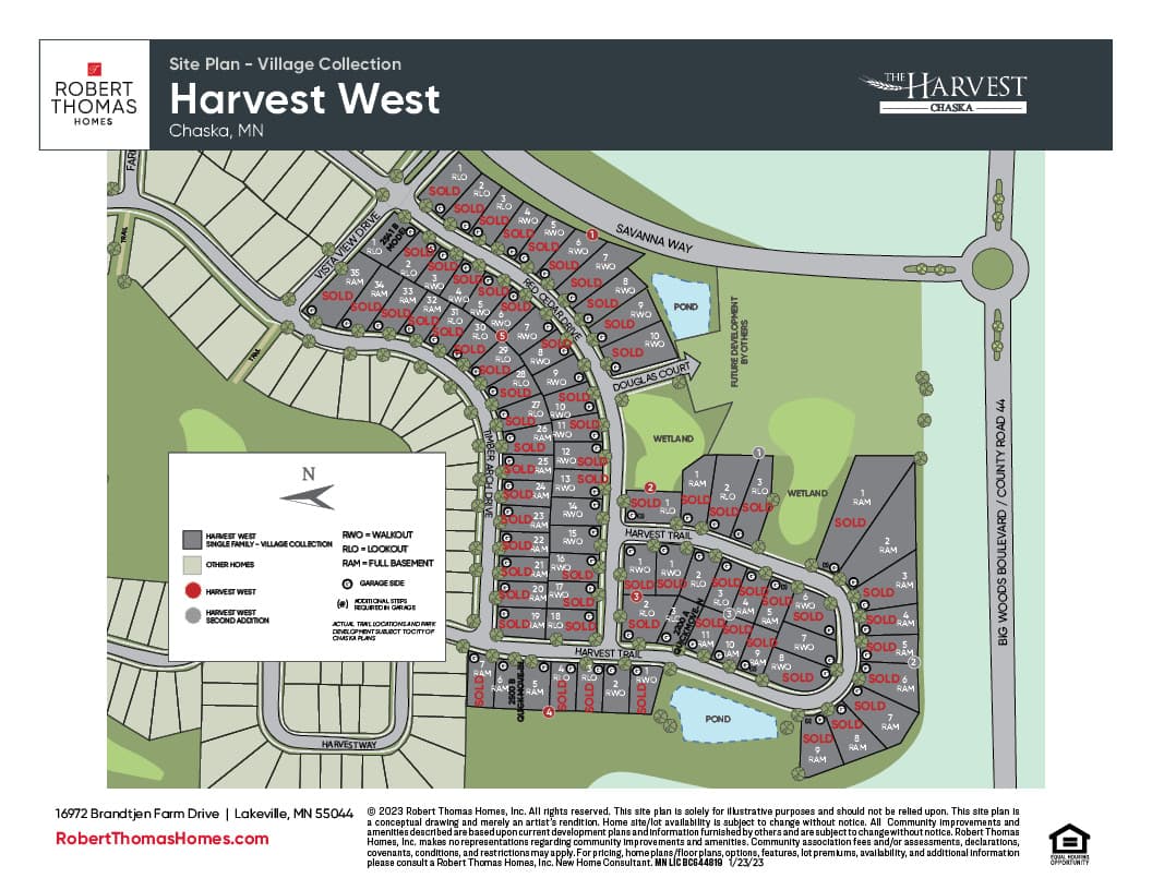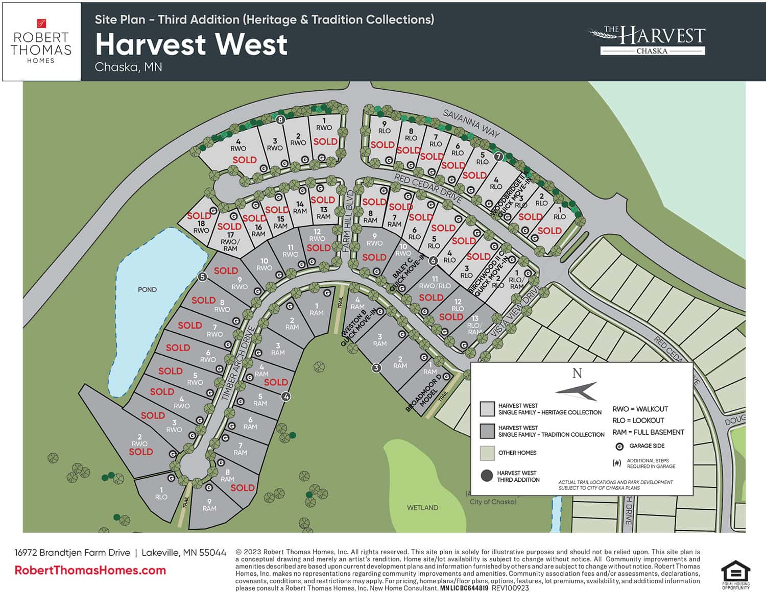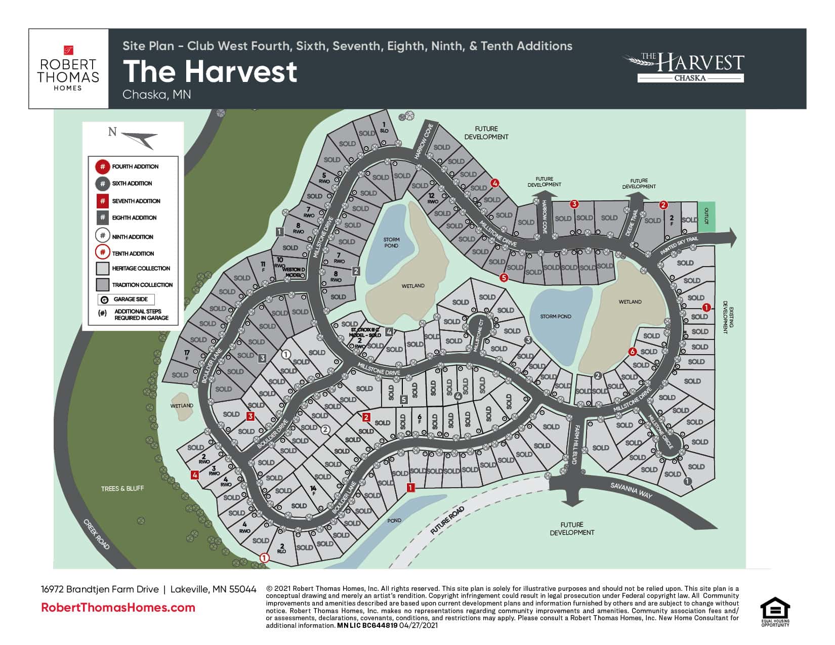The Harvest features parks, tree-lined lots, trails and private wooded home sites. The neighborhood is just minutes away from historic downtown Chaska, Eden Prairie shopping center, movie theaters, and dining establishments.