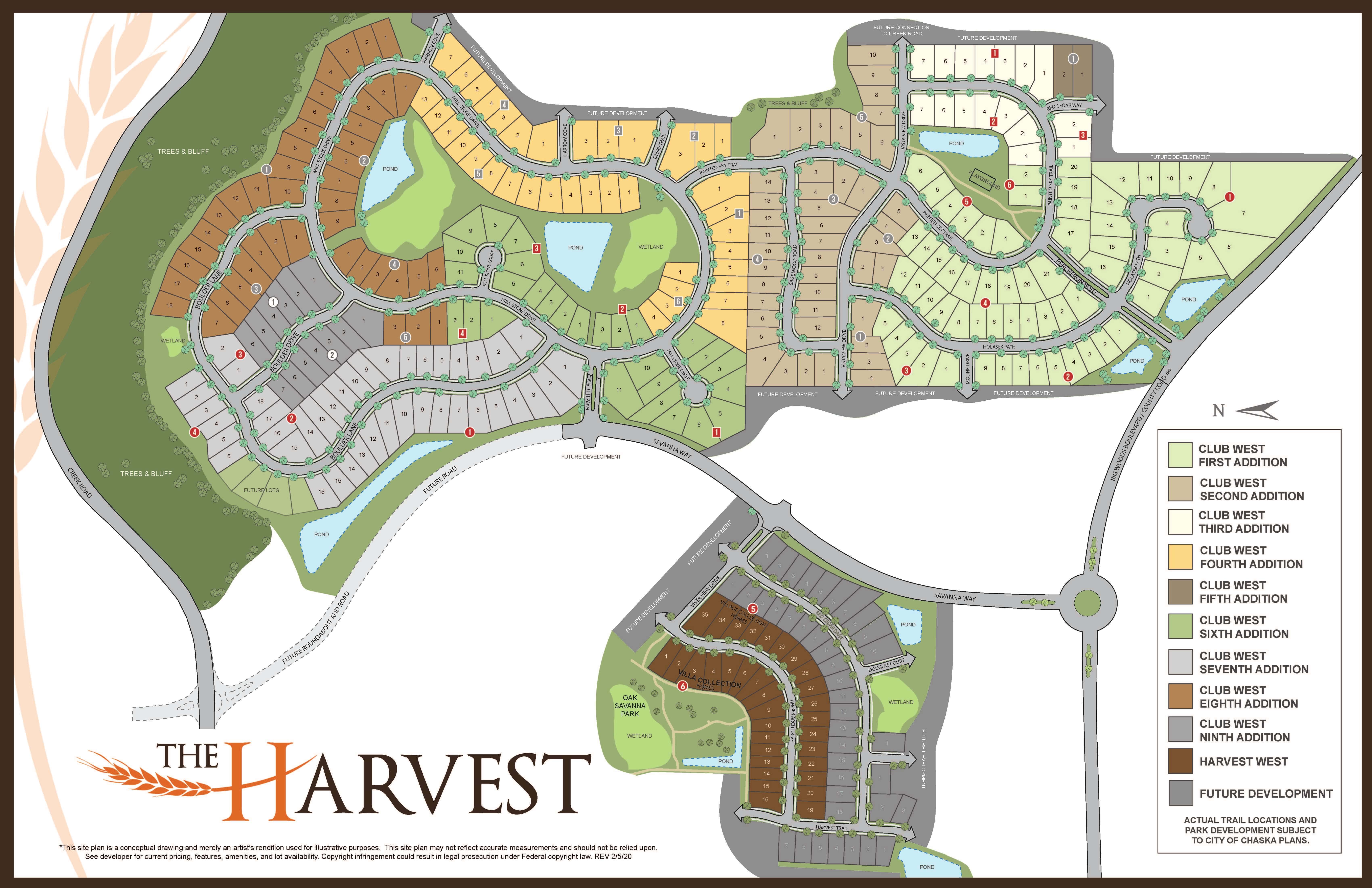 The homes are built on large lots between an abundance of green vegetation, natural wetlands, walking trails, and neighborhood parks. Homeowners in The Harvest are part of a community association. For more details, please speak to your New Home Consultant.