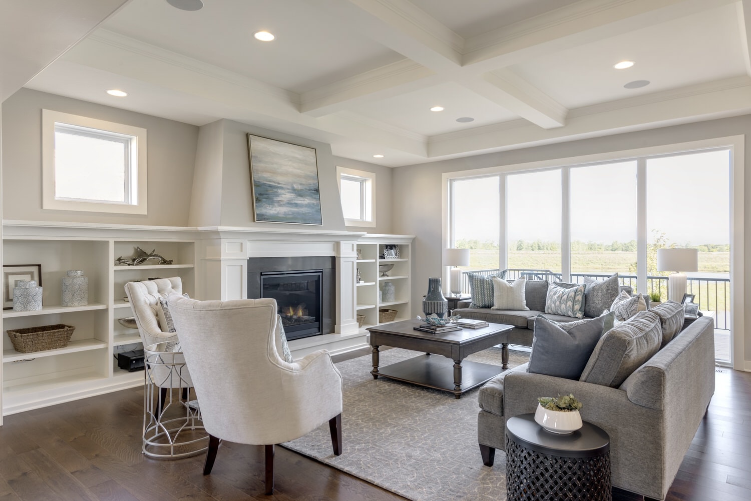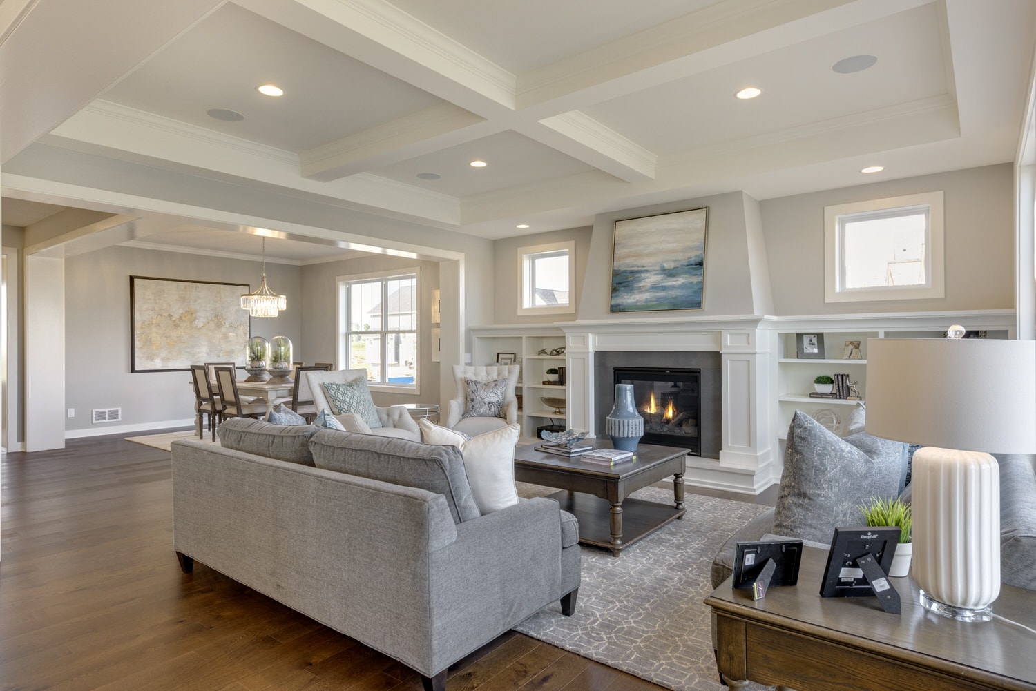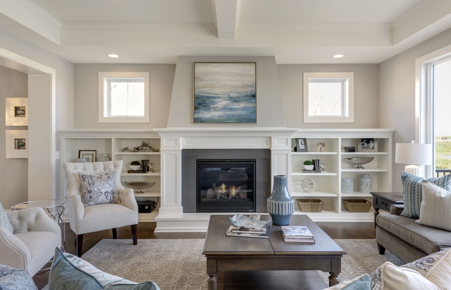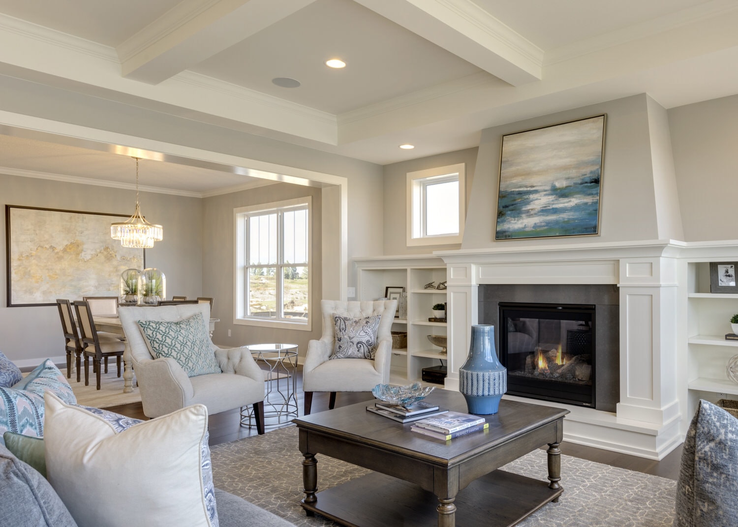 - Gathering room with fireplace and raised ceiling; optional built-ins and beamed ceiling detail