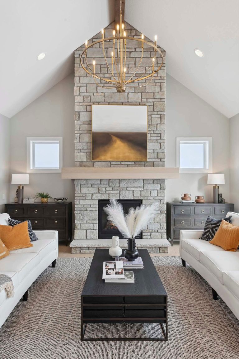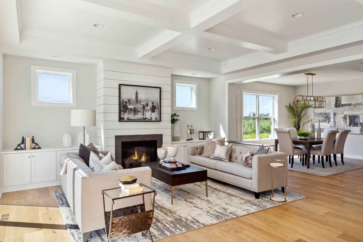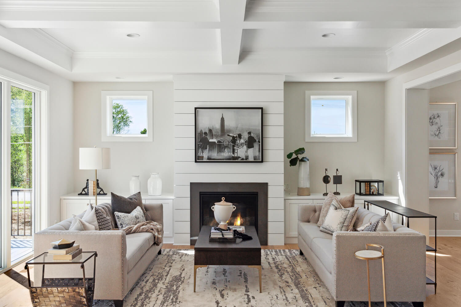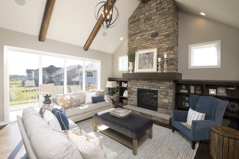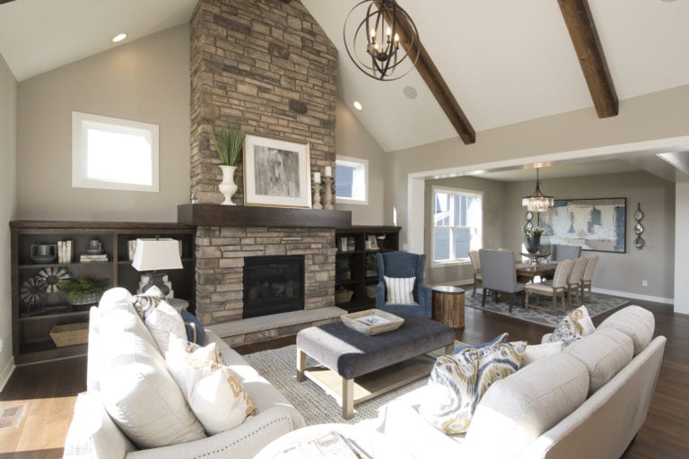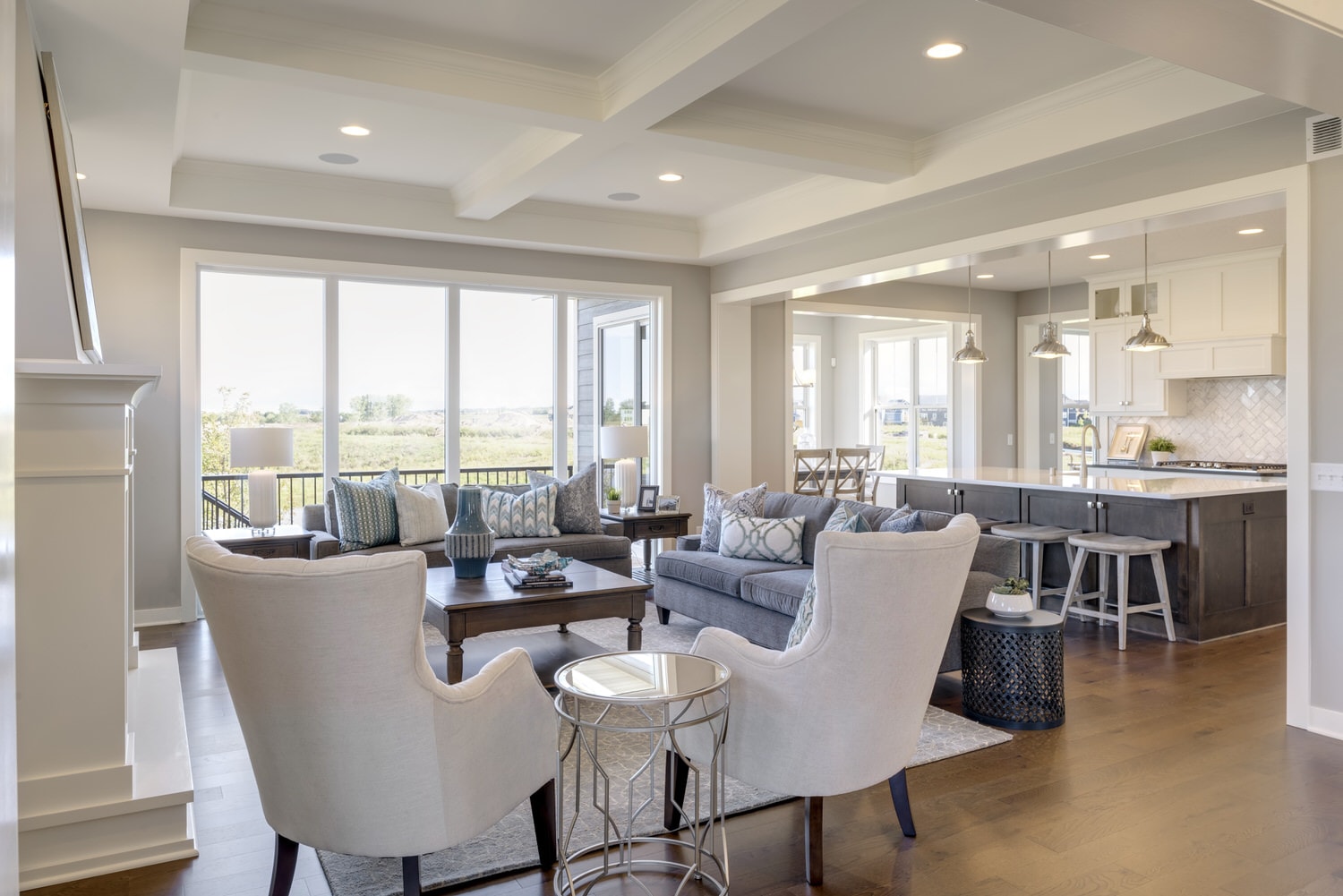 - Gathering room with fireplace and raised ceiling; optional built-ins and beamed ceiling detail