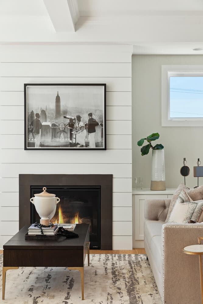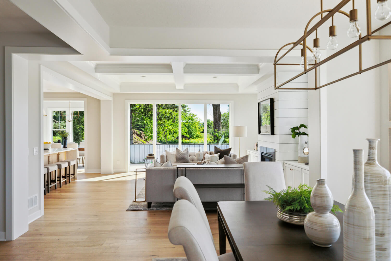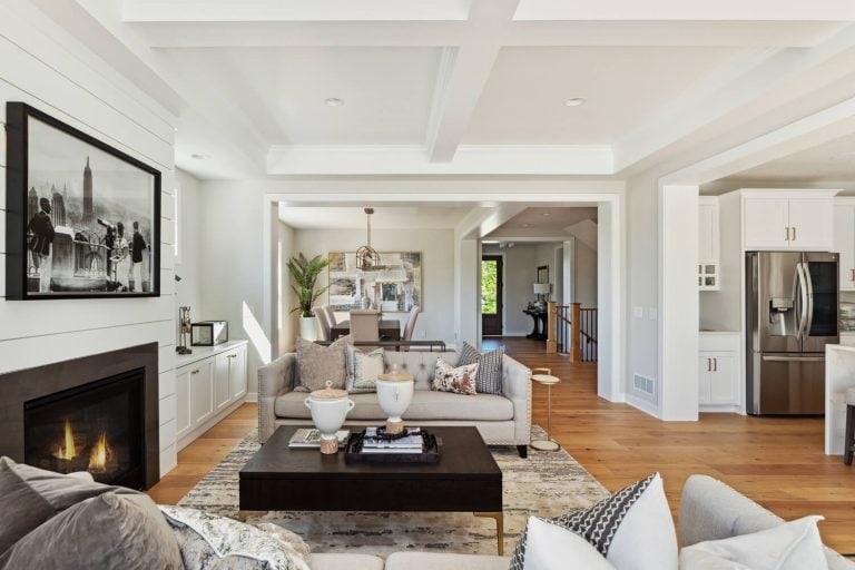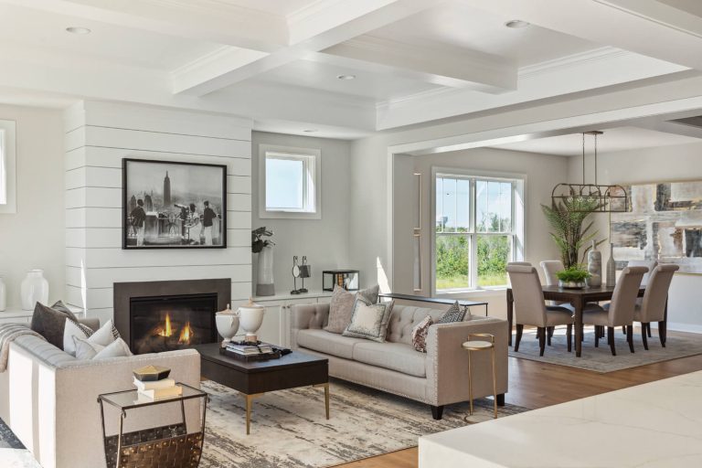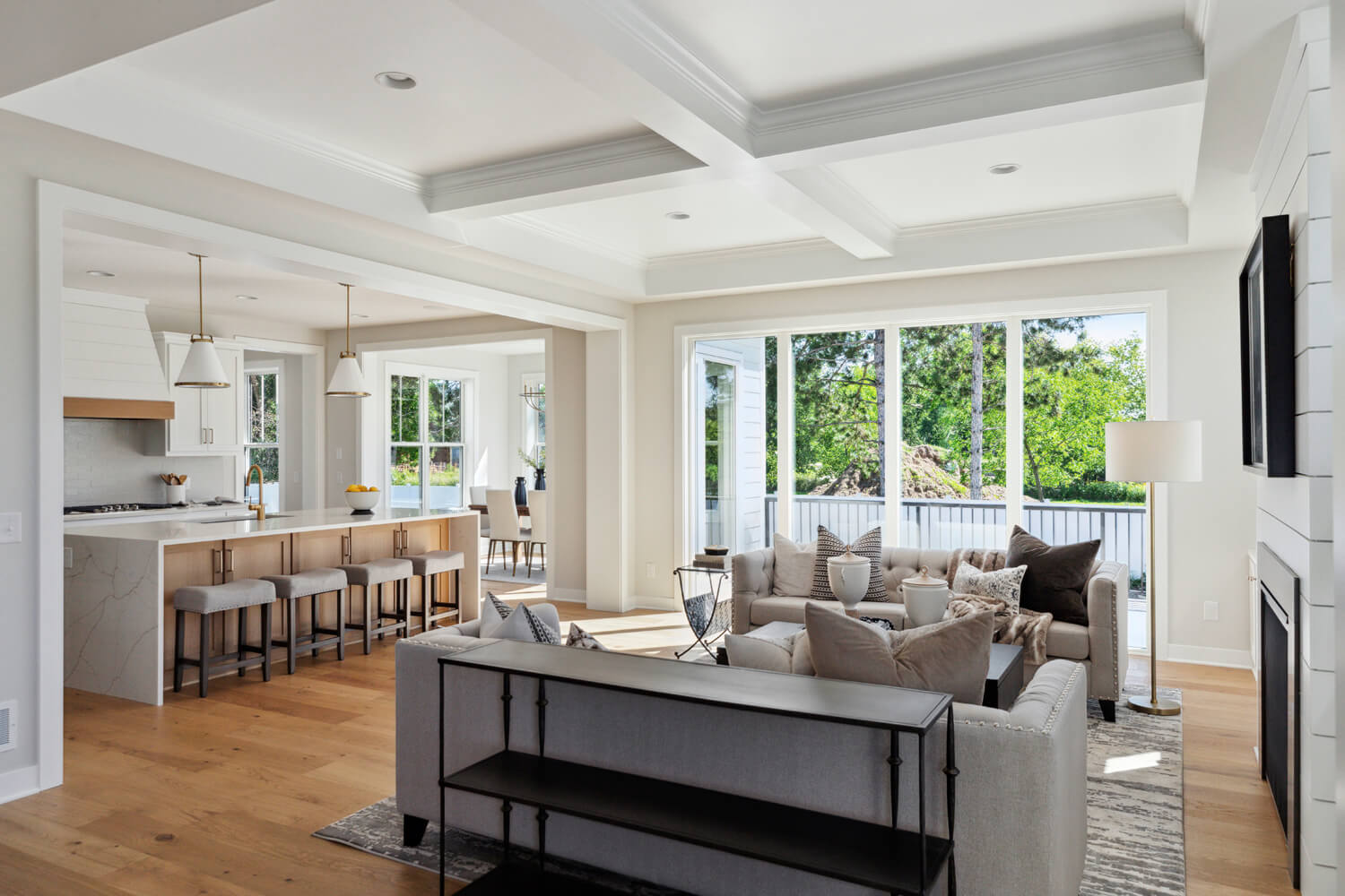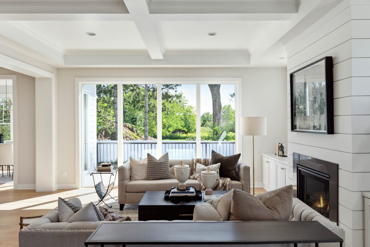 - Gathering room with fireplace and raised ceiling; optional built-ins and beamed ceiling detail