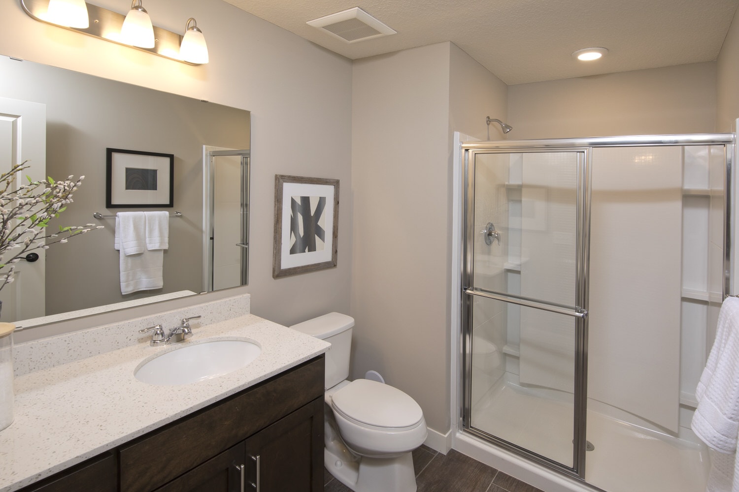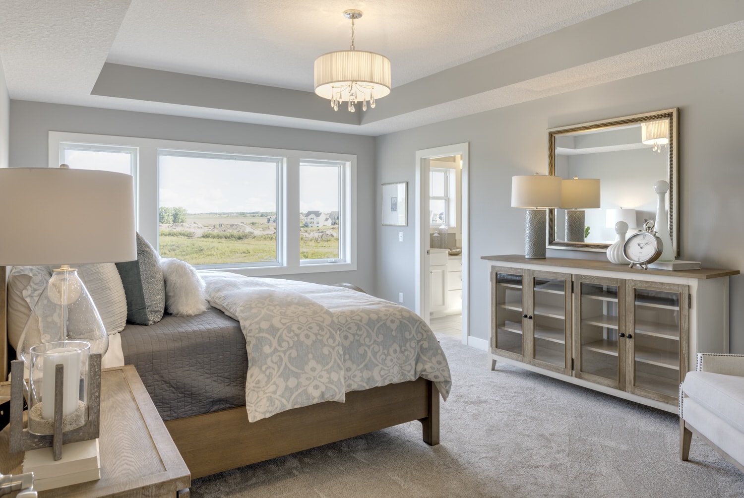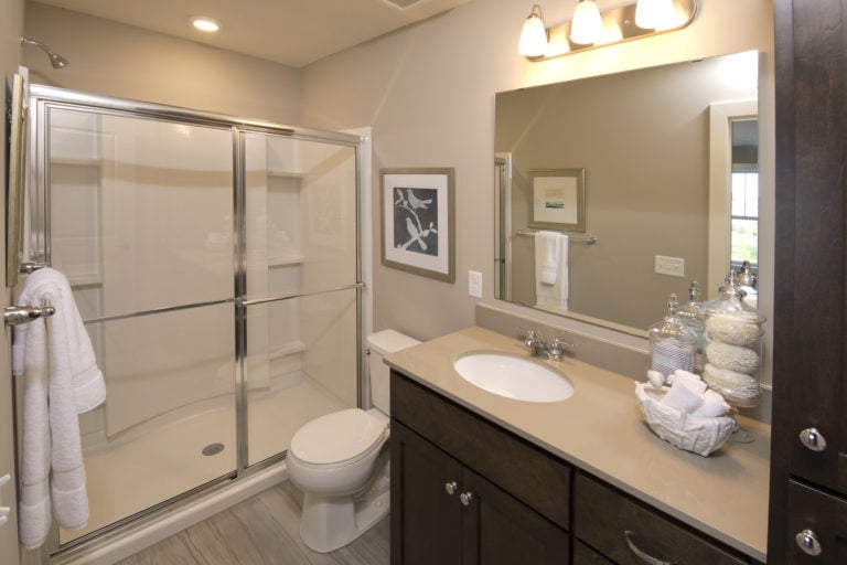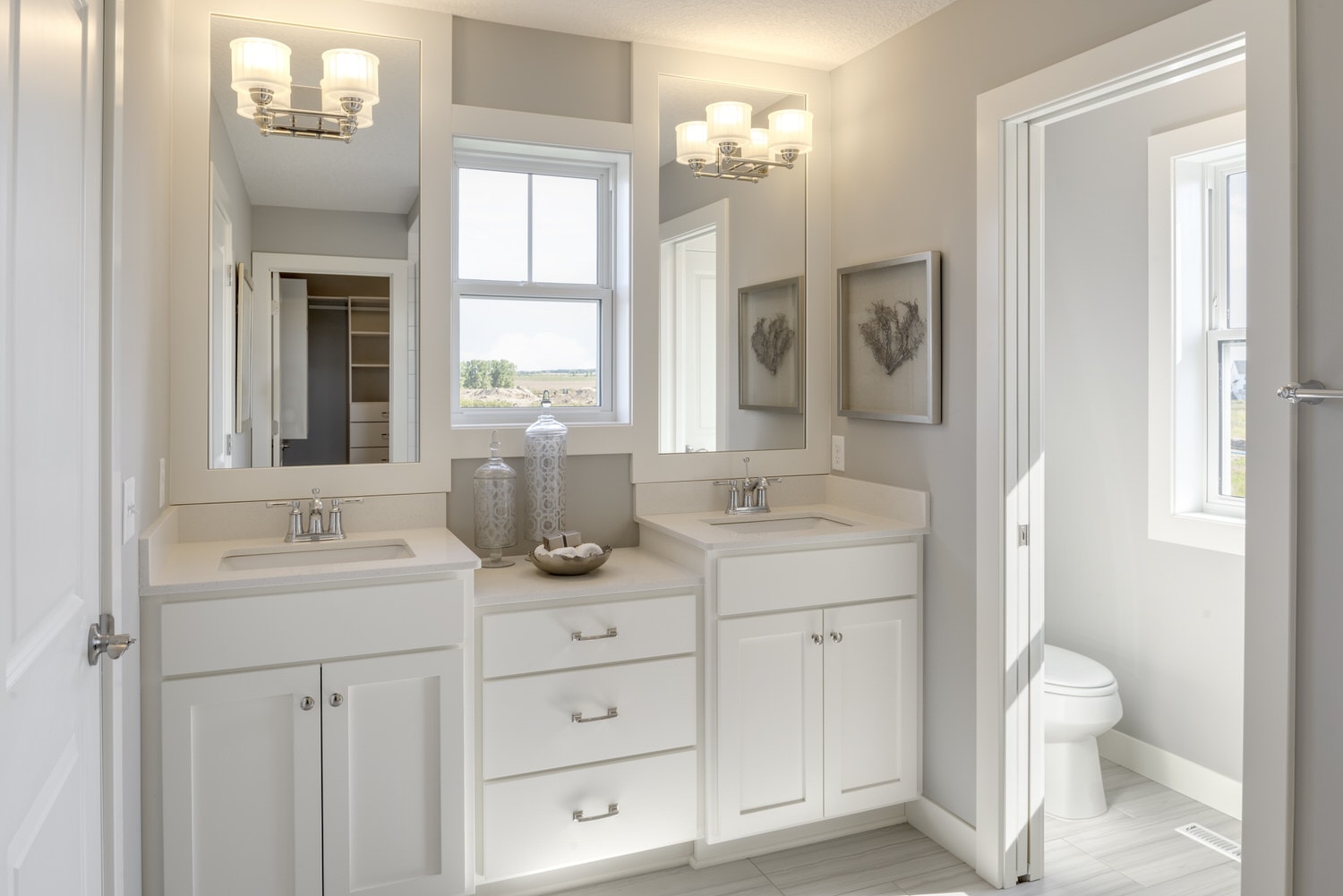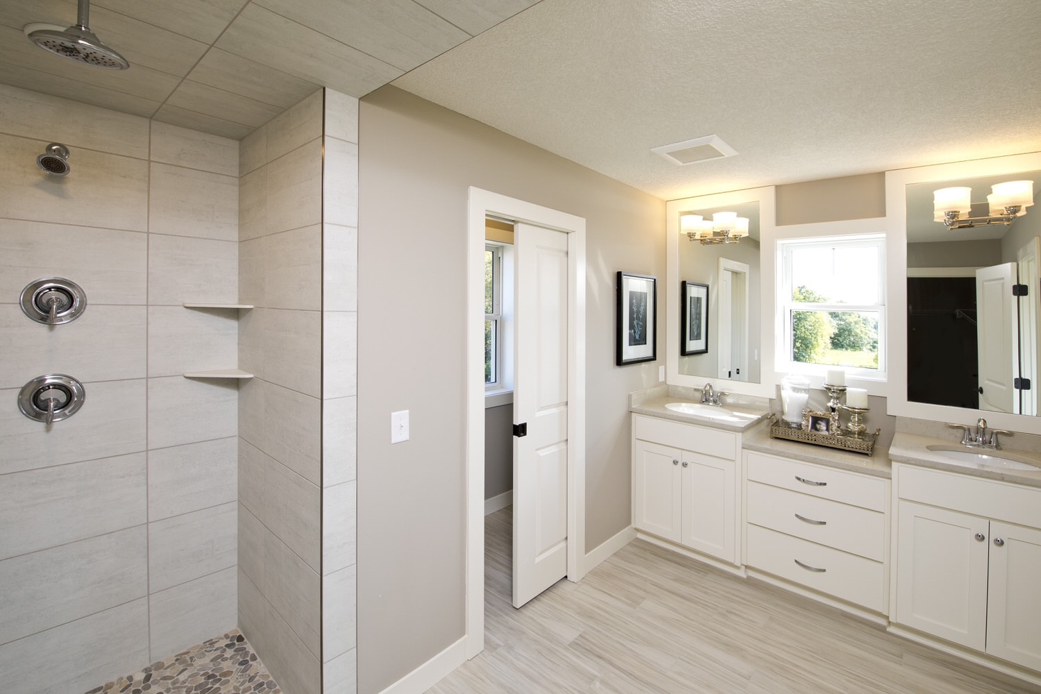 - Owner’s suite features optional raised ceiling and spa bath with double sinks, glass-panel shower, private water closet, and large walk-in closet