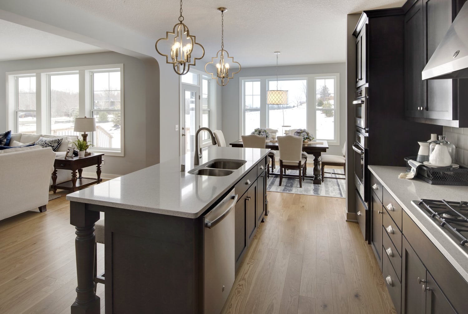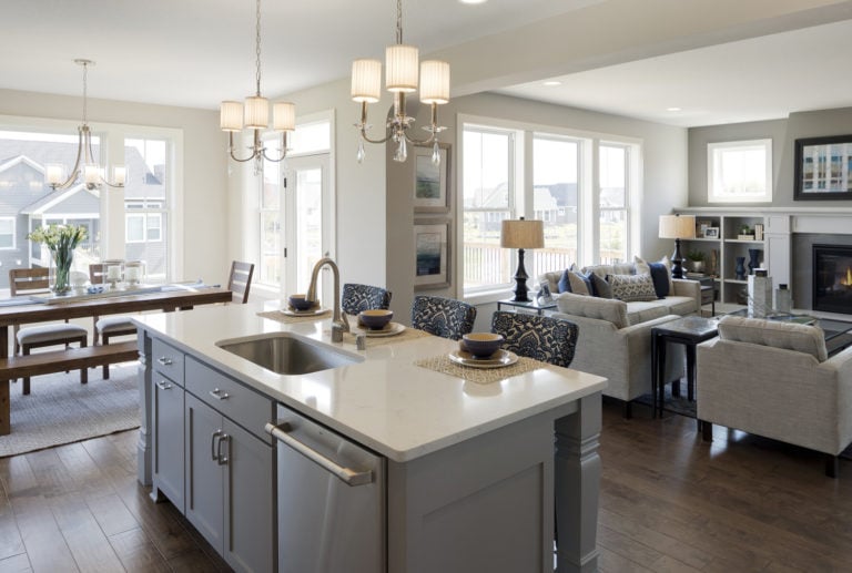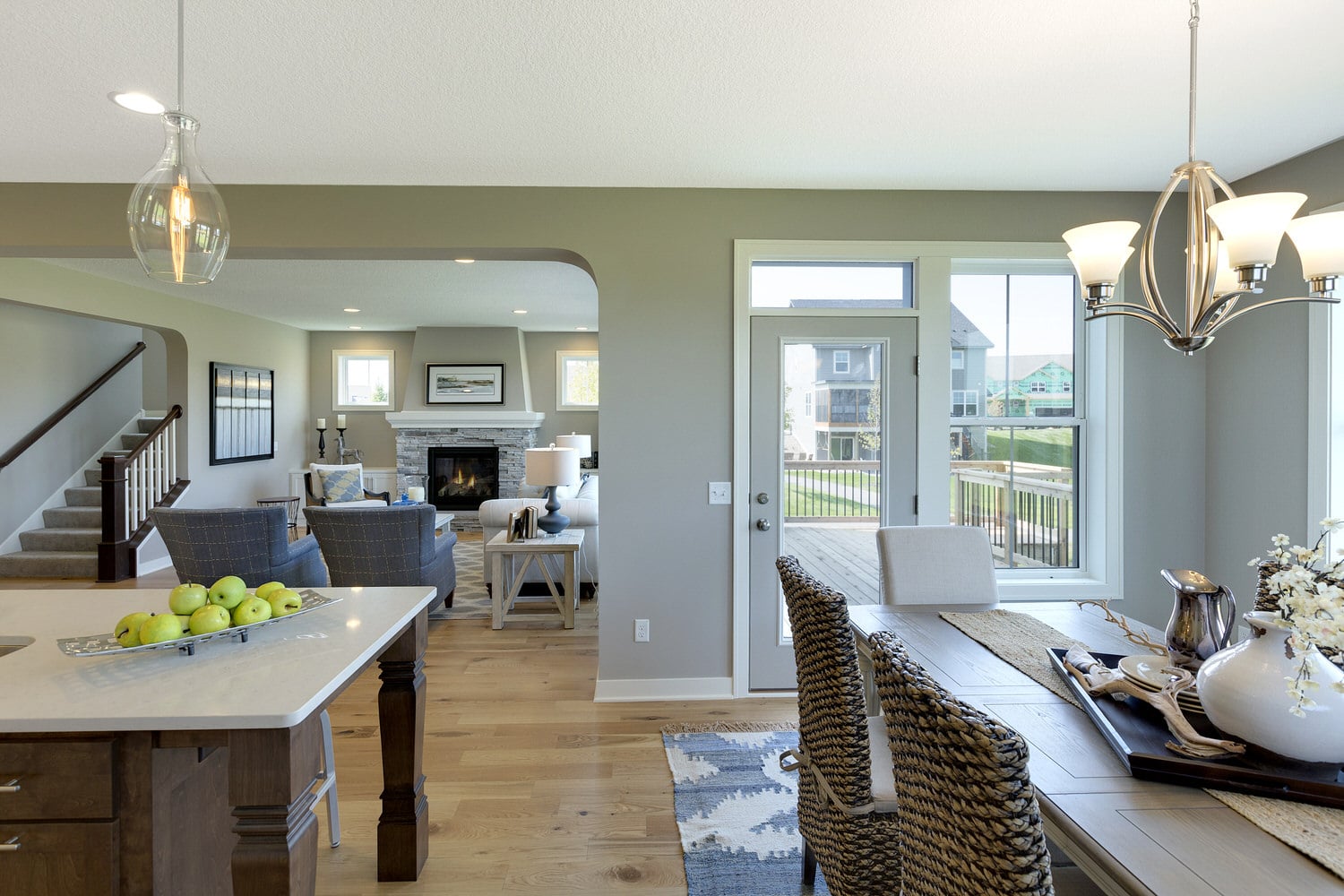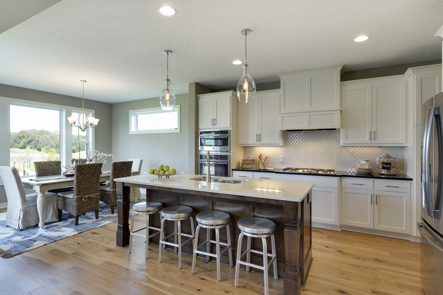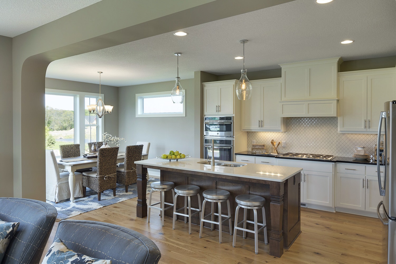- Open L-shaped kitchen with center island and adjacent dining with access to optional deck, patio or screen porch