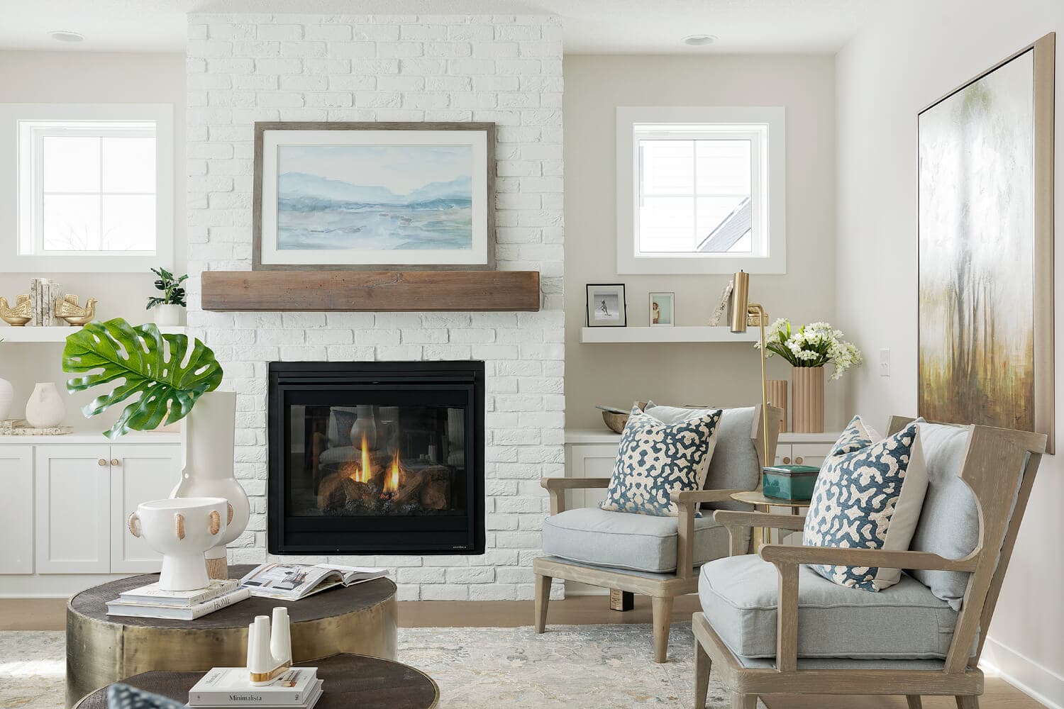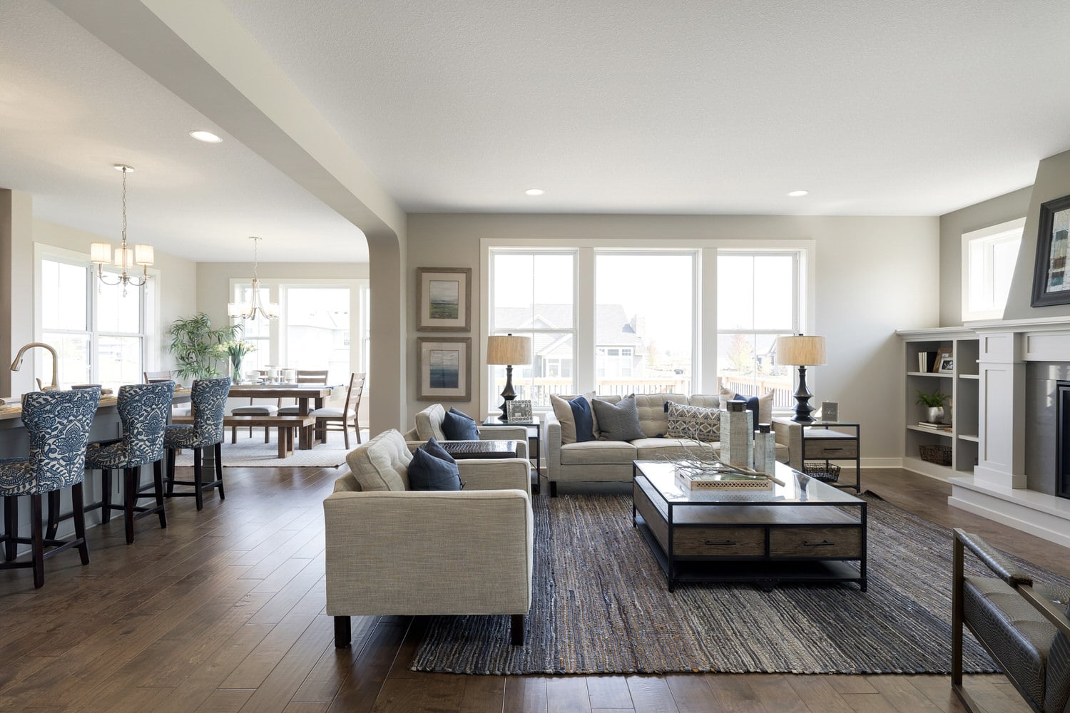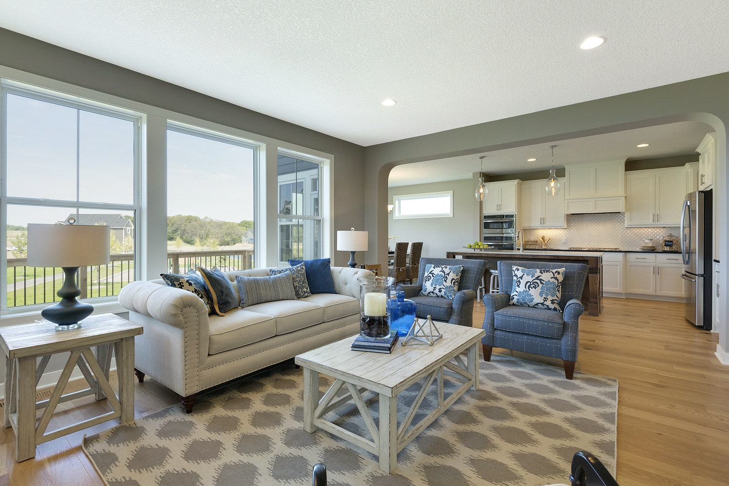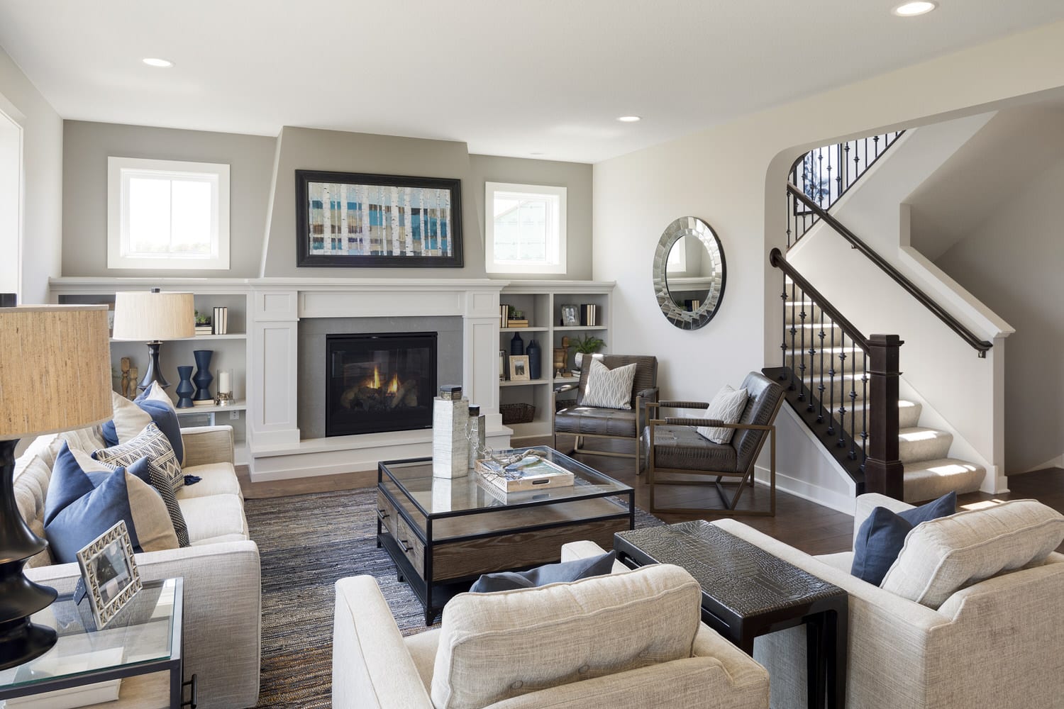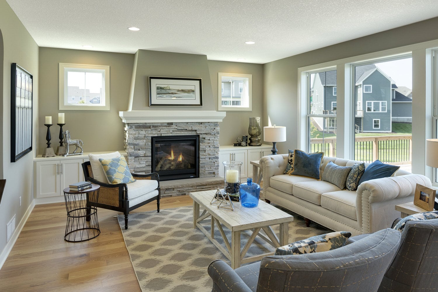 - Gathering room features wall of windows and fireplace flanked by optional built-ins