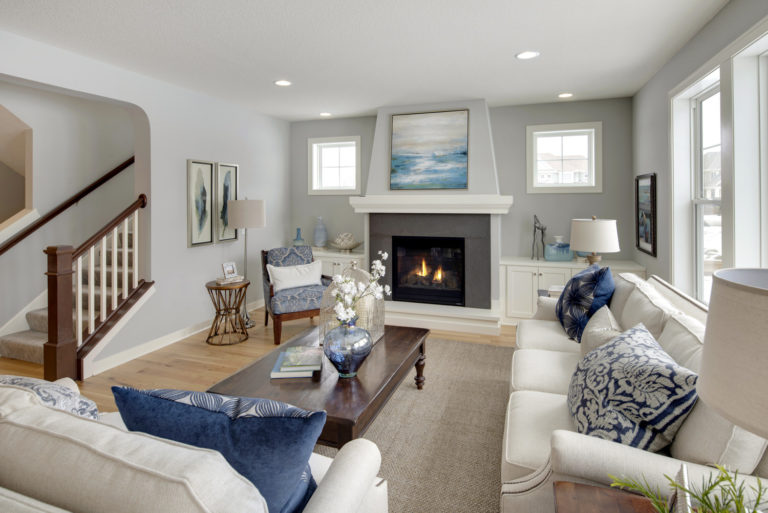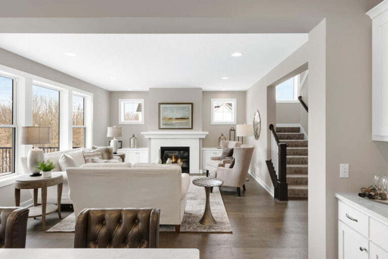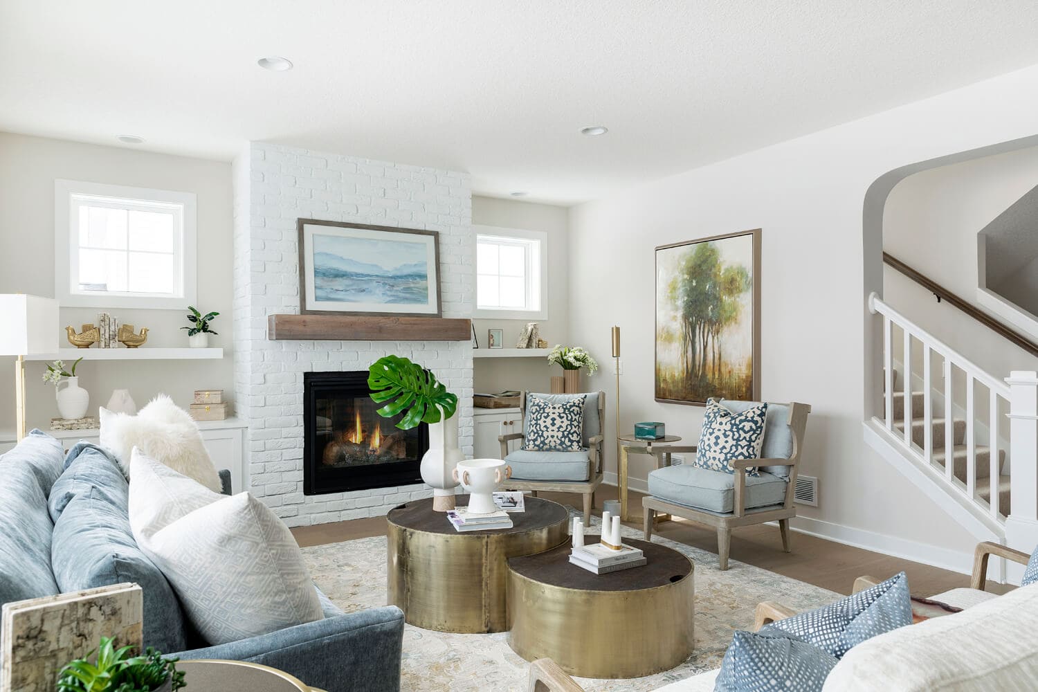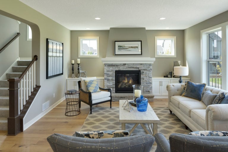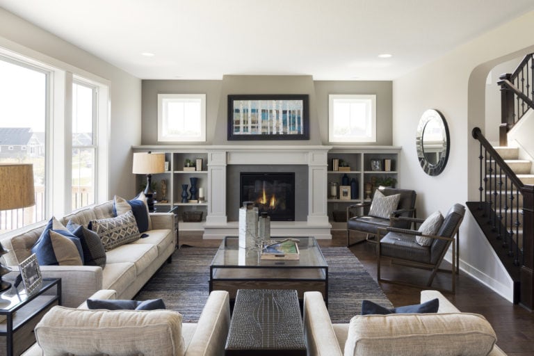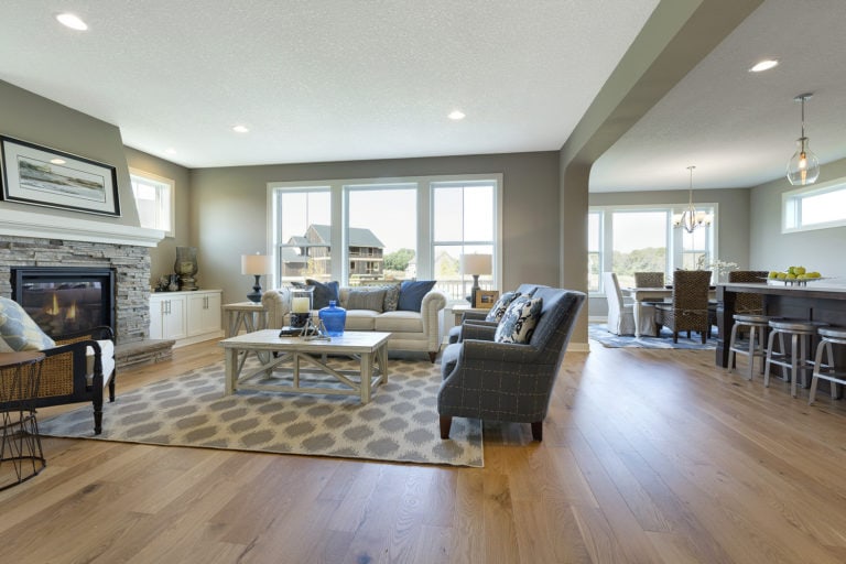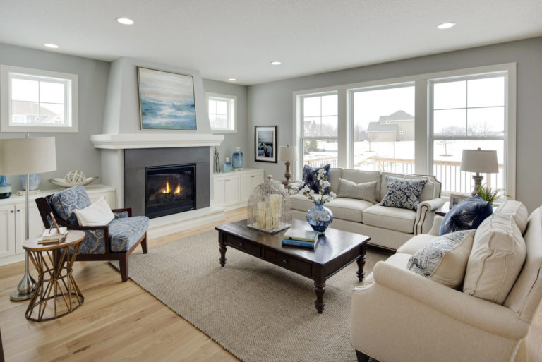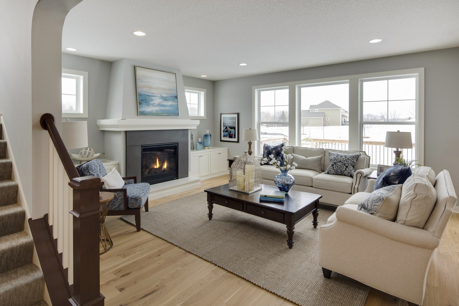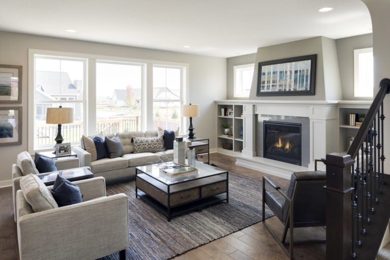 - Gathering room features wall of windows and fireplace flanked by optional built-ins