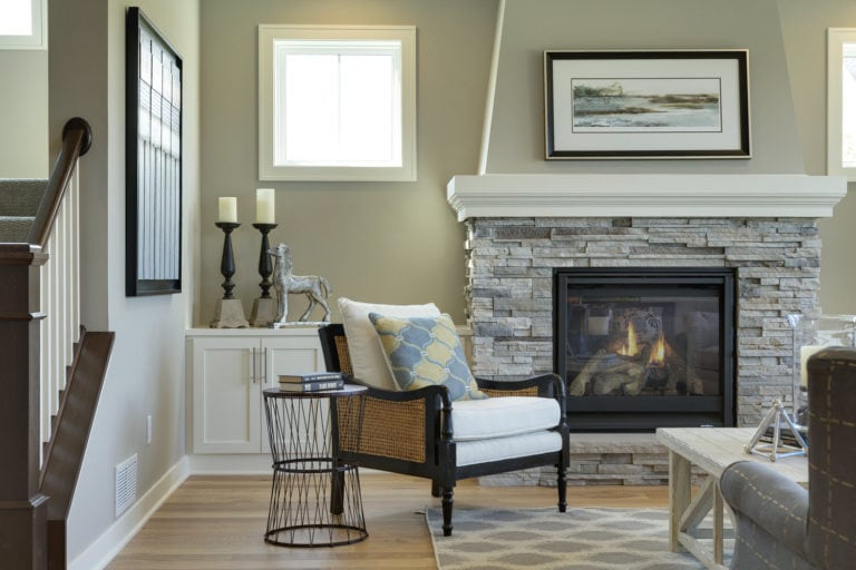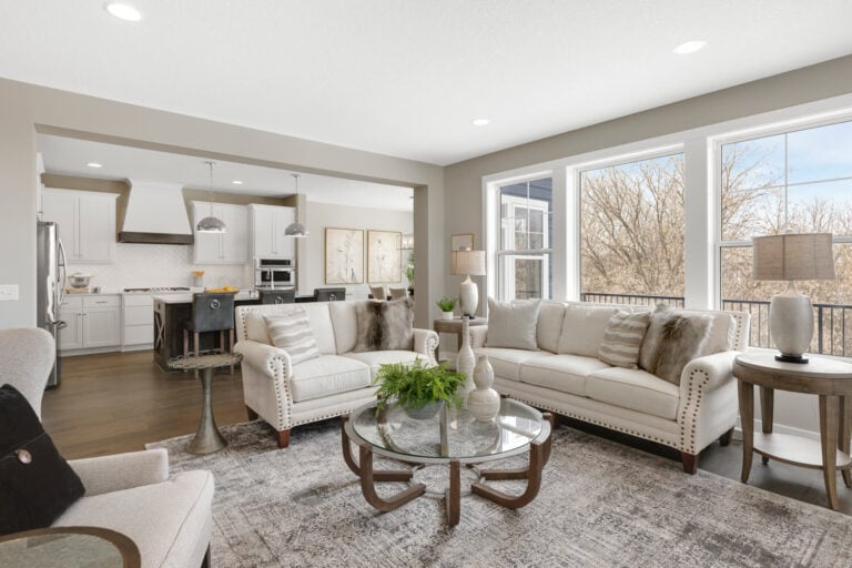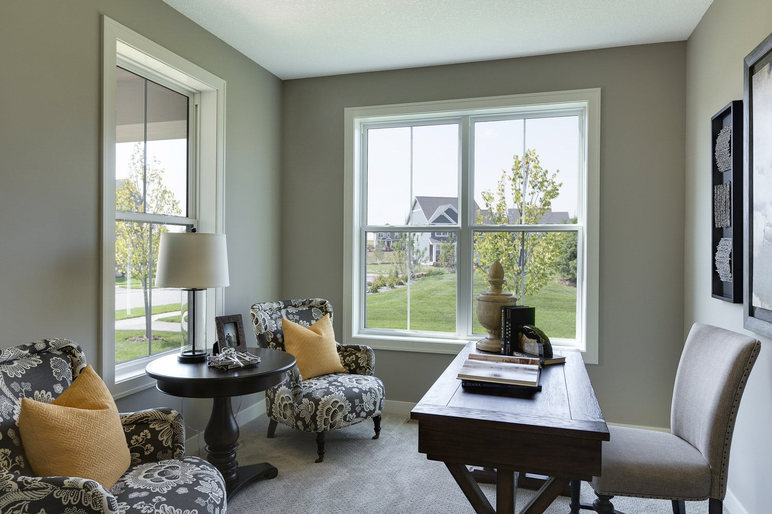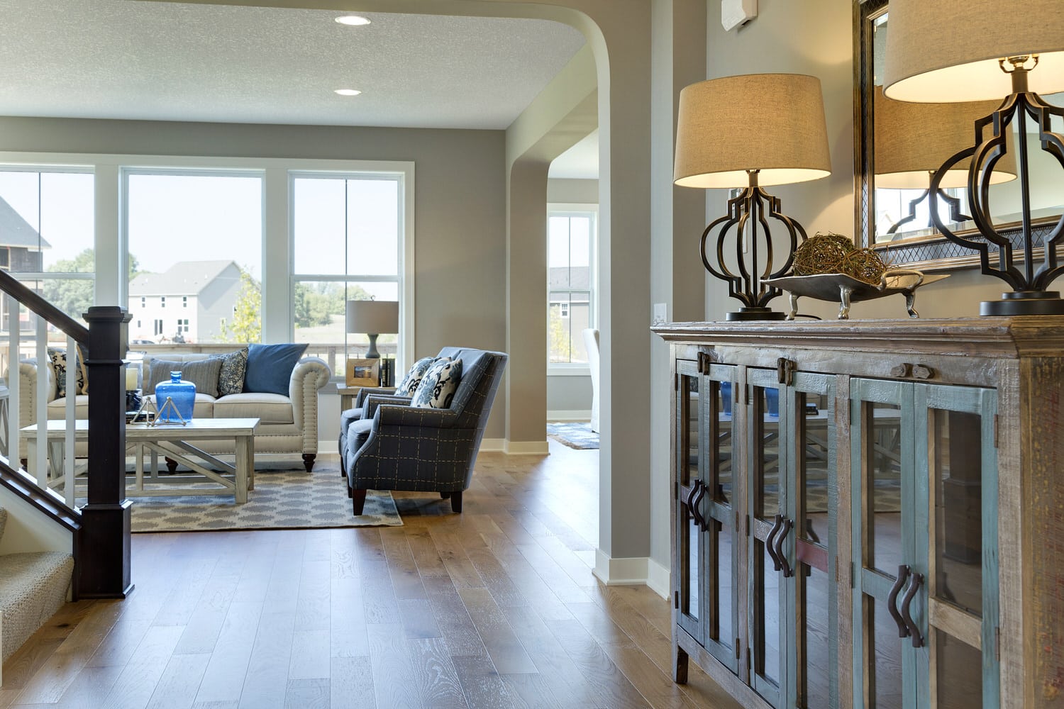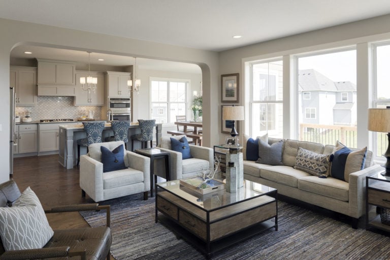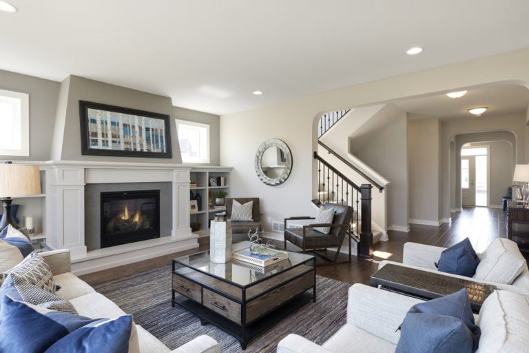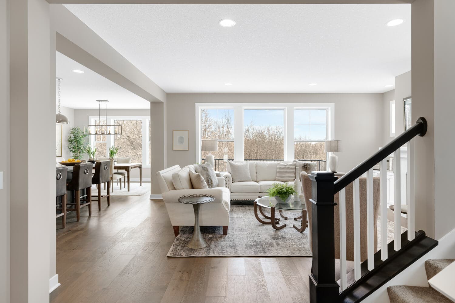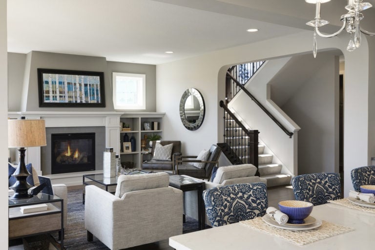 - Gathering room features wall of windows and fireplace flanked by optional built-ins