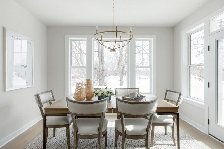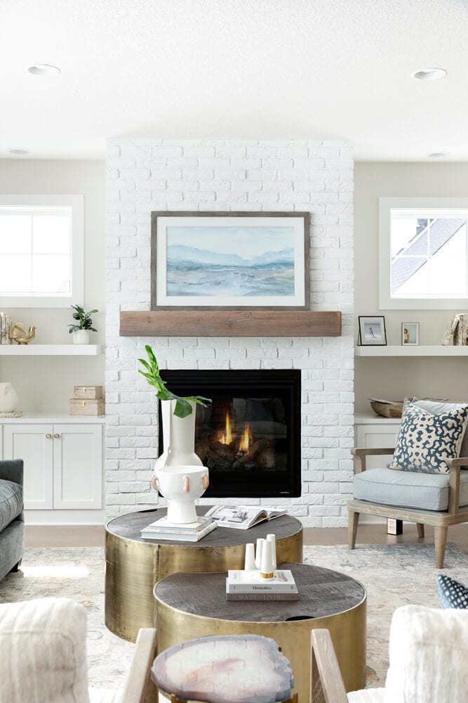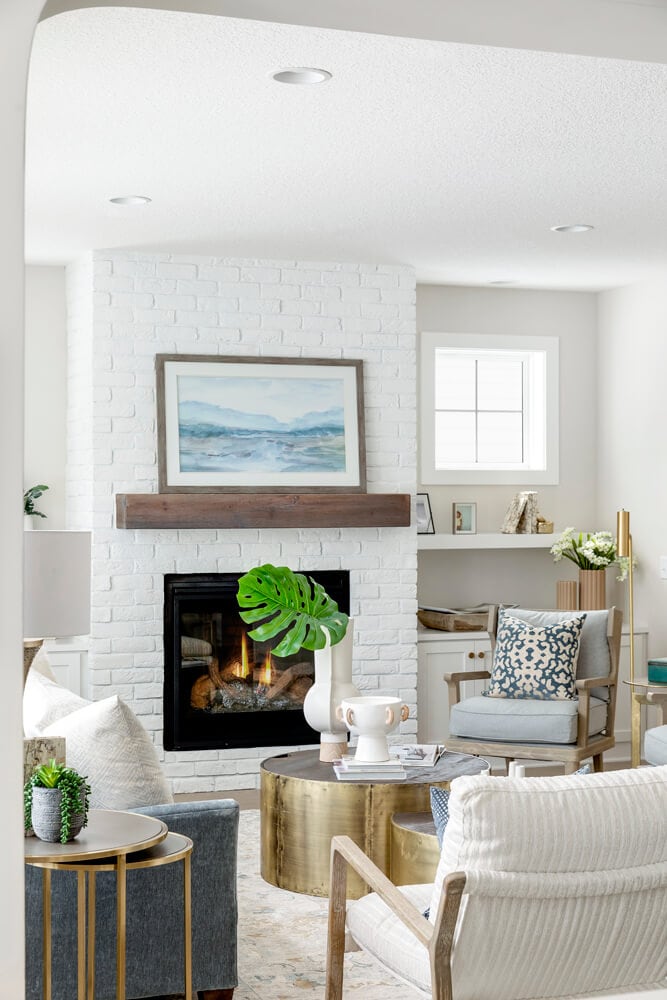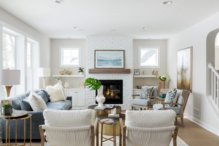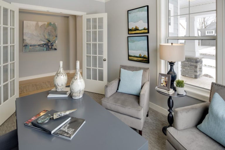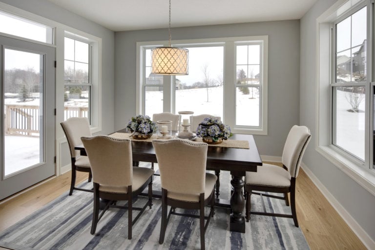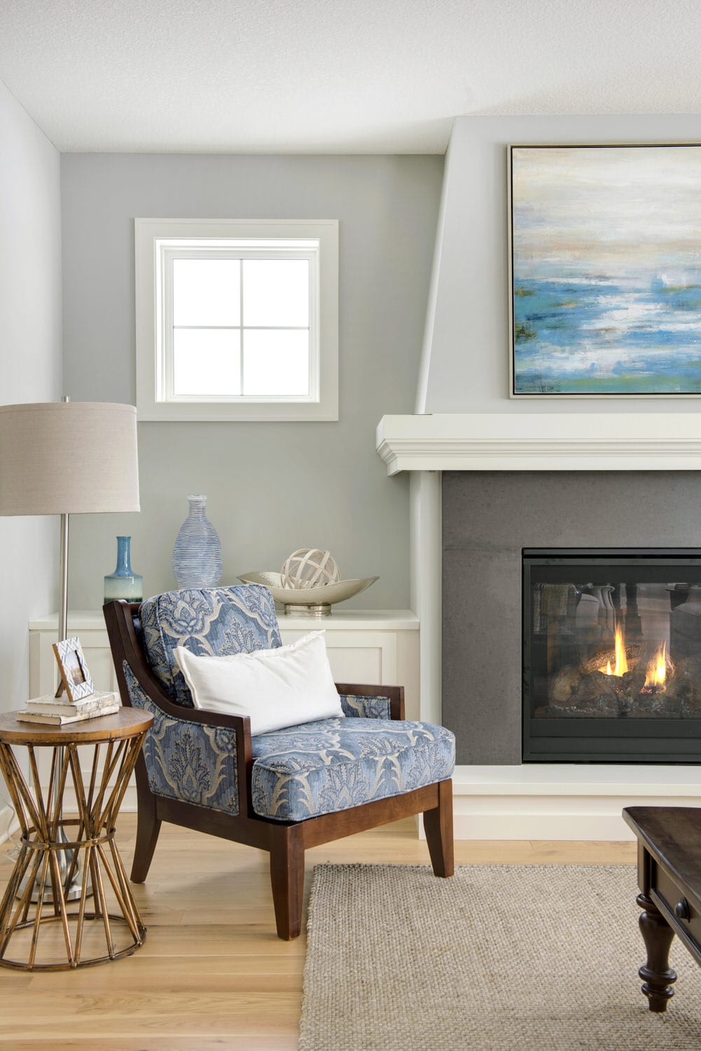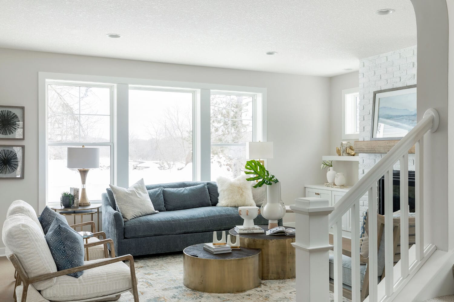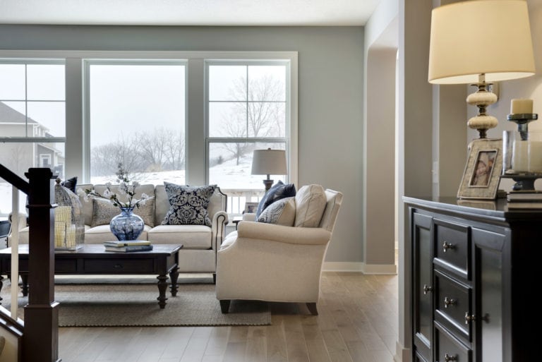 - Gathering room features wall of windows and fireplace flanked by optional built-ins