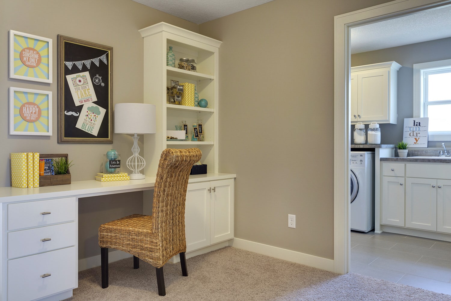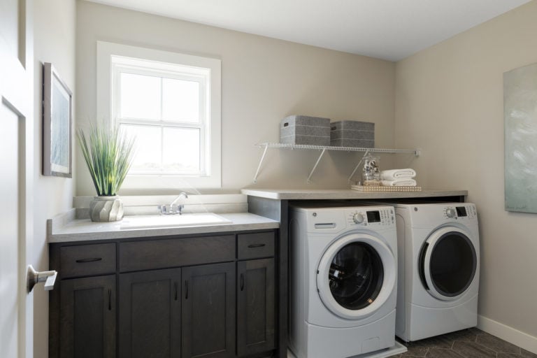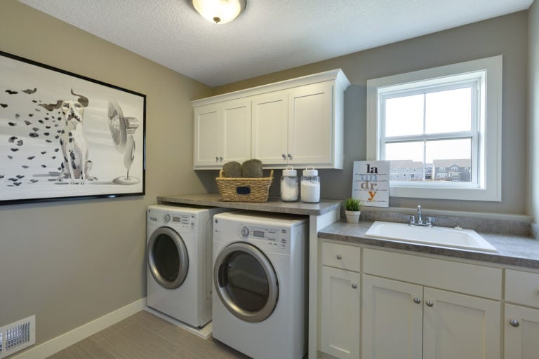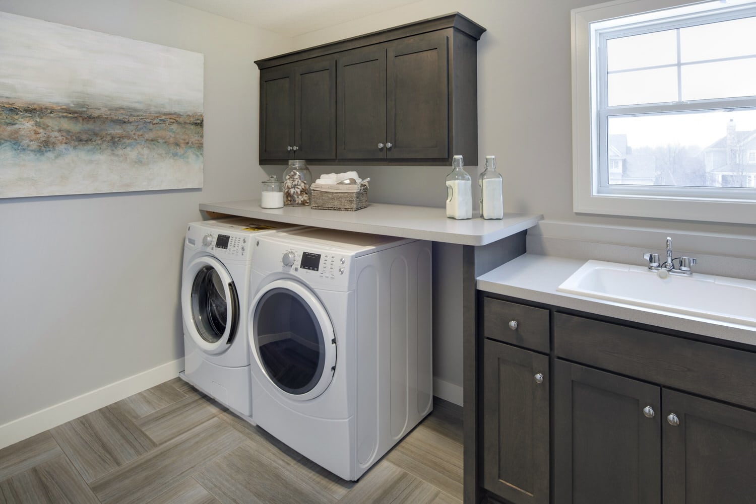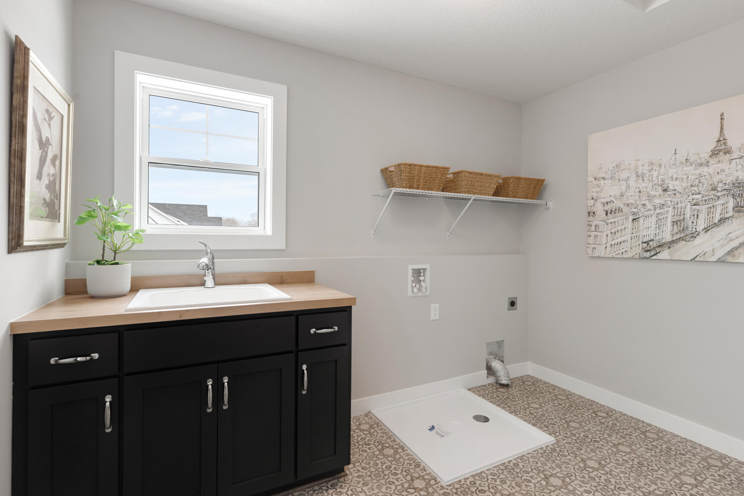 - Upper level laundry includes window and optional built-in cabinetry, folding counter and sink