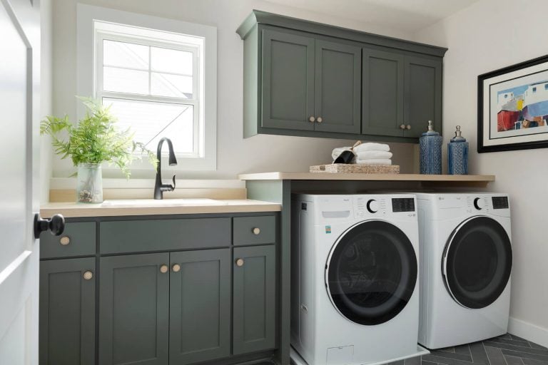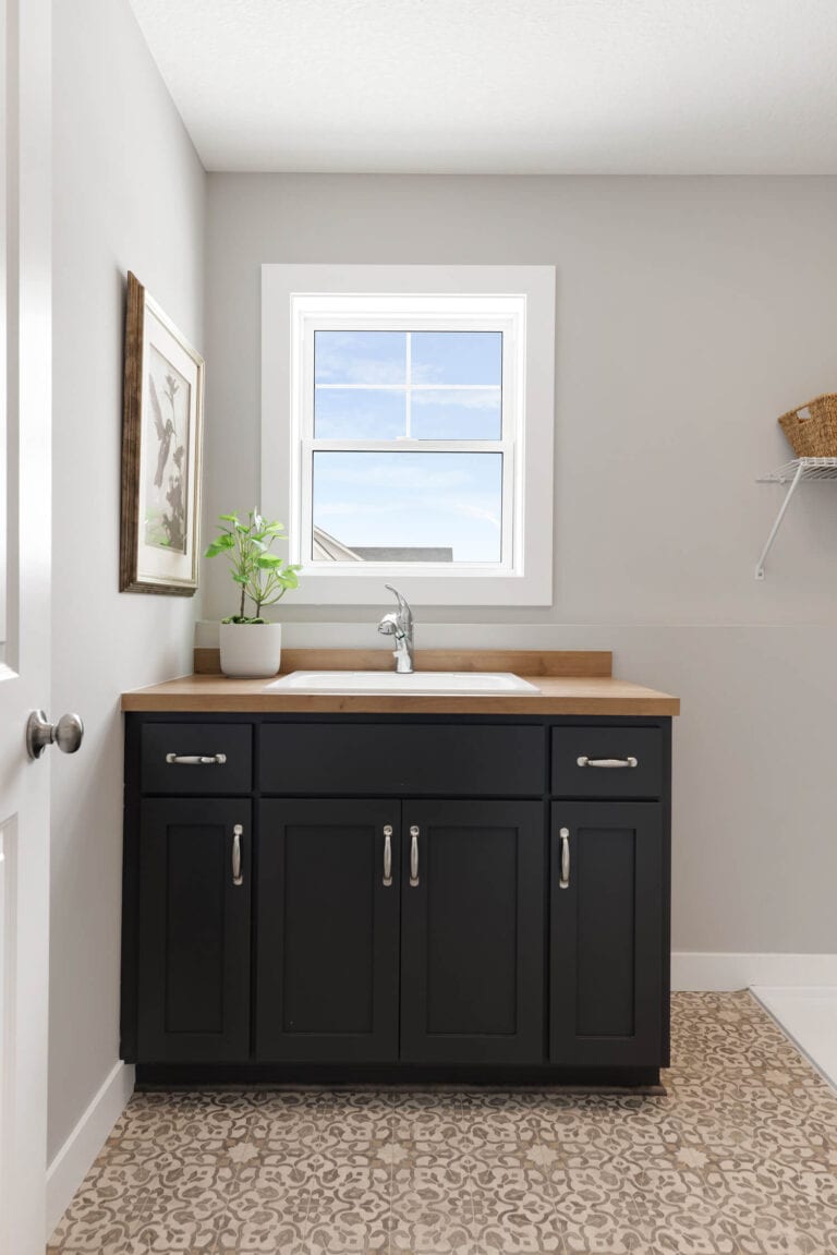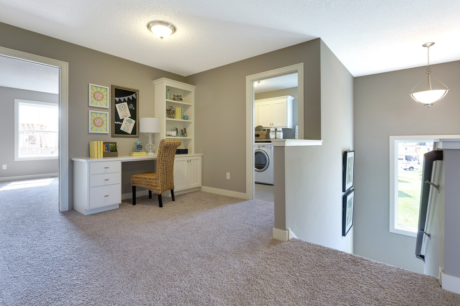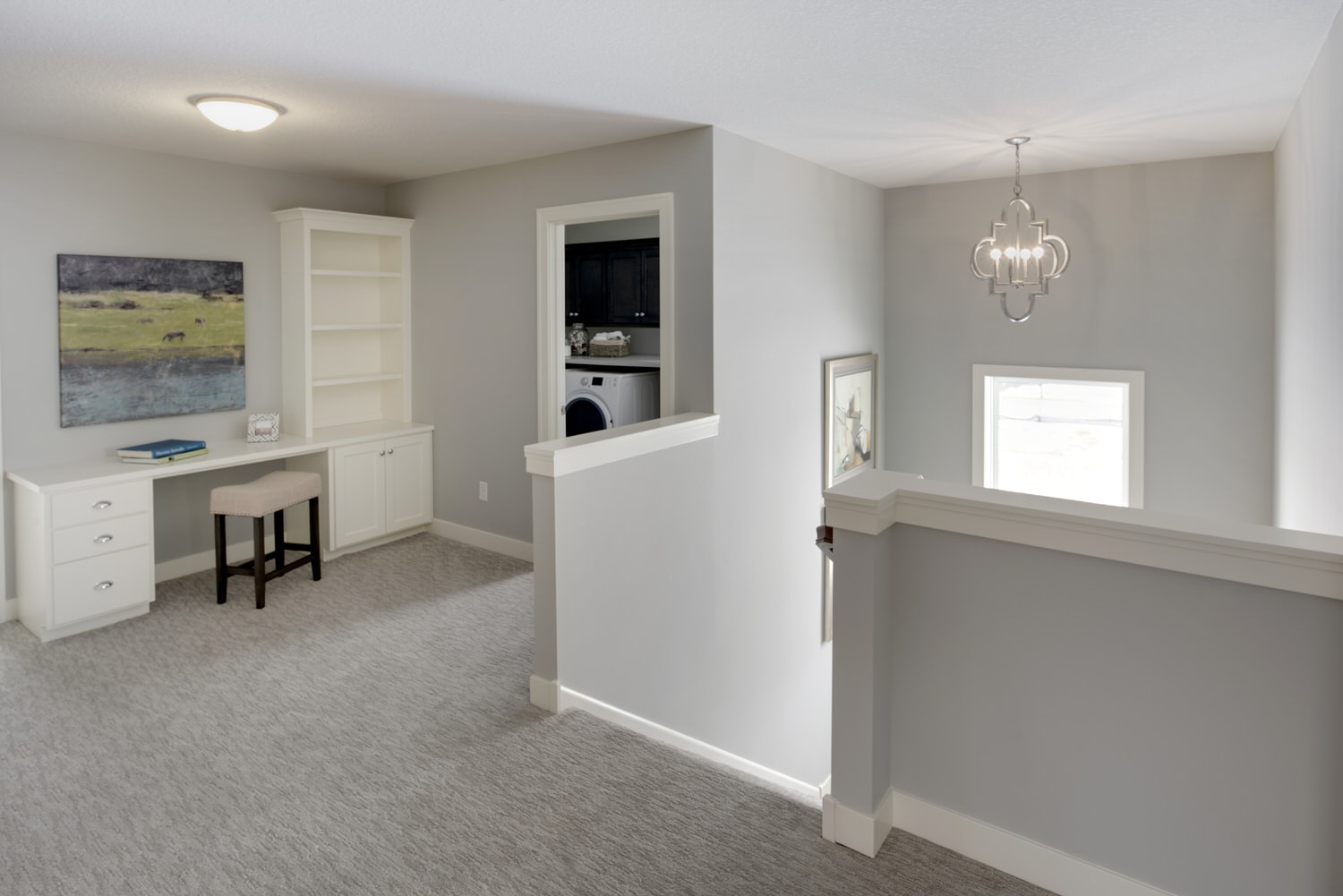 - Upper level laundry includes window and optional built-in cabinetry, folding counter and sink