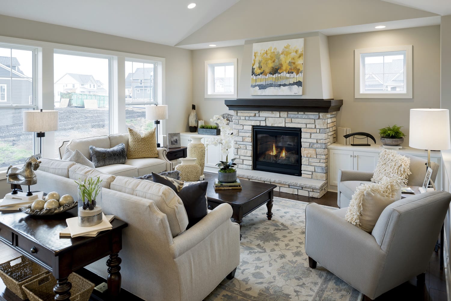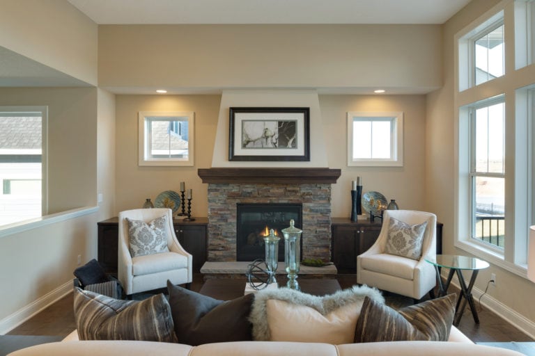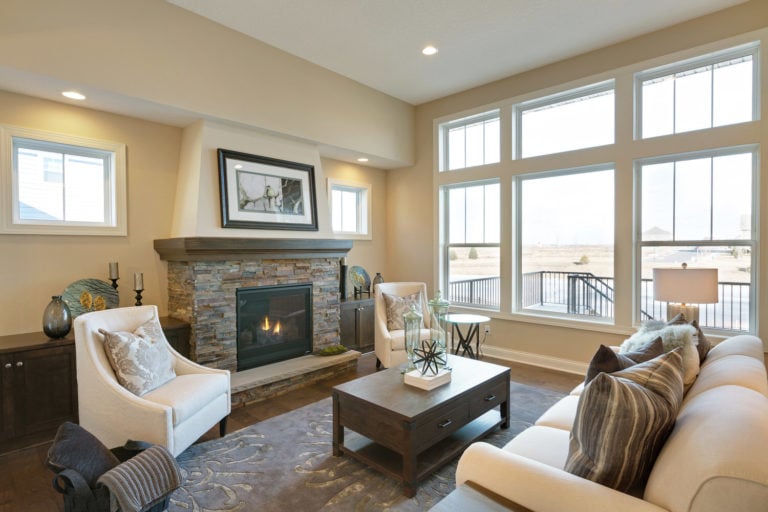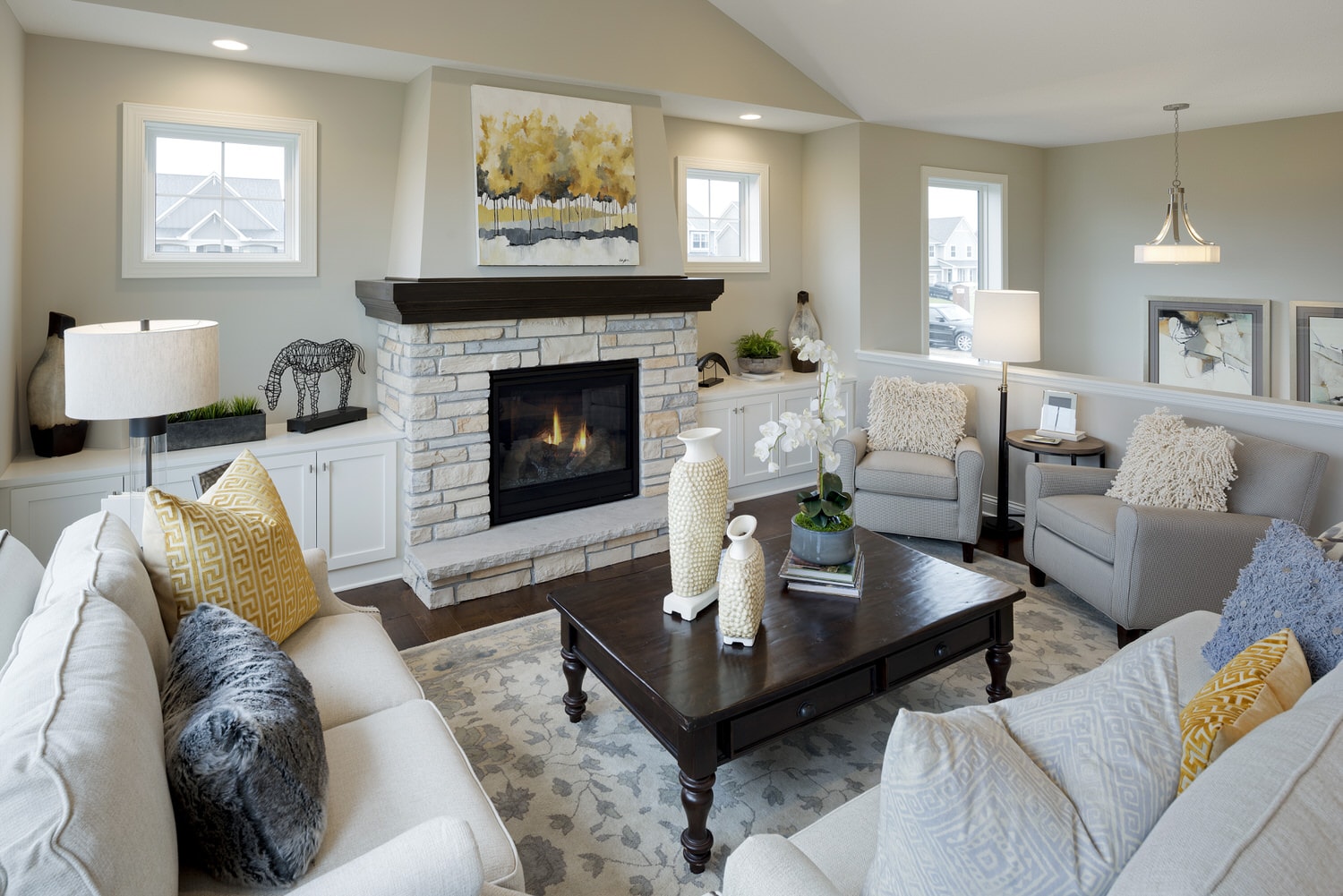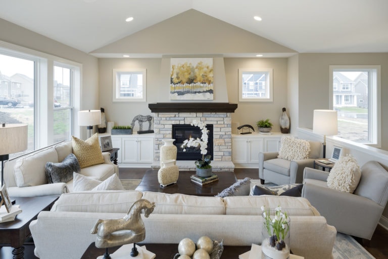 - Vaulted gathering room with fireplace and optional built-in cabinetry