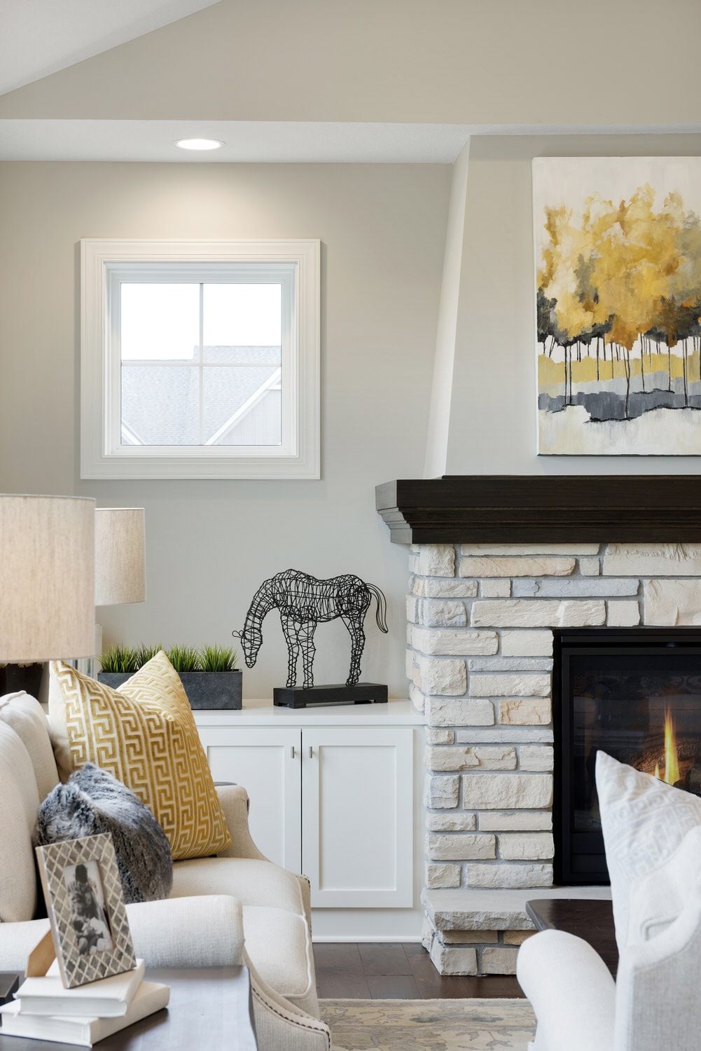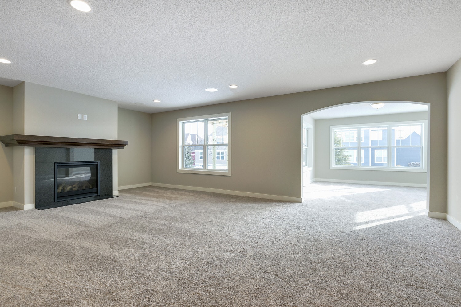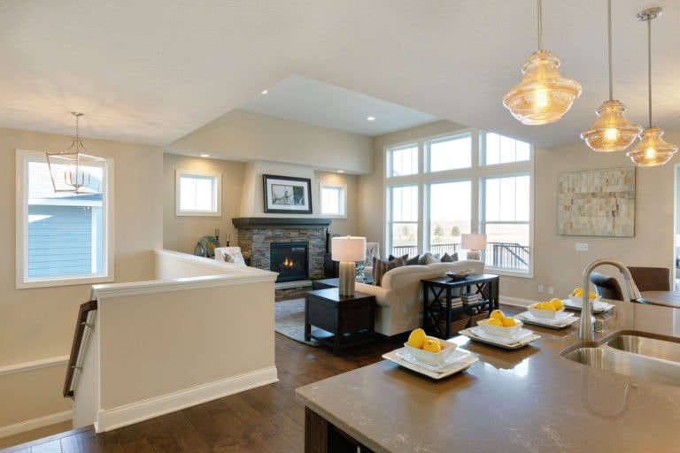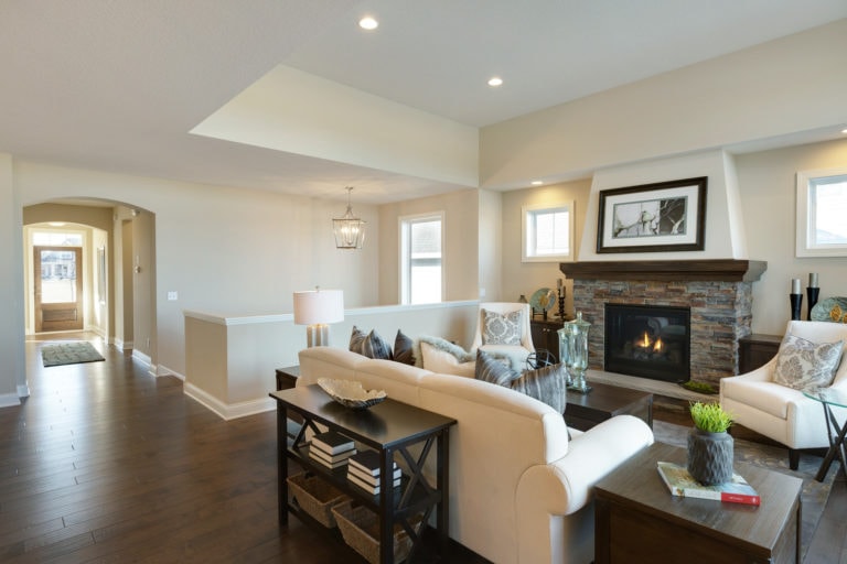 - Vaulted gathering room with fireplace and optional built-in cabinetry