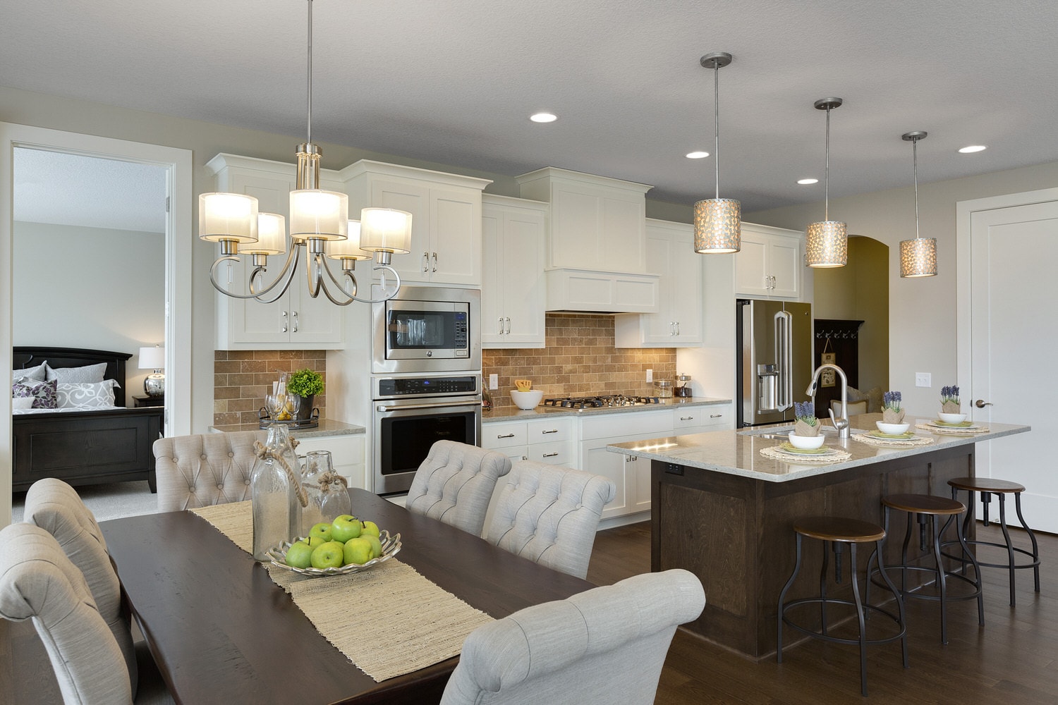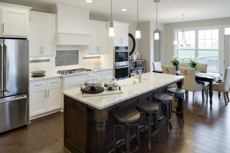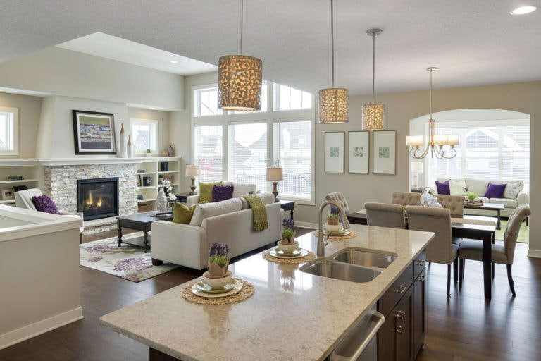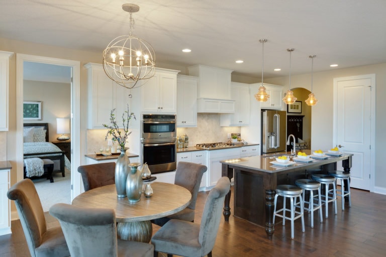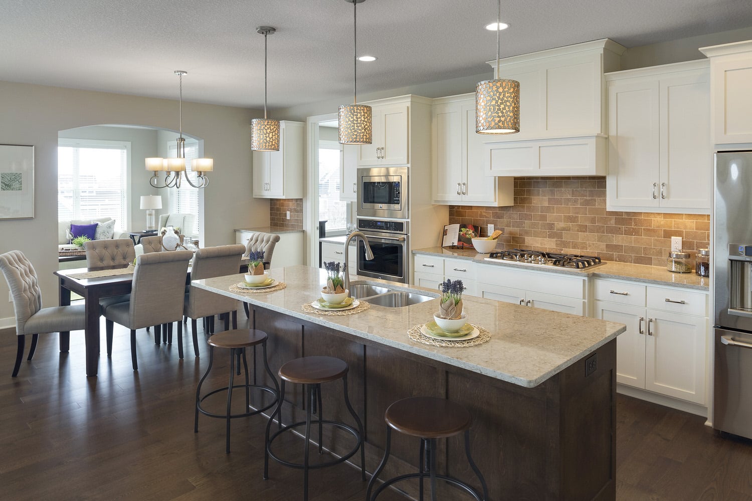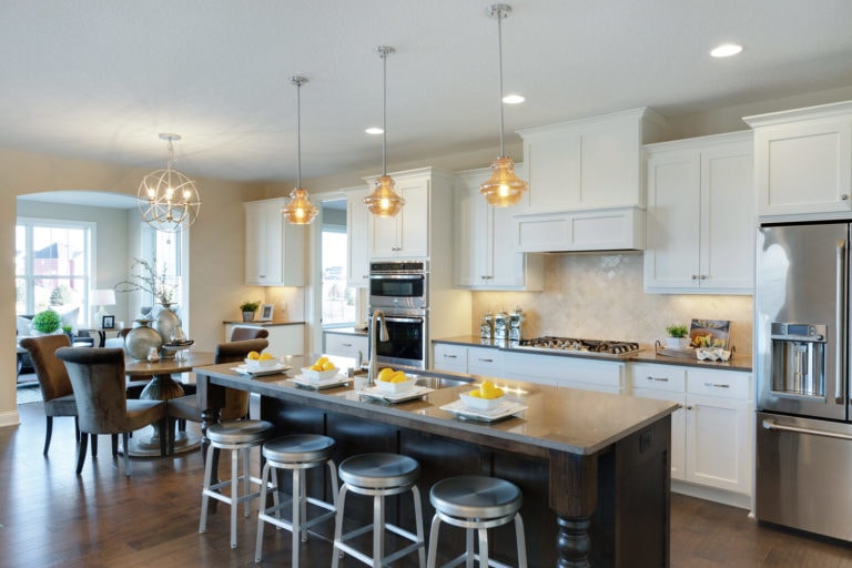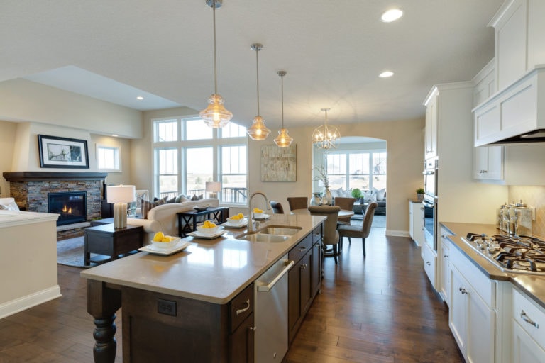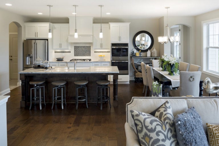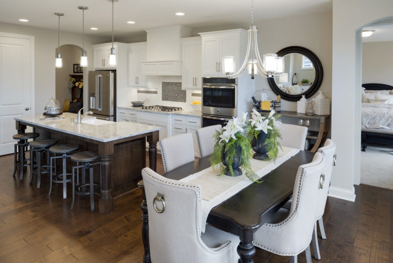 - Open concept center-island kitchen with adjacent dining