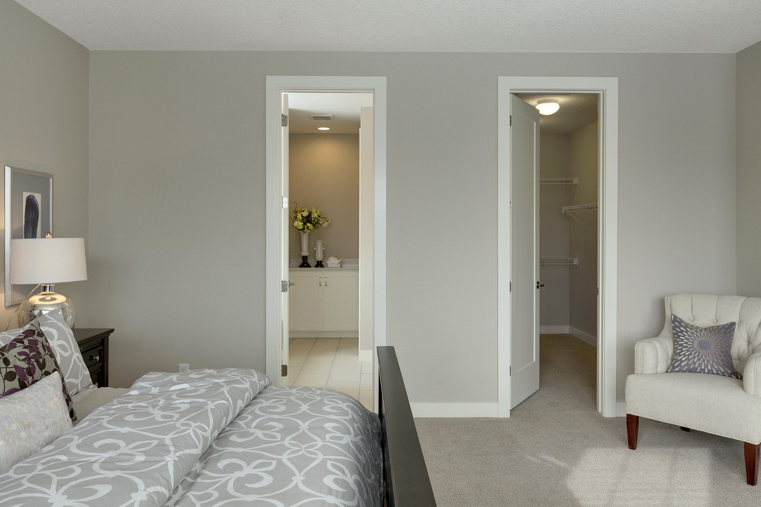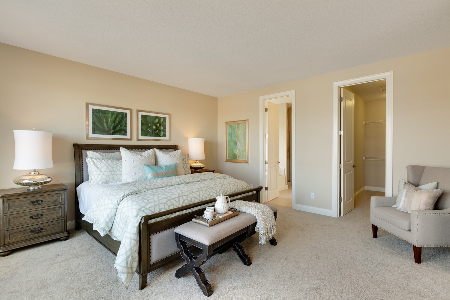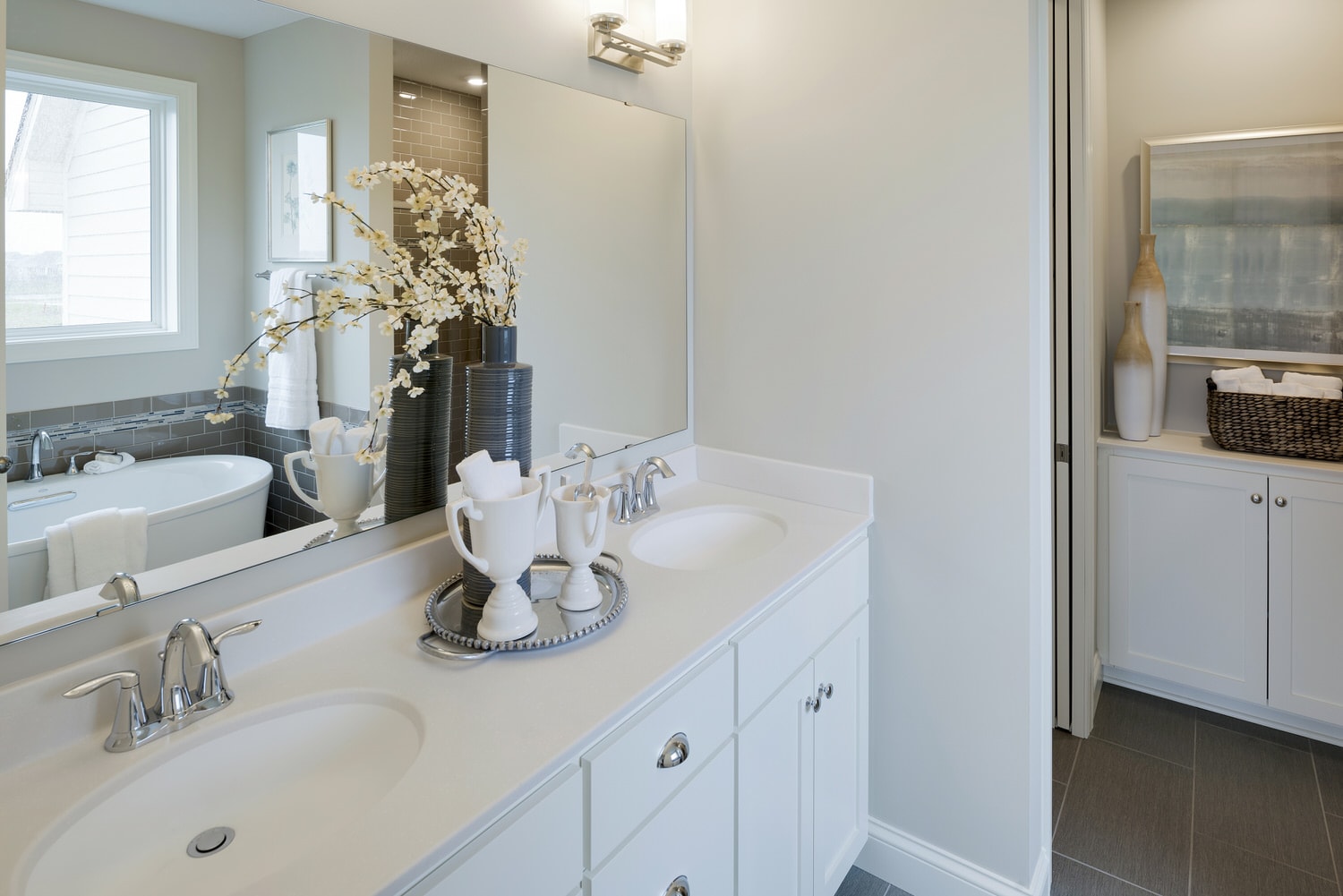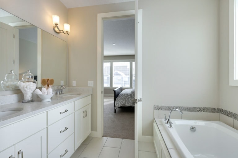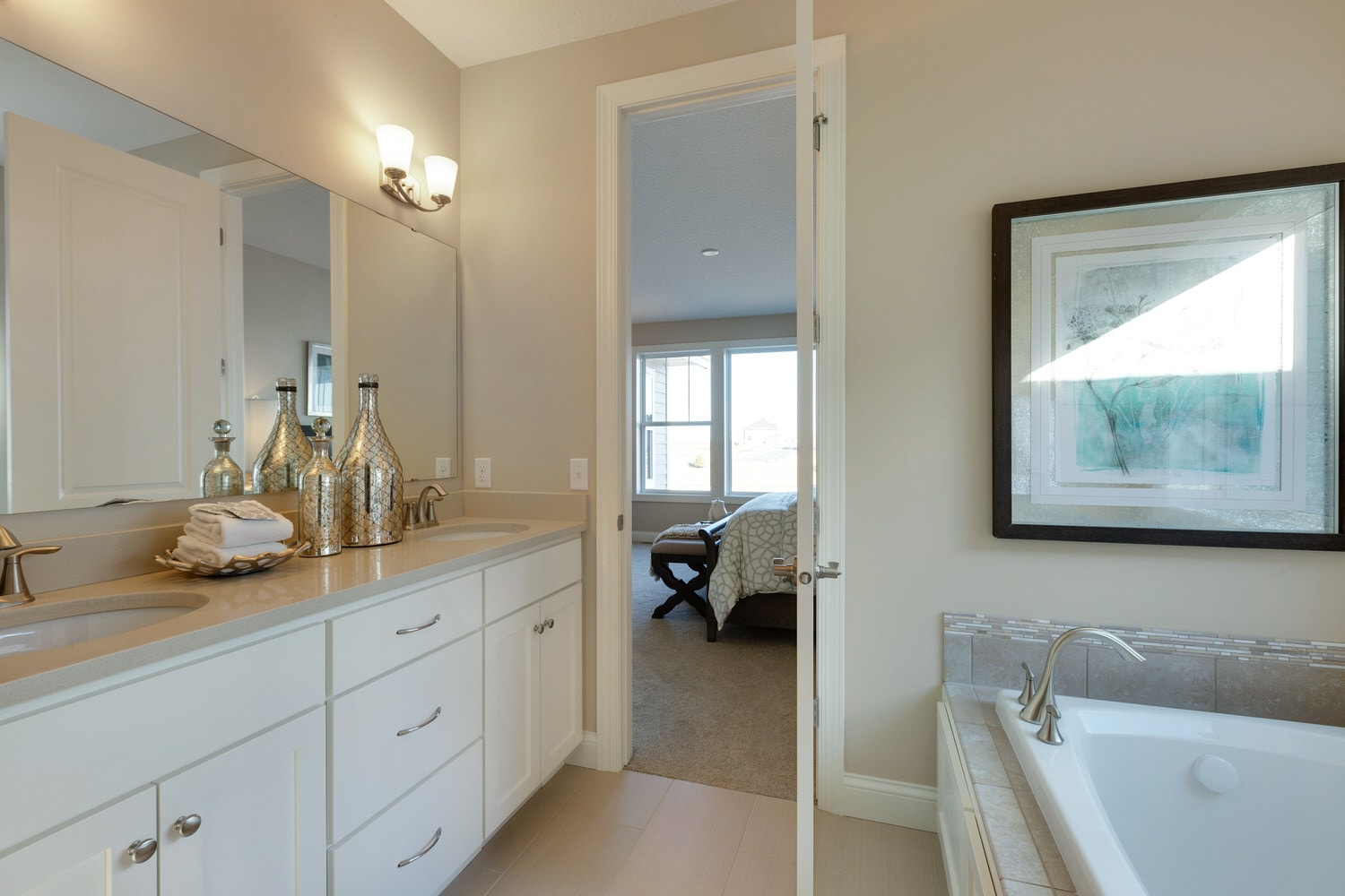 - Owner’s suite features, large walk in closet and spa bath with double vanities, soaking tub, ceramic tile shower, linen, and private water closet