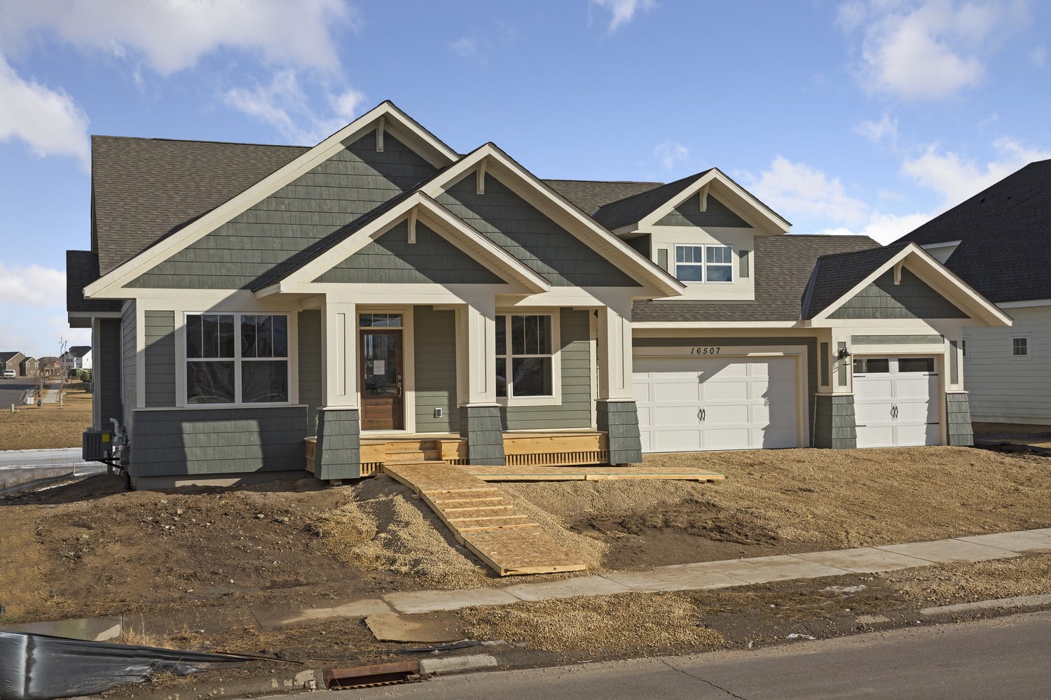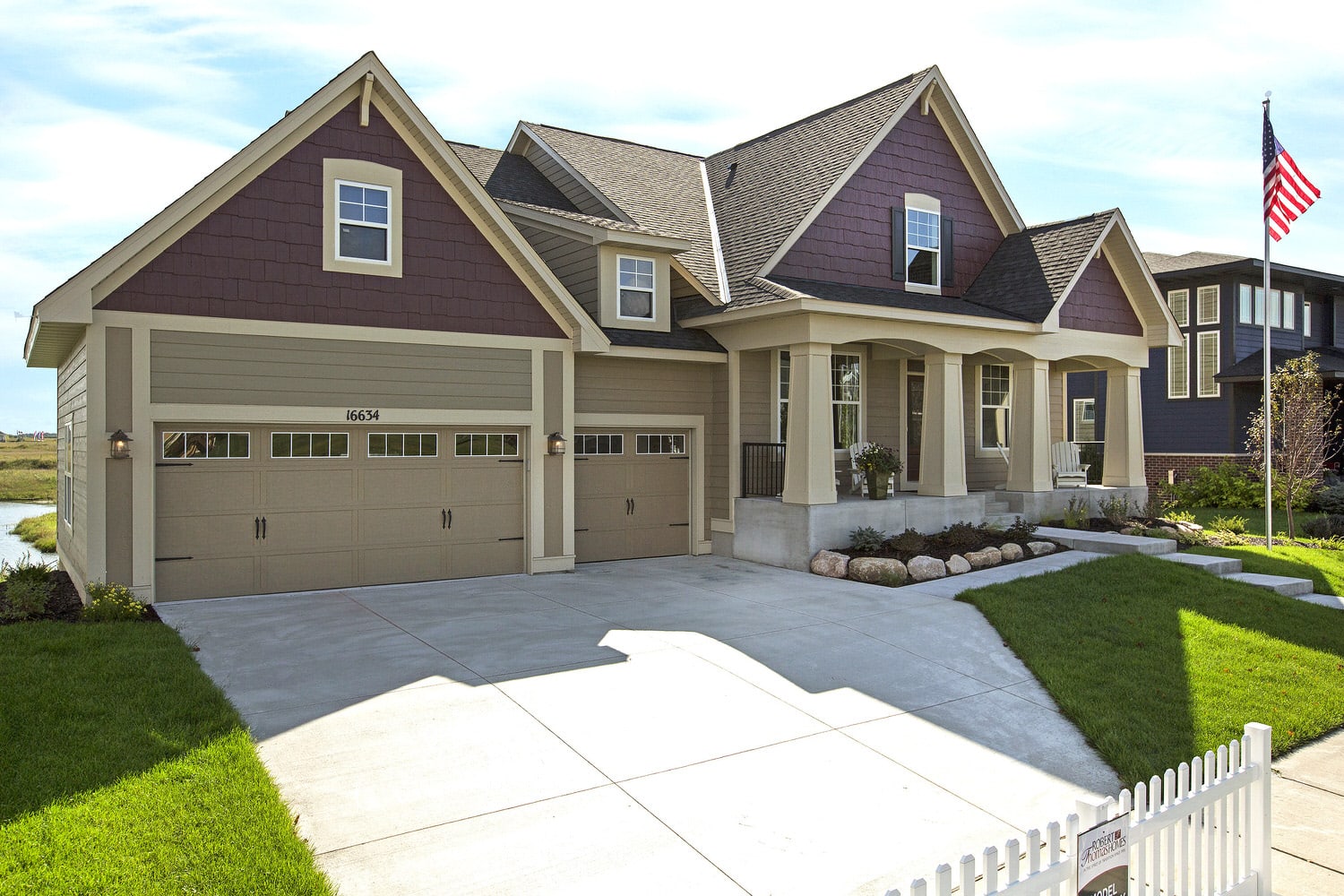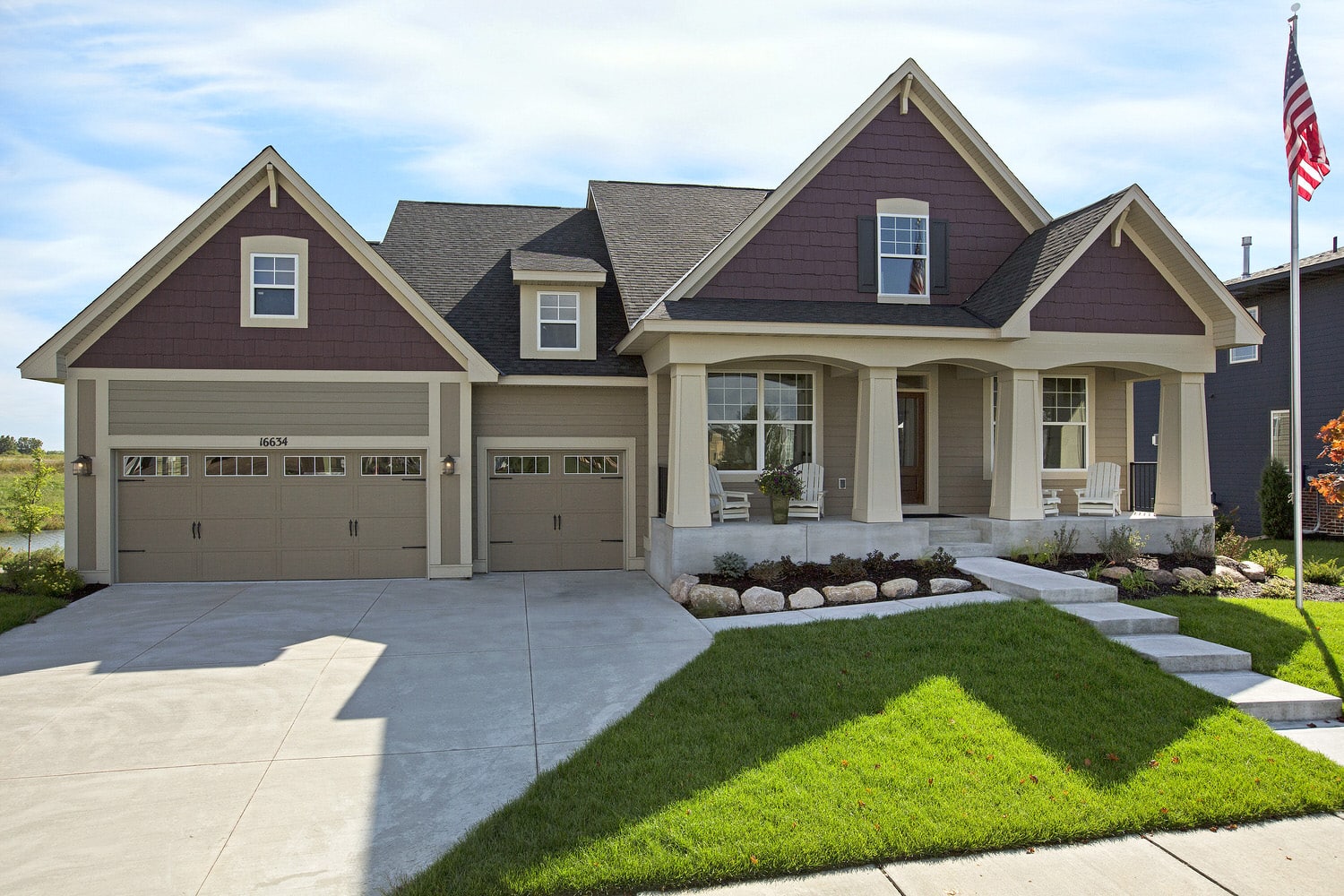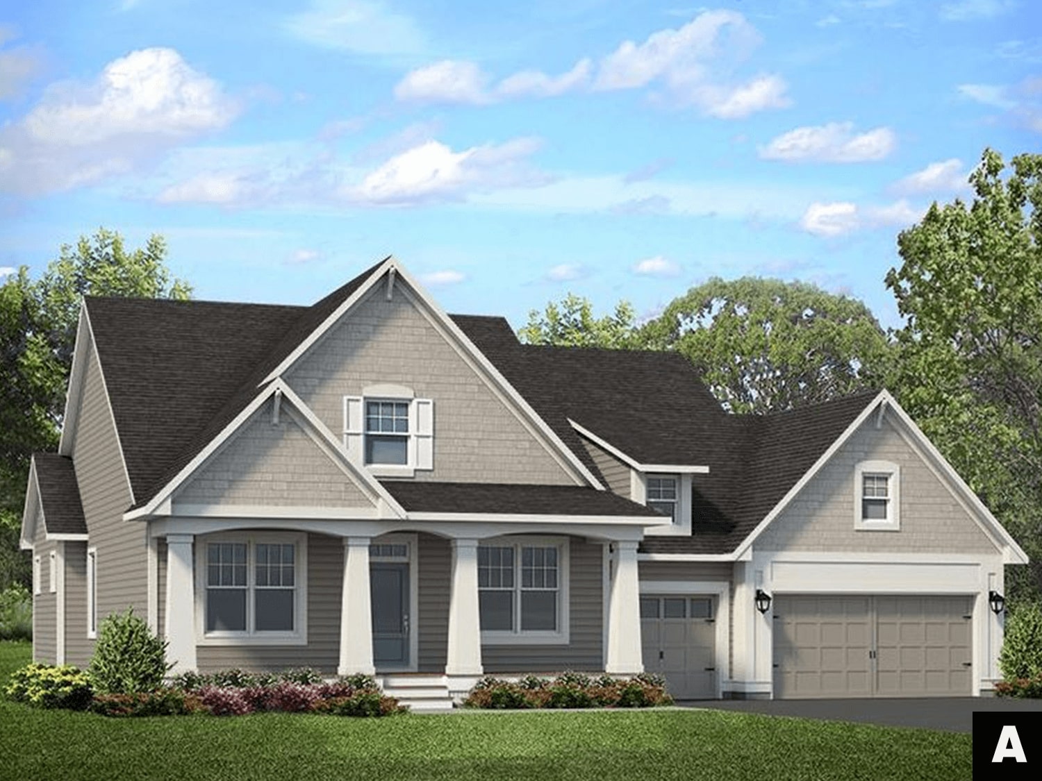 - Cottage inspired rambler features welcoming front porch with columns and main level owner’s suite