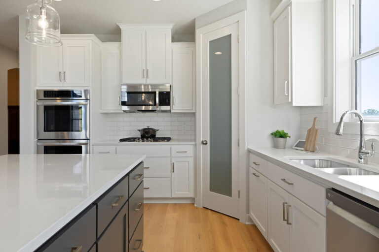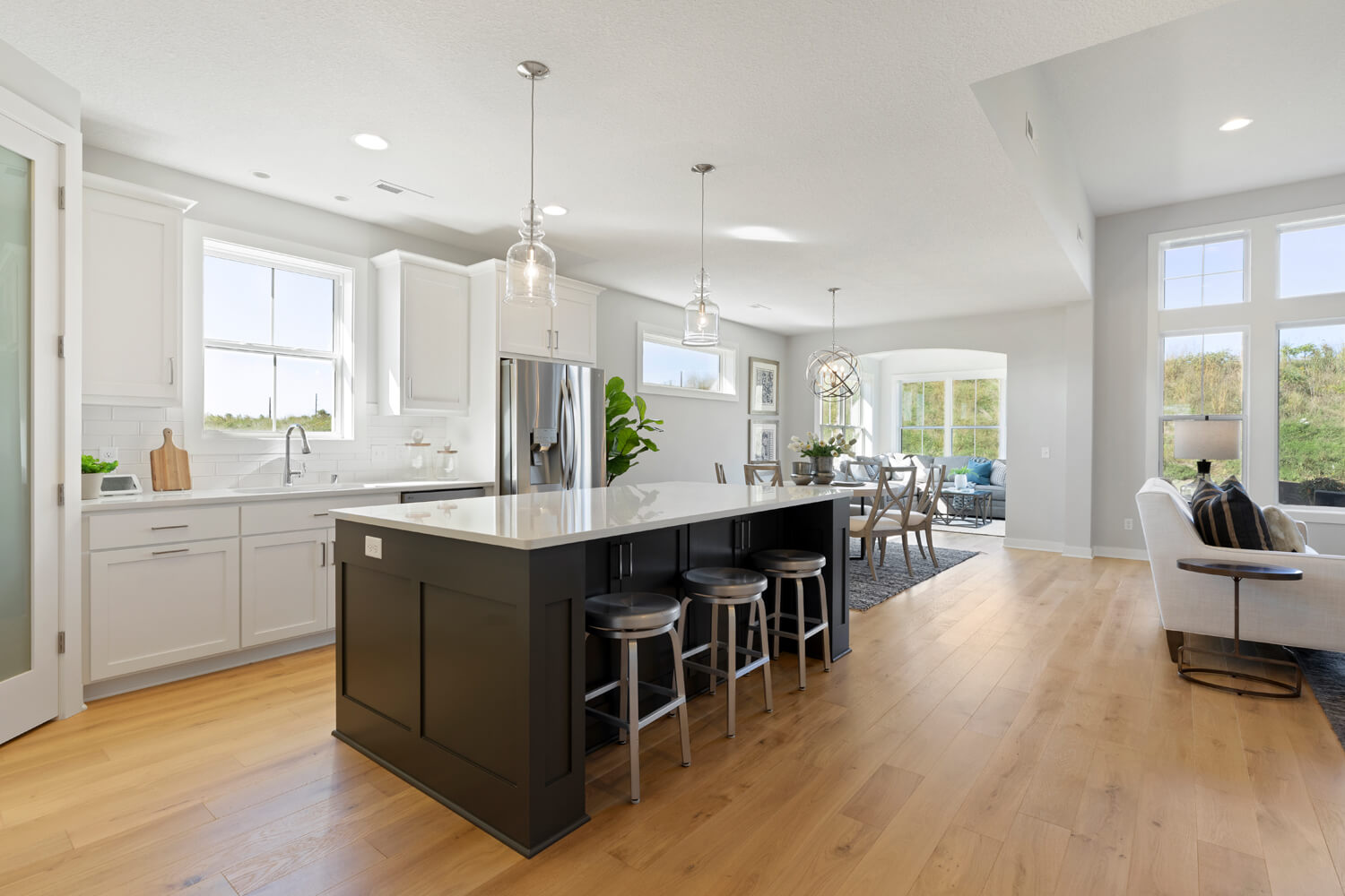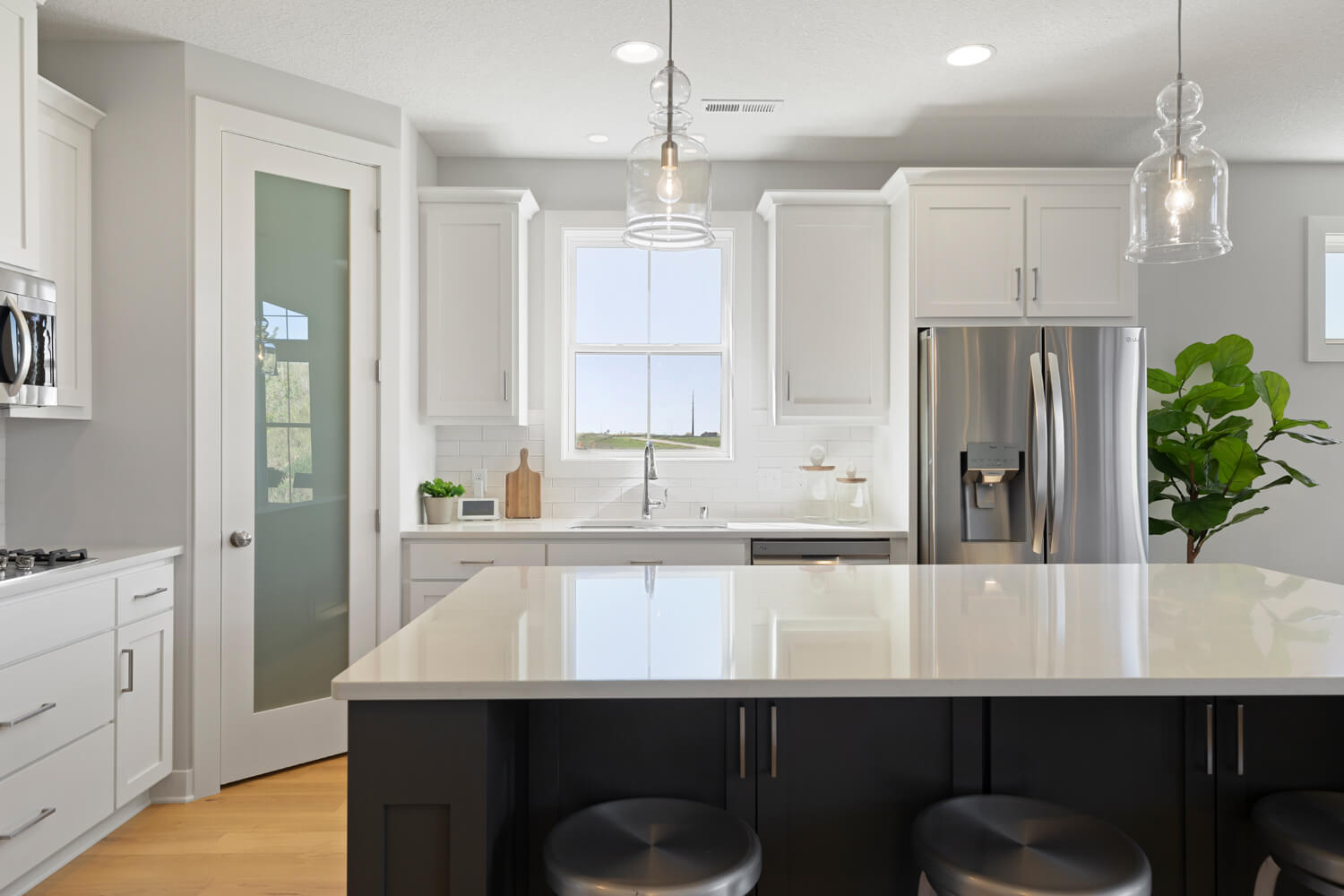 - Open transitional kitchen with custom cabinetry, window over sink, oversized center island, and spacious pantry