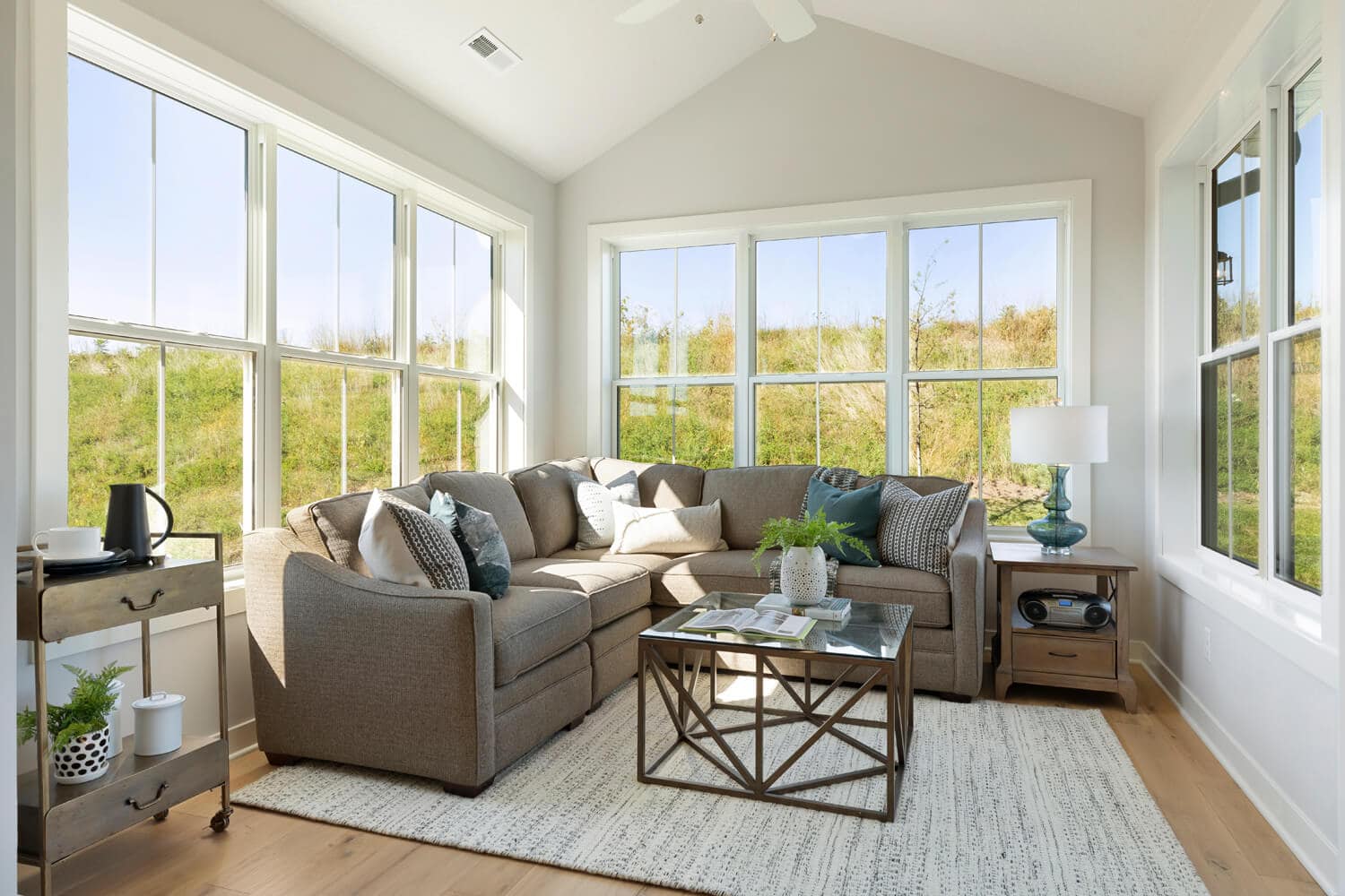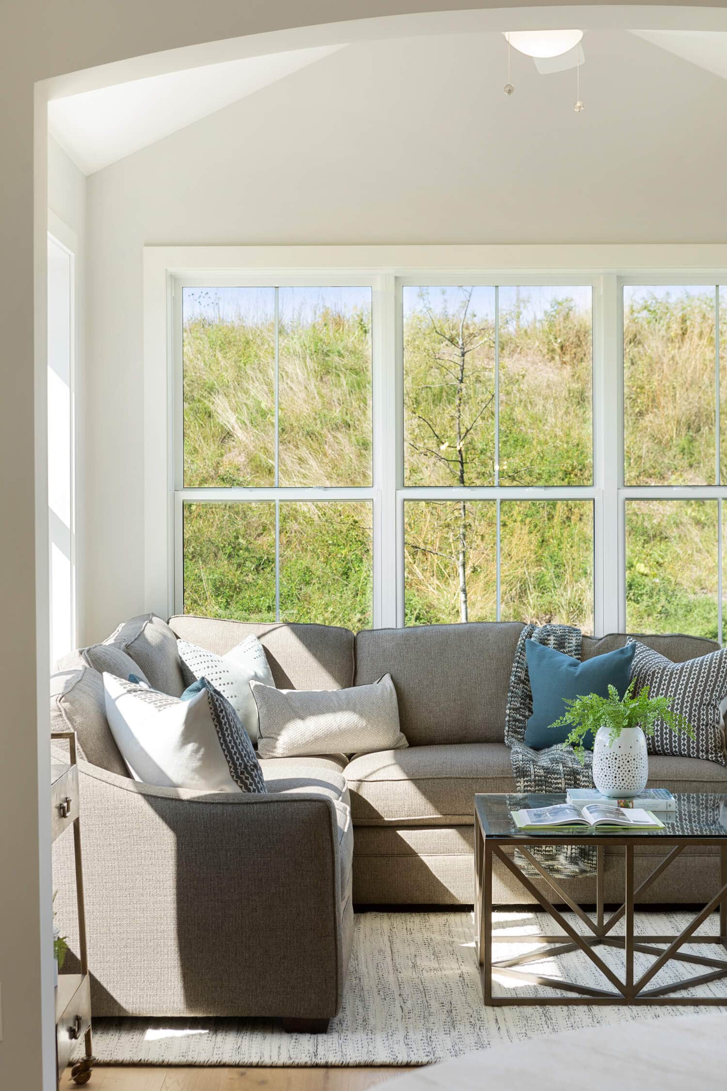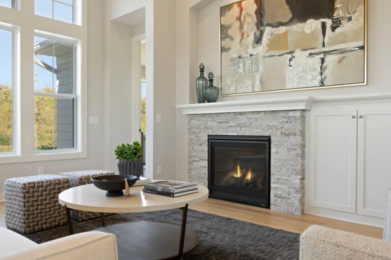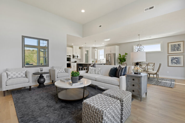 - Dramatic 12’ ceiling in gathering room with wall of windows and optional coffered ceiling