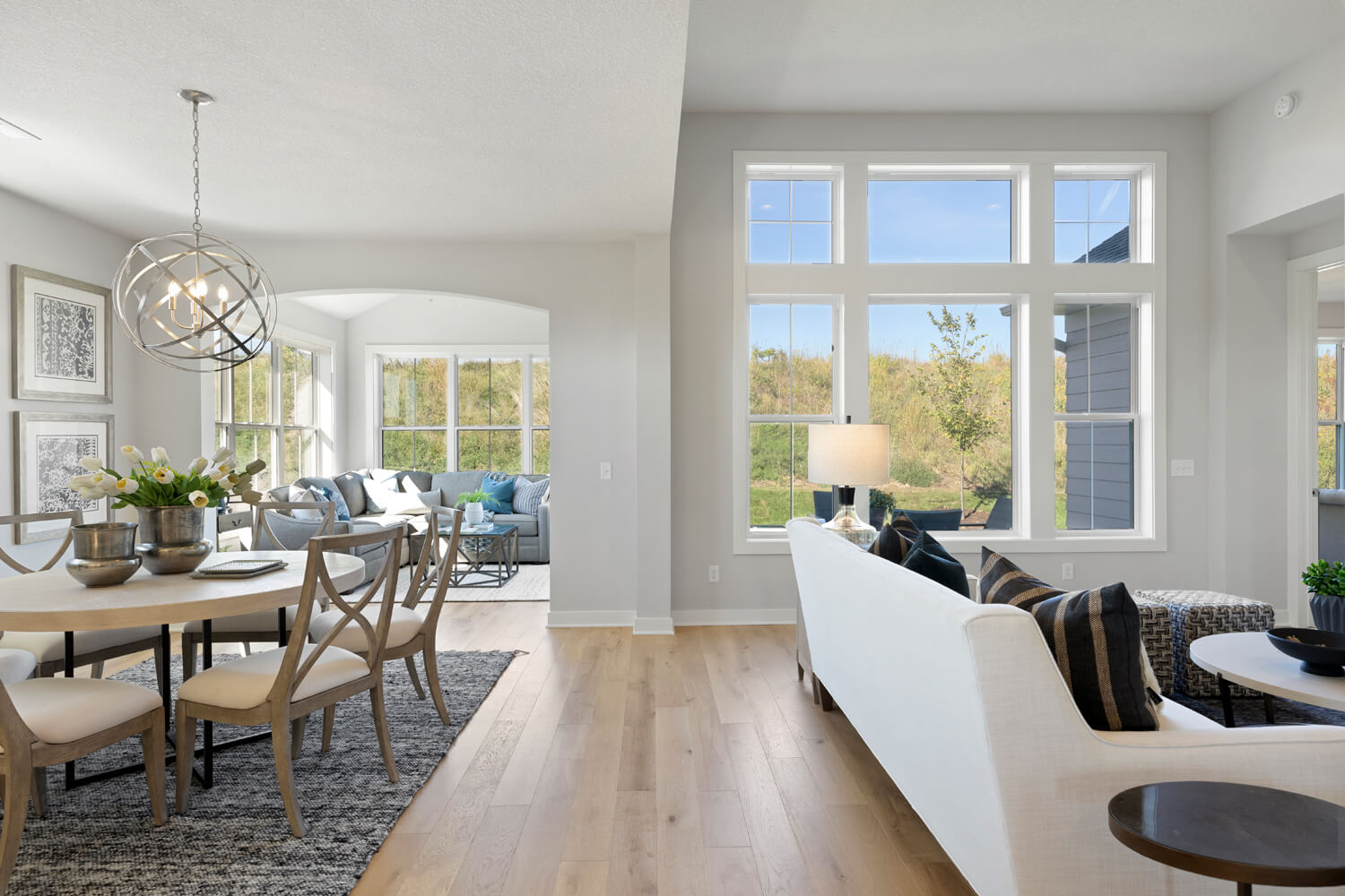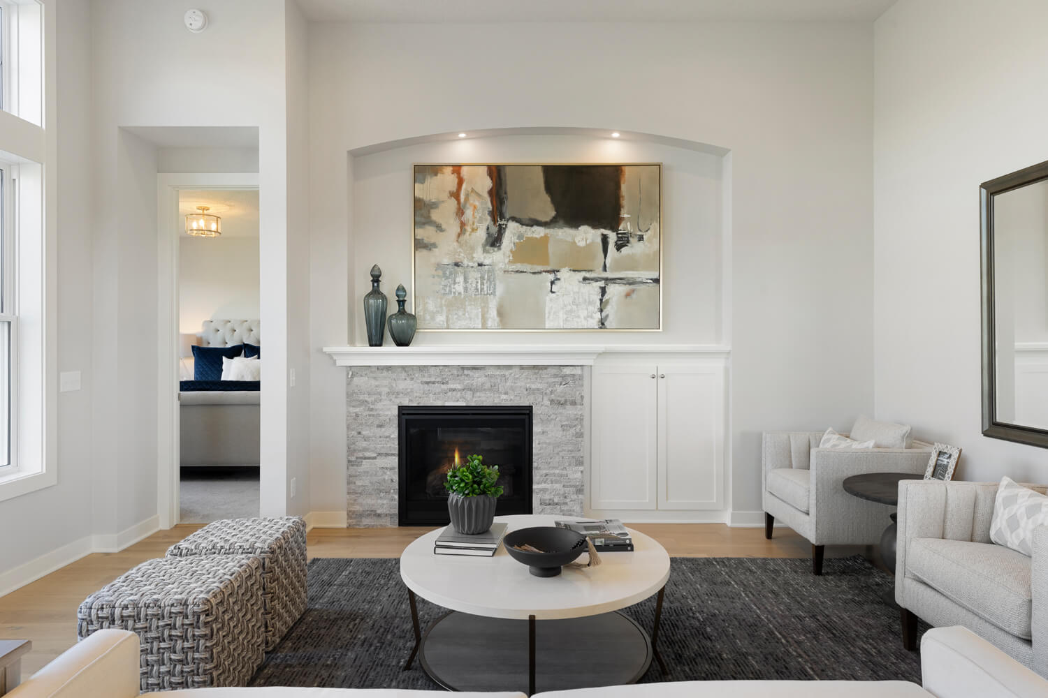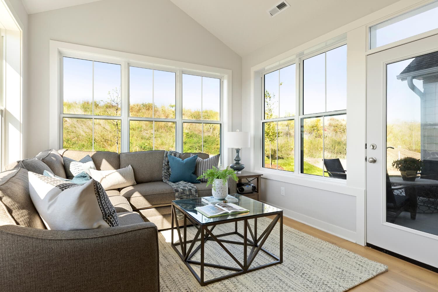 - Dramatic 12’ ceiling in gathering room with wall of windows and optional coffered ceiling
