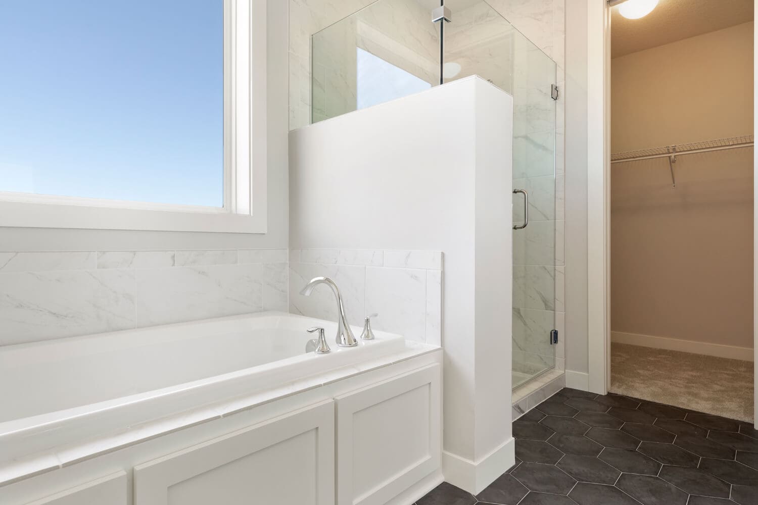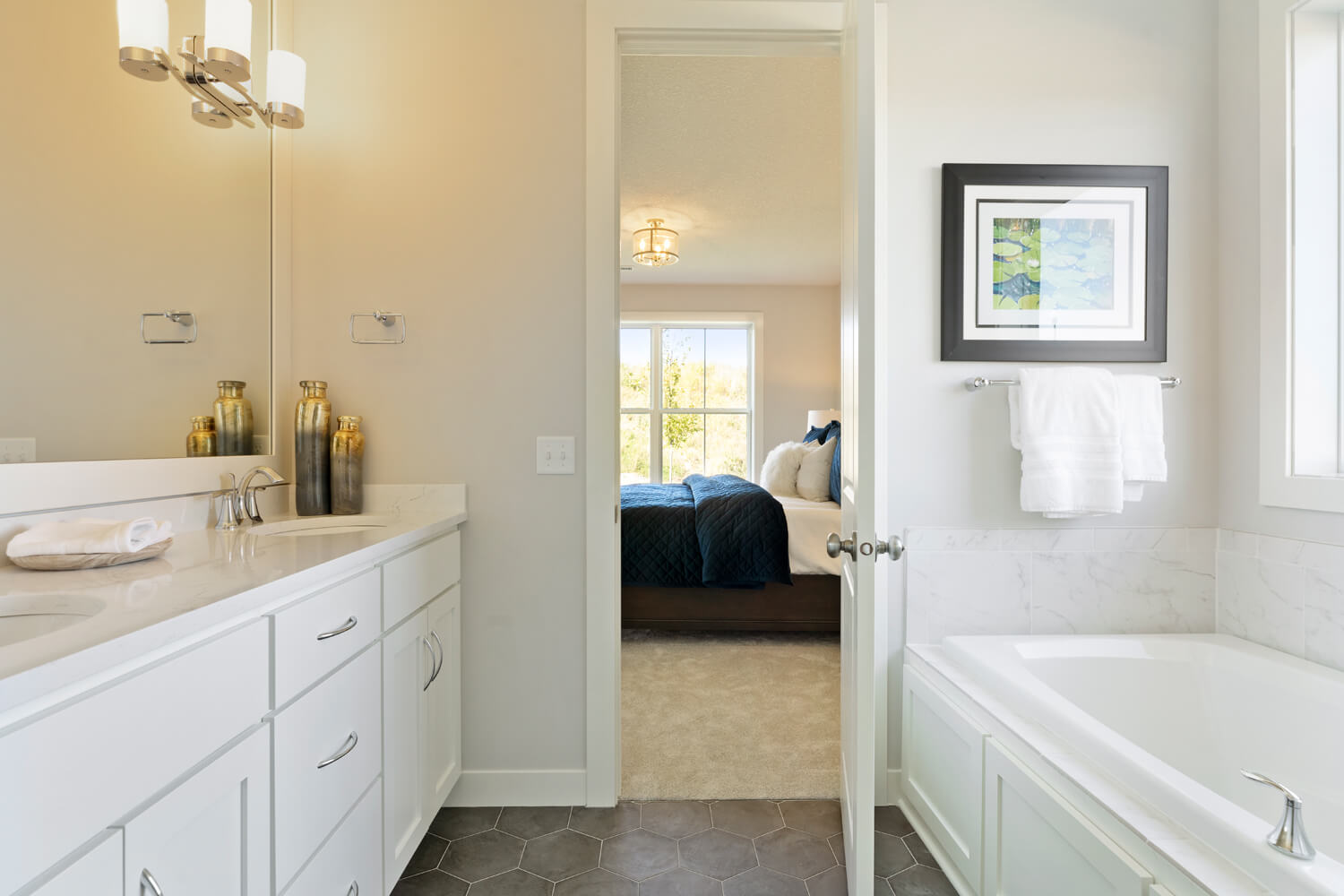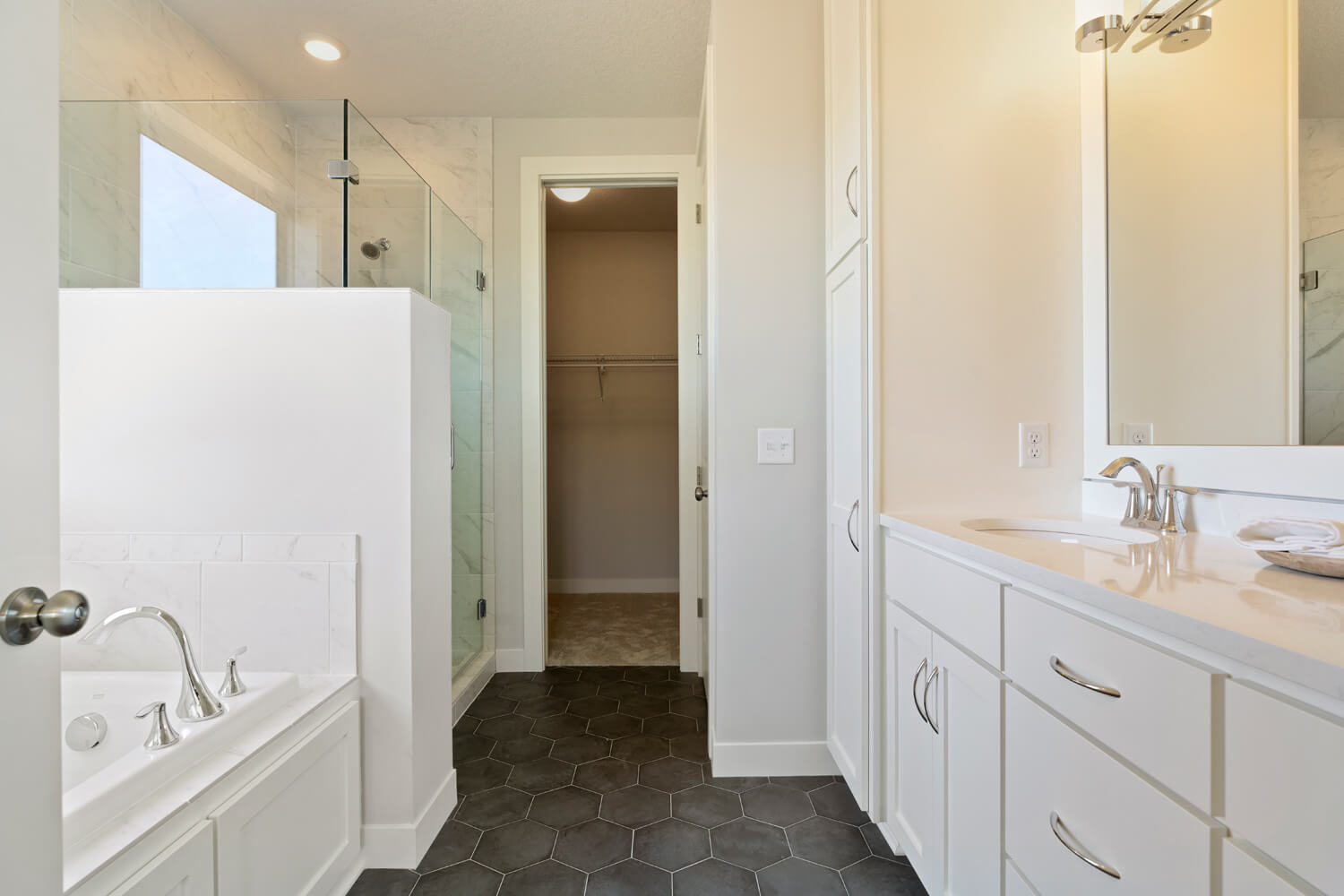 - Tranquil main level owner’s retreat with spa bath includes double vanity, soaking tub, separate shower, private water closet and spacious walk-in closet