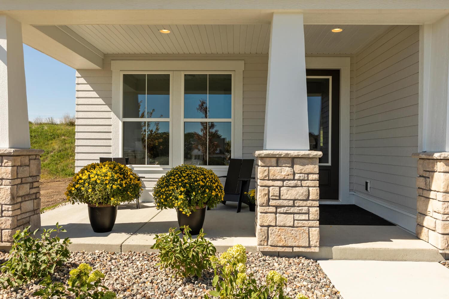 - Modern cottage elevation with inviting full front porch with columns and stone accents