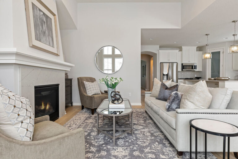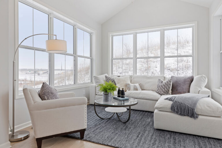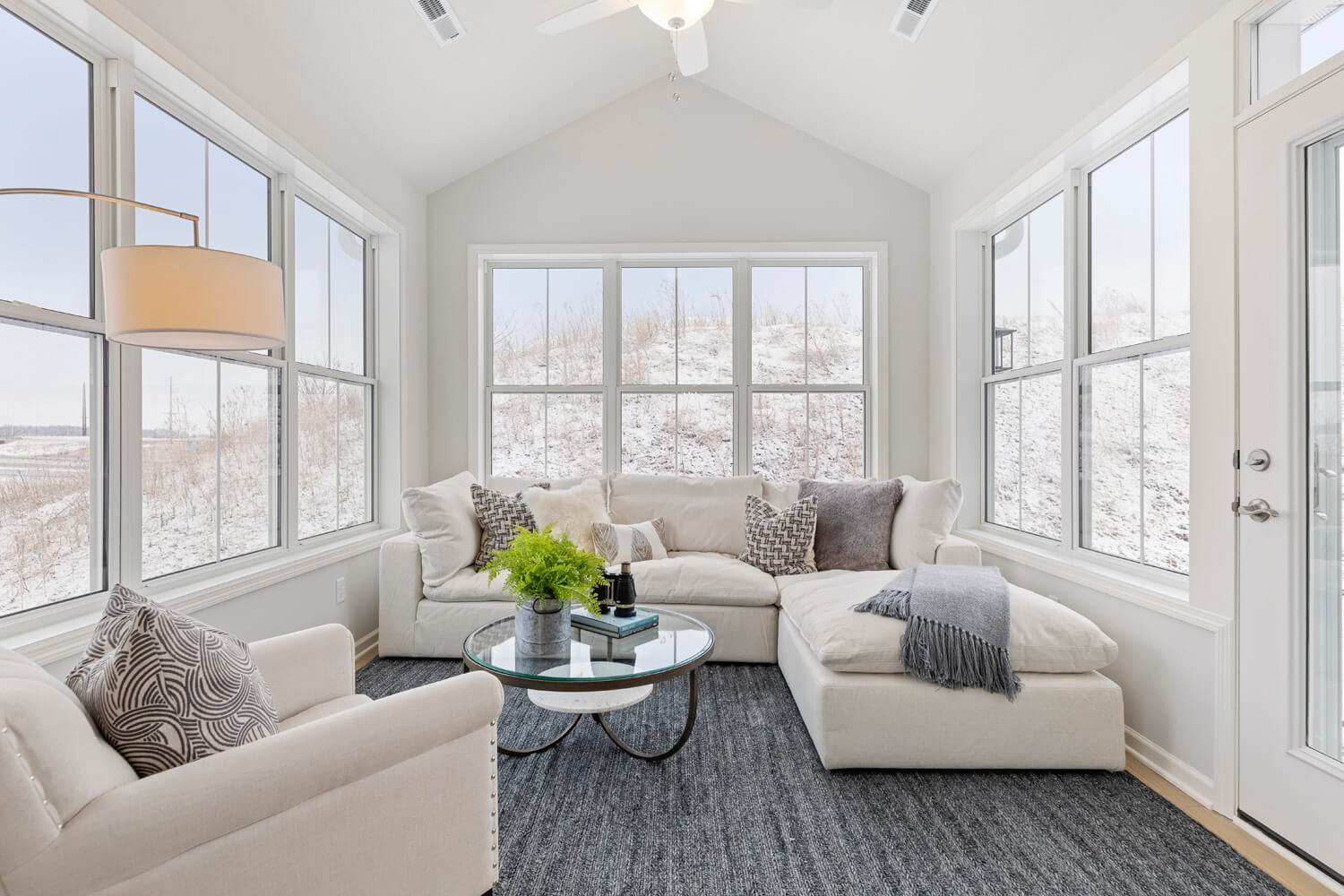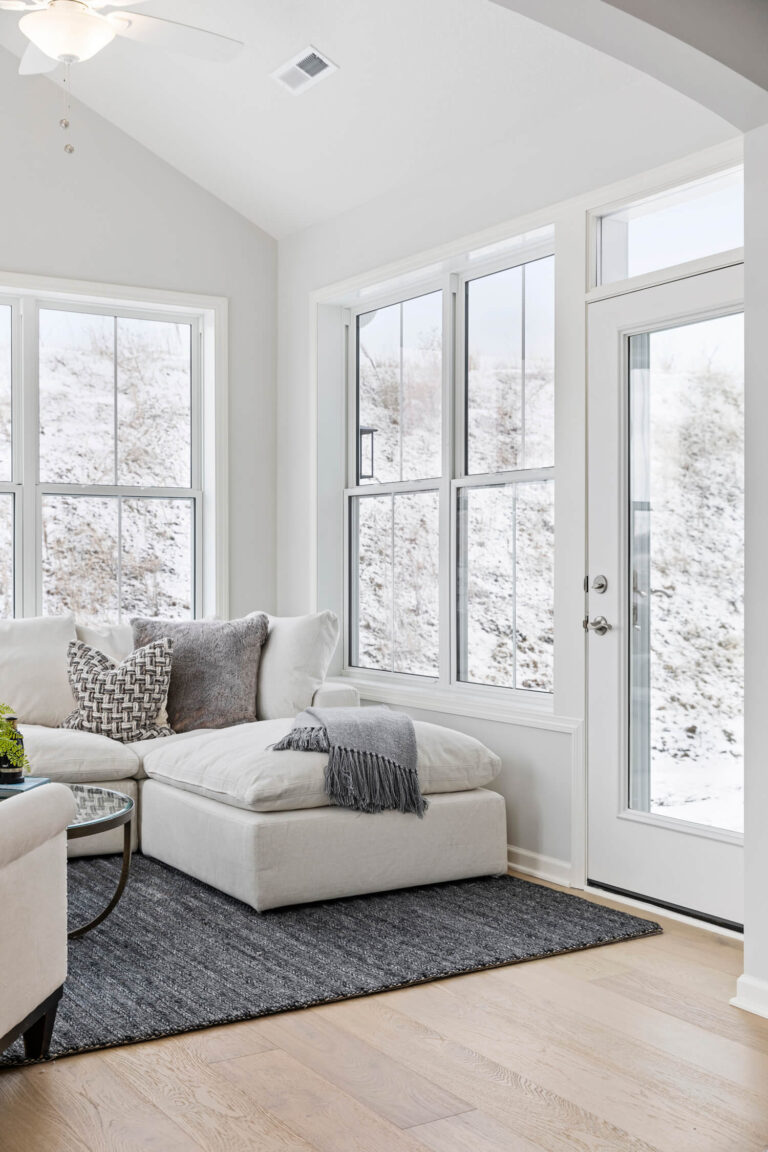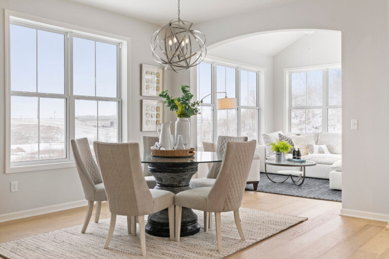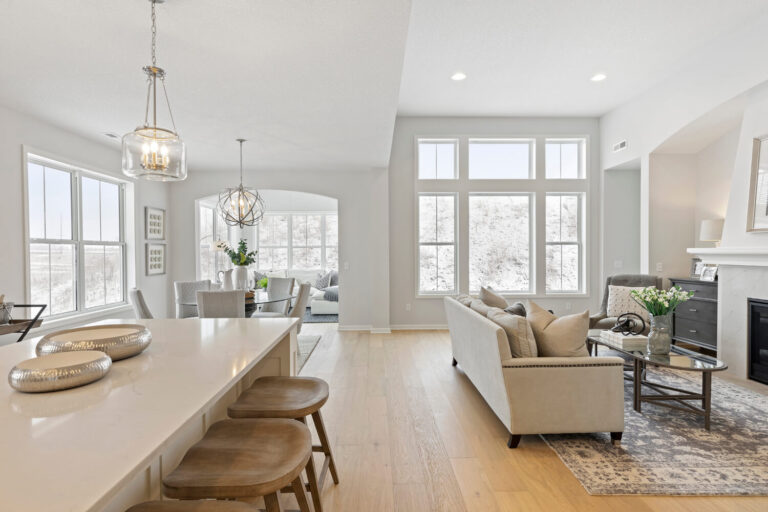 - Dramatic 12’ ceiling in gathering room with wall of windows and optional coffered ceiling