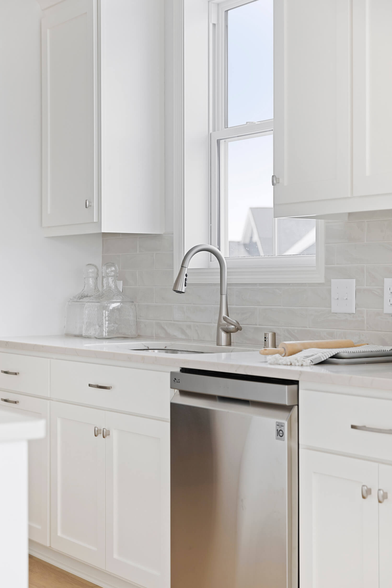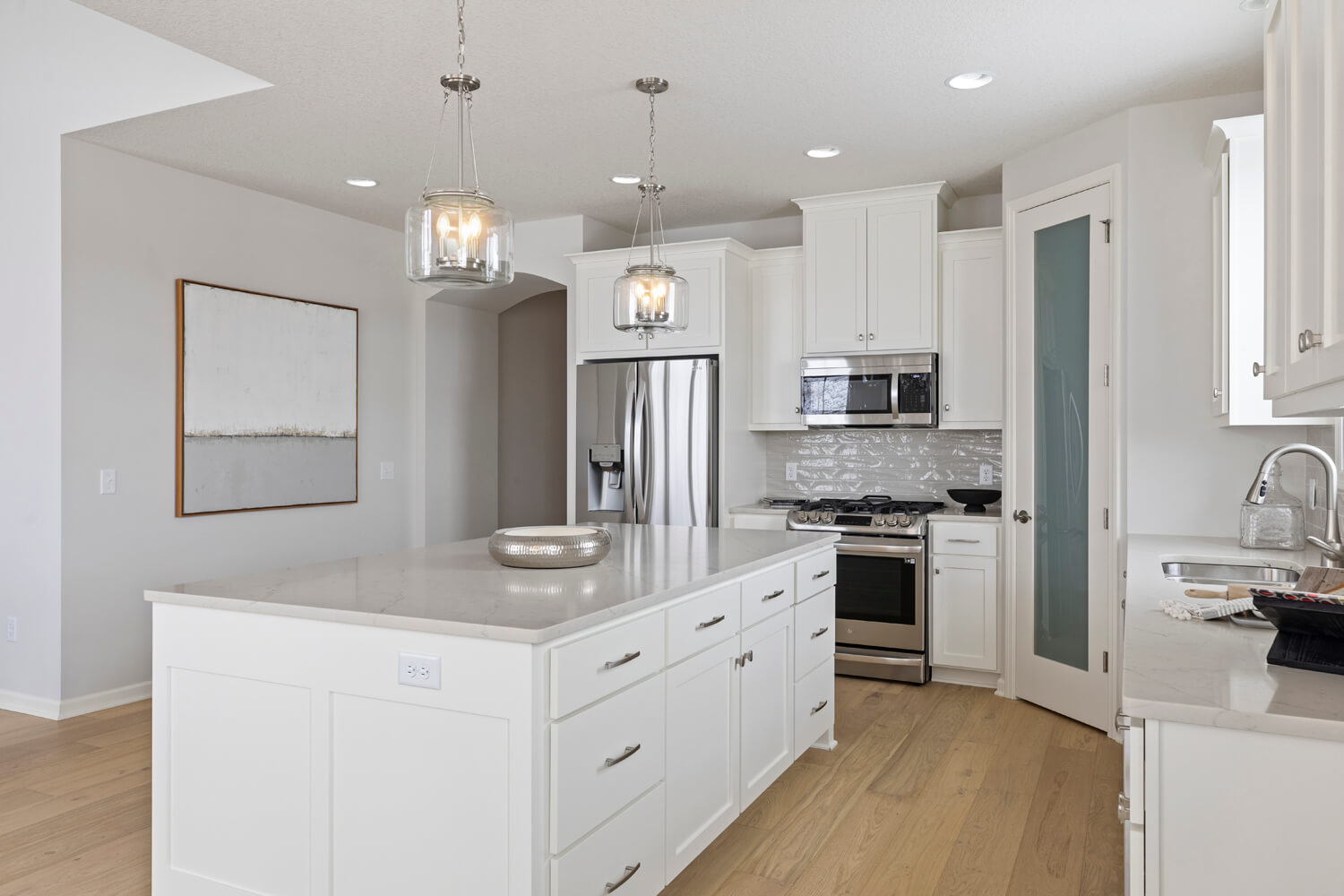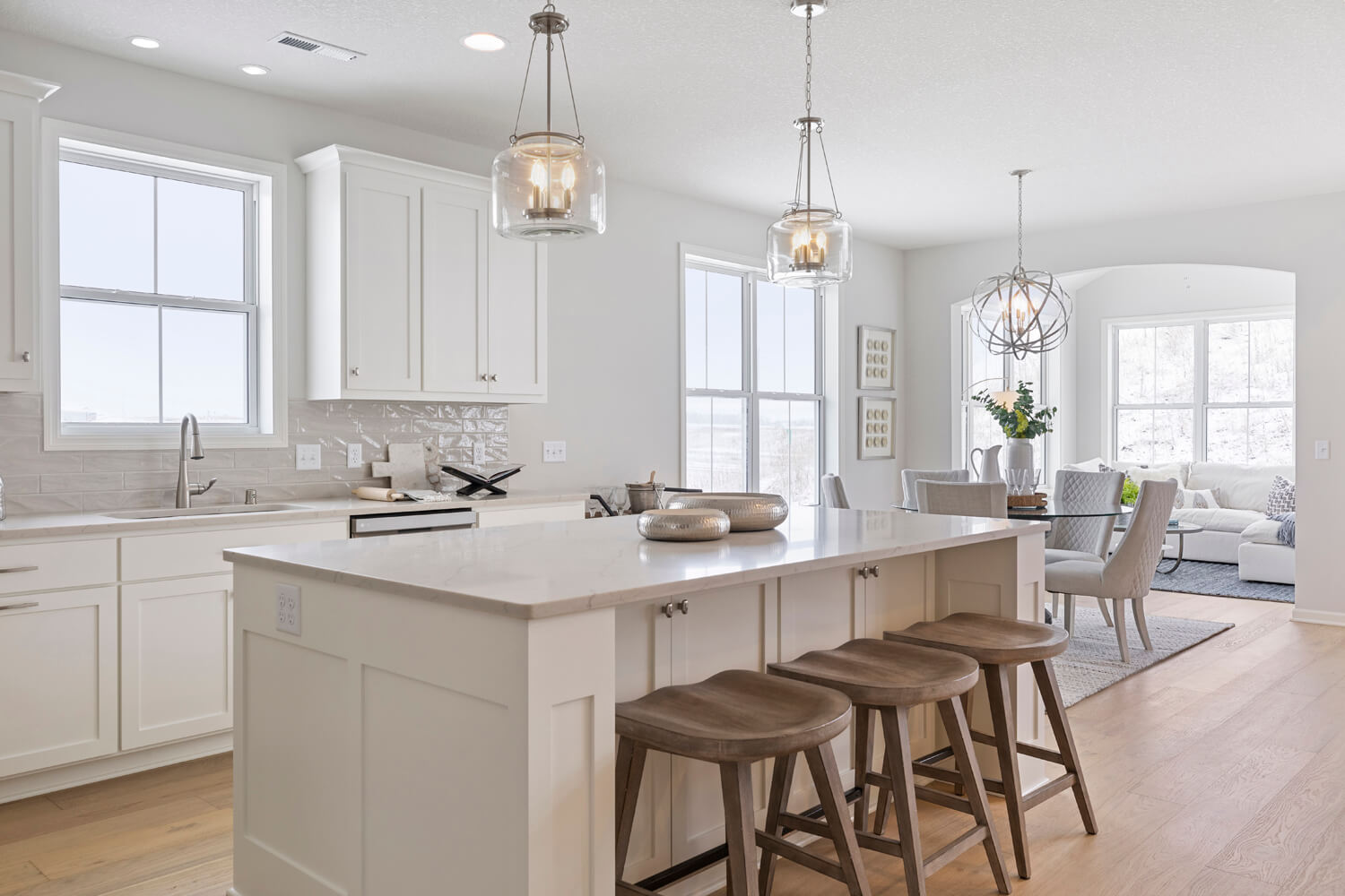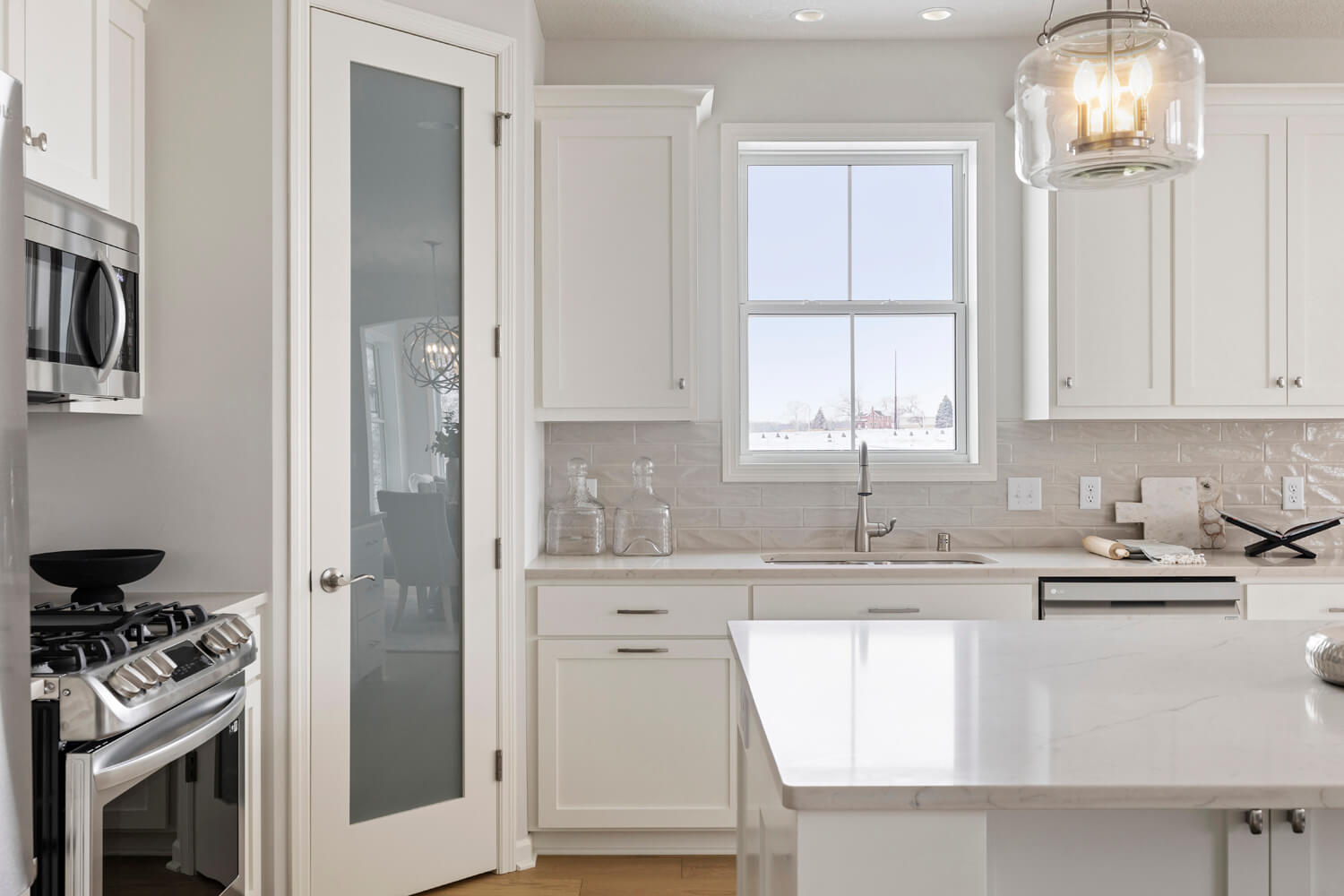 - Open transitional kitchen with custom cabinetry, window over sink, oversized center island, and spacious pantry