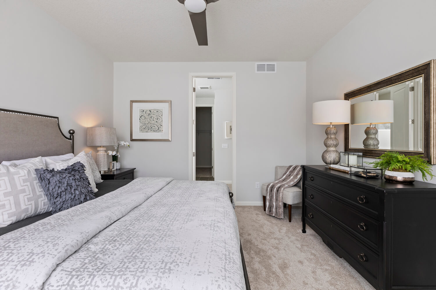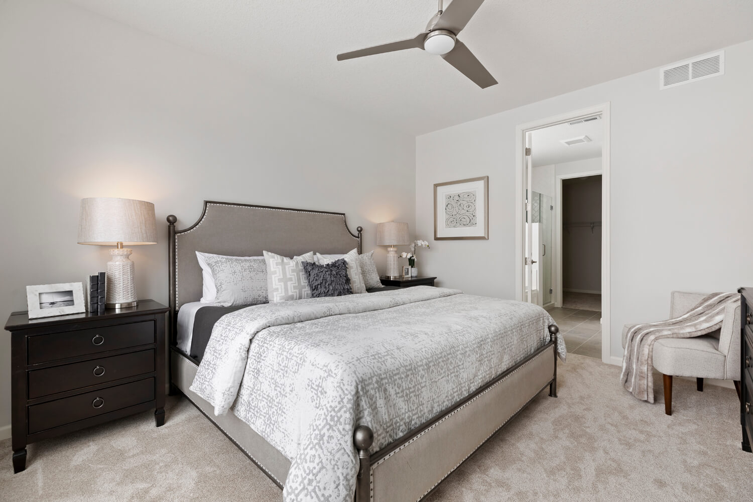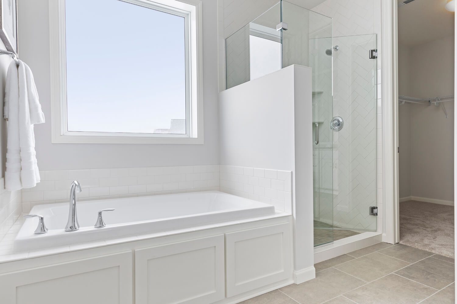 - Tranquil main level owner’s retreat with spa bath includes double vanity, soaking tub, separate shower, private water closet, and spacious walk-in closet