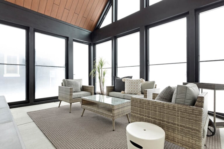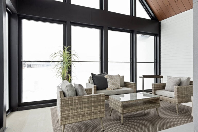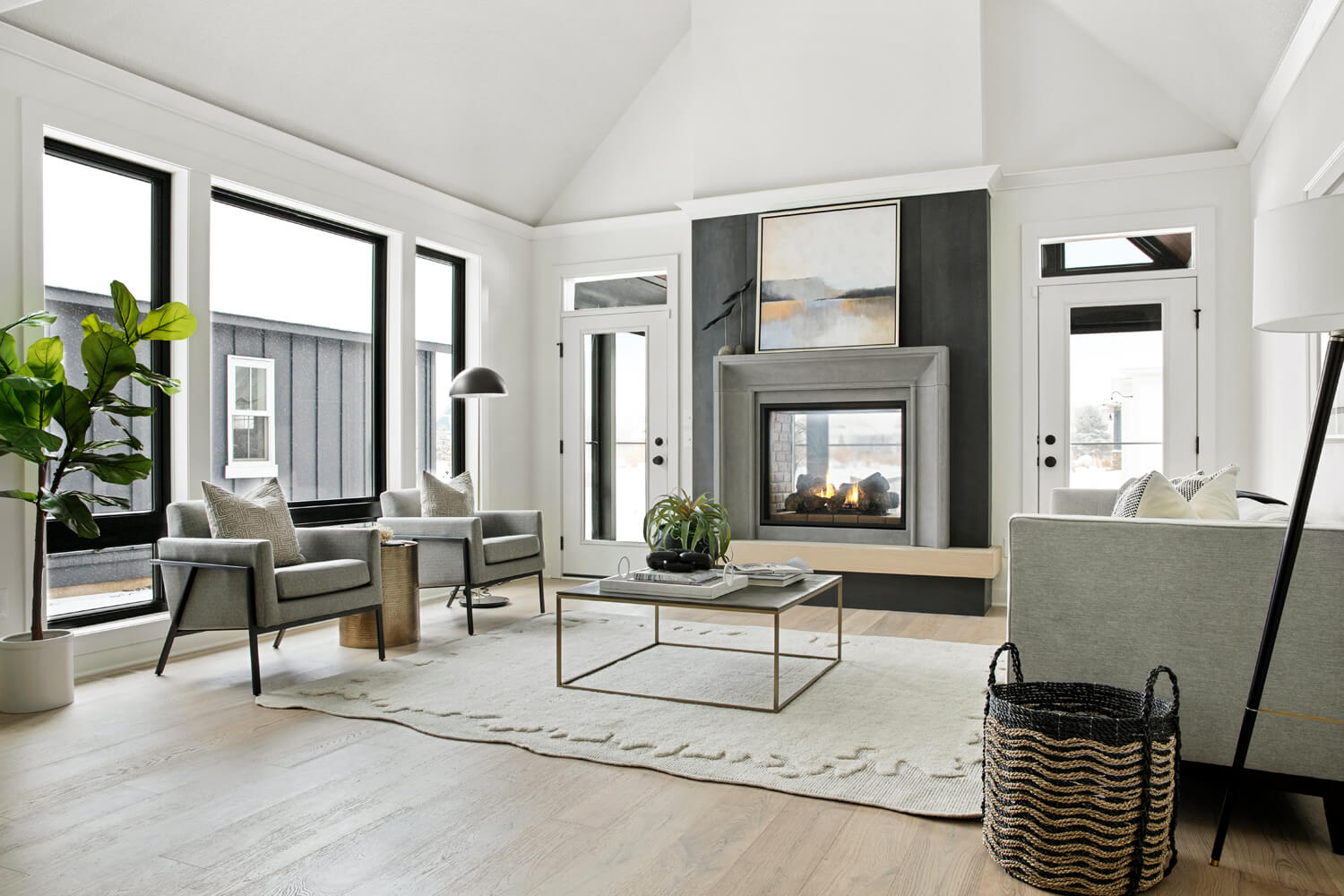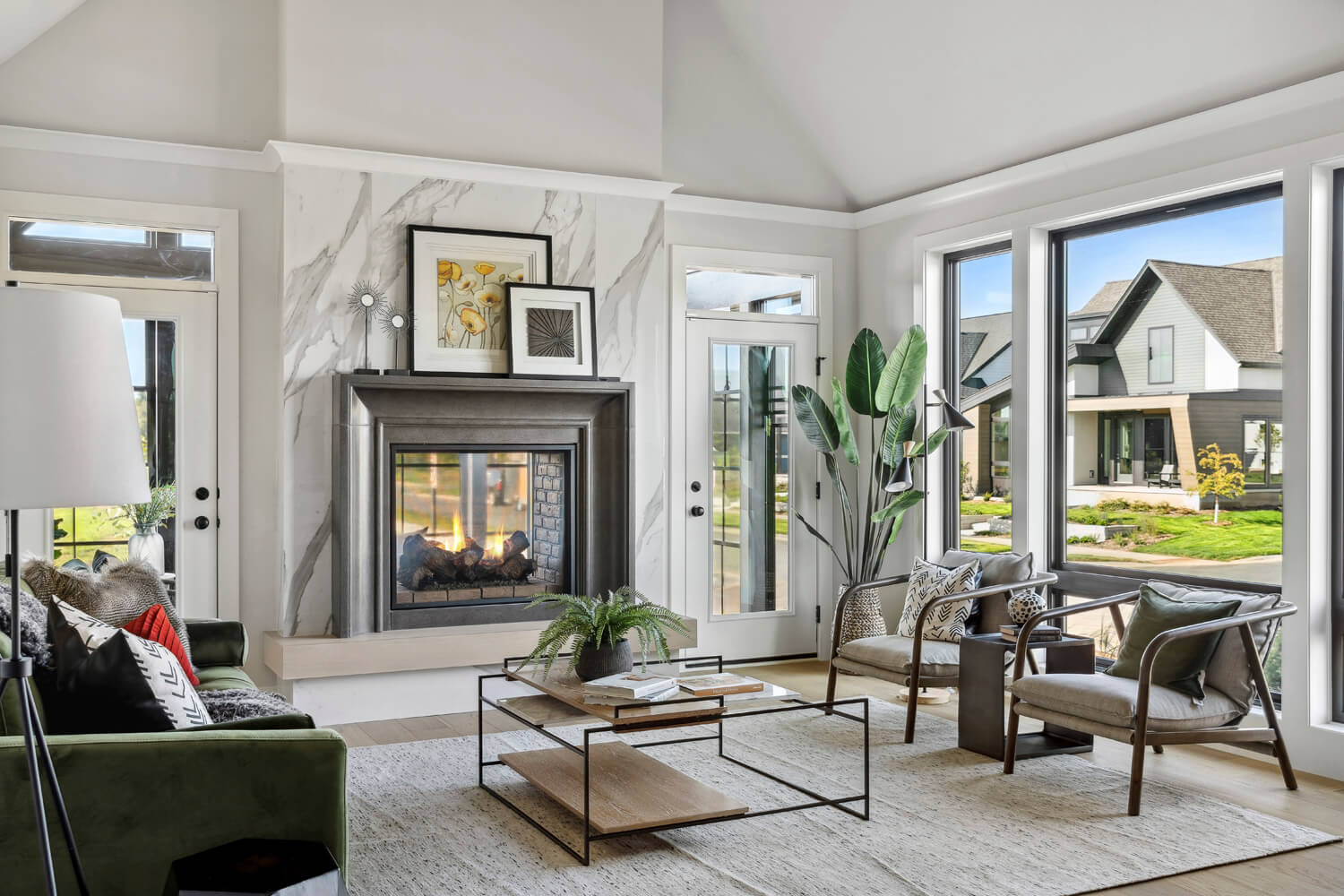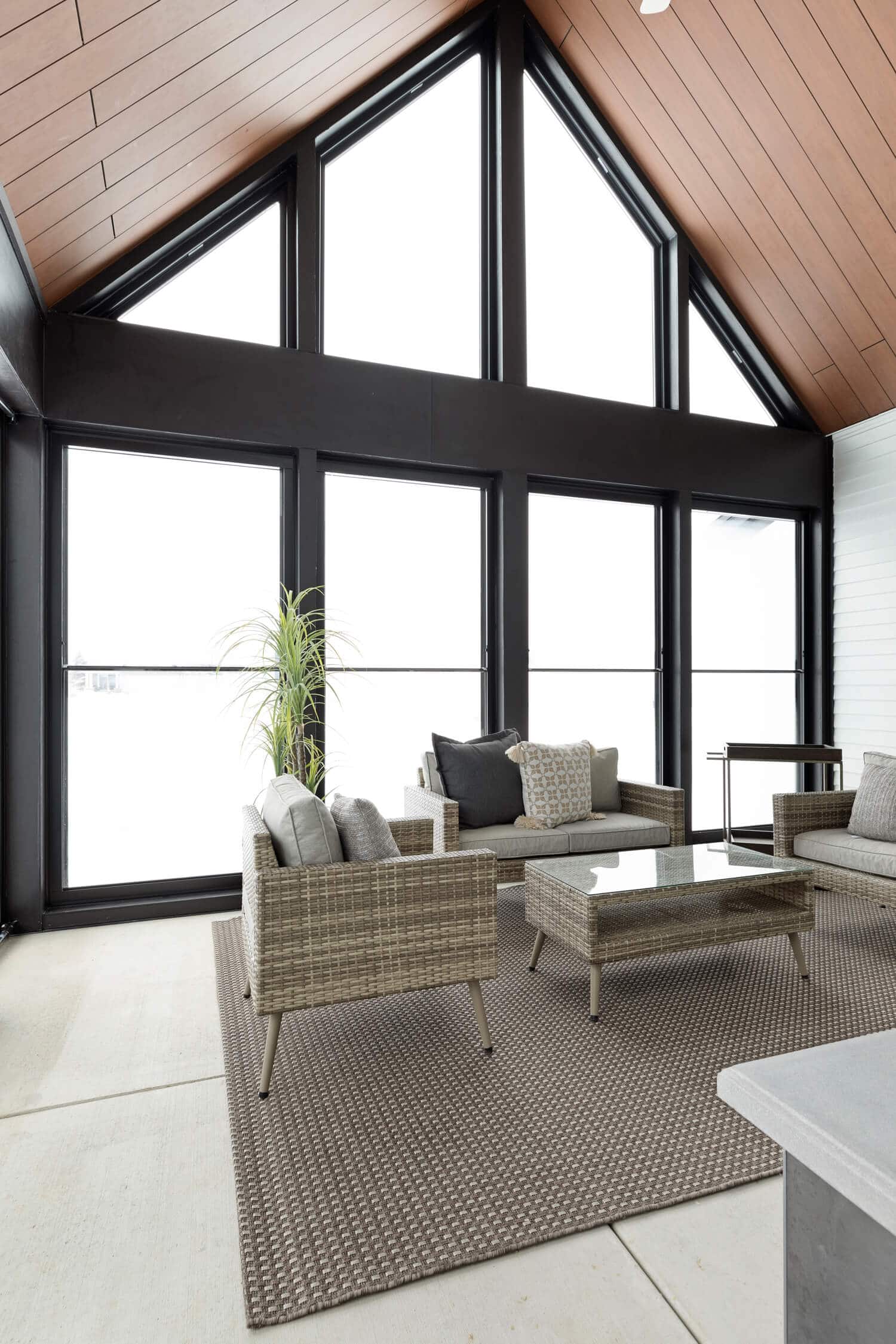 - Gathering room features floor to ceiling windows, vaulted ceiling, and gas fireplace