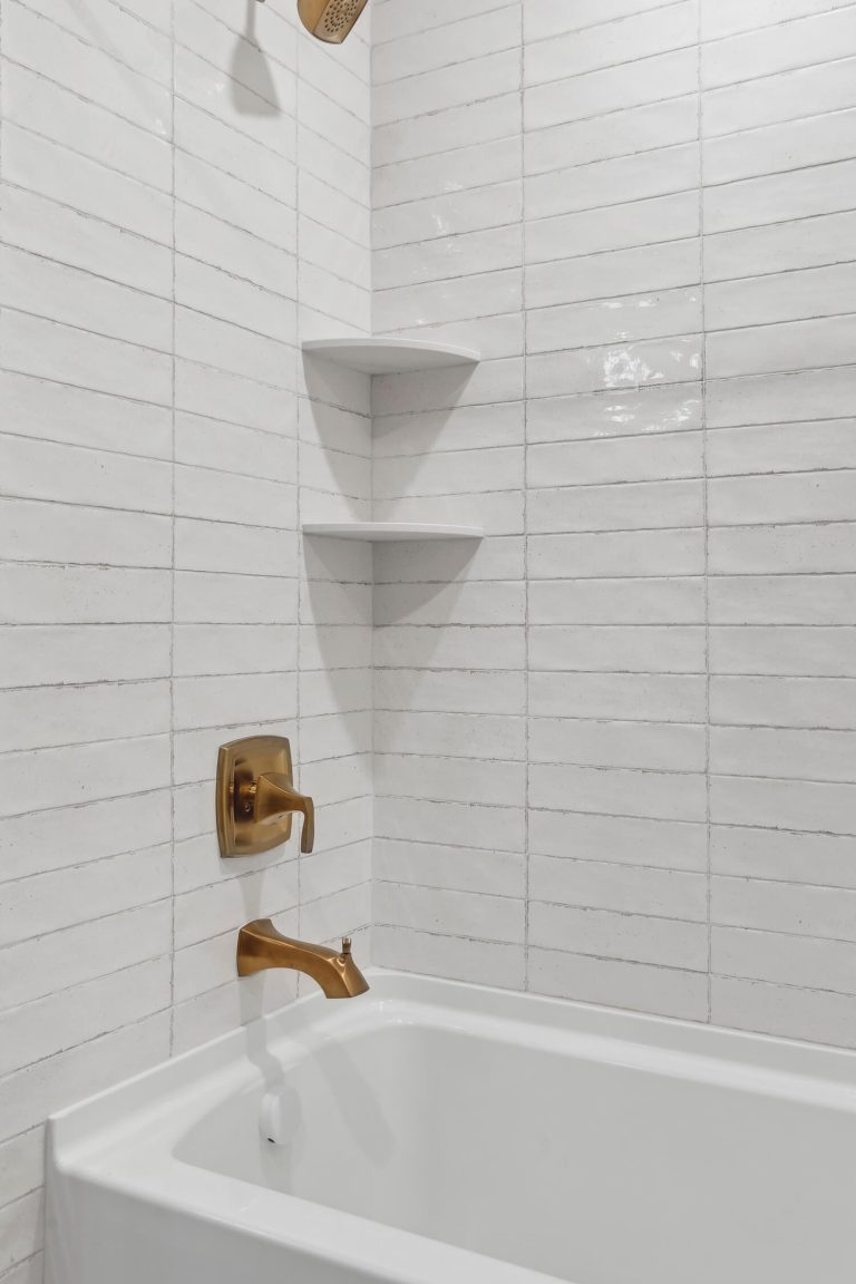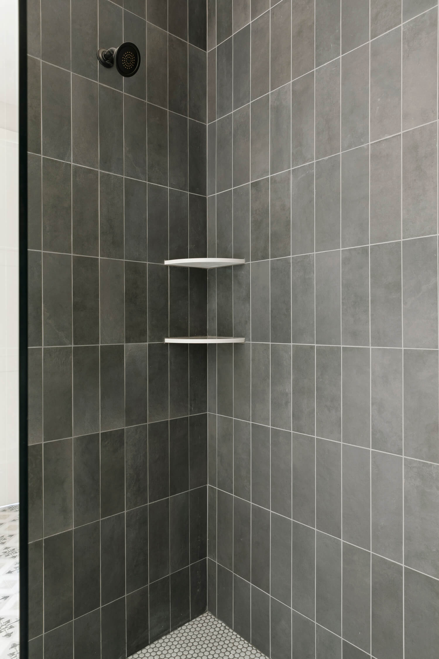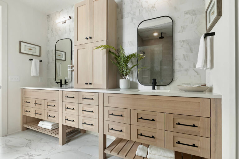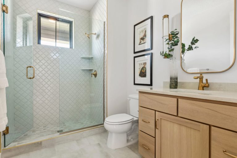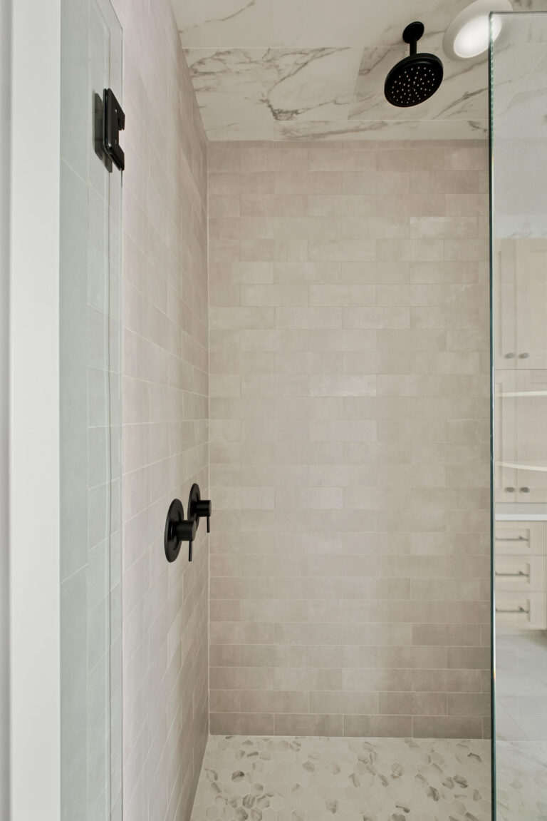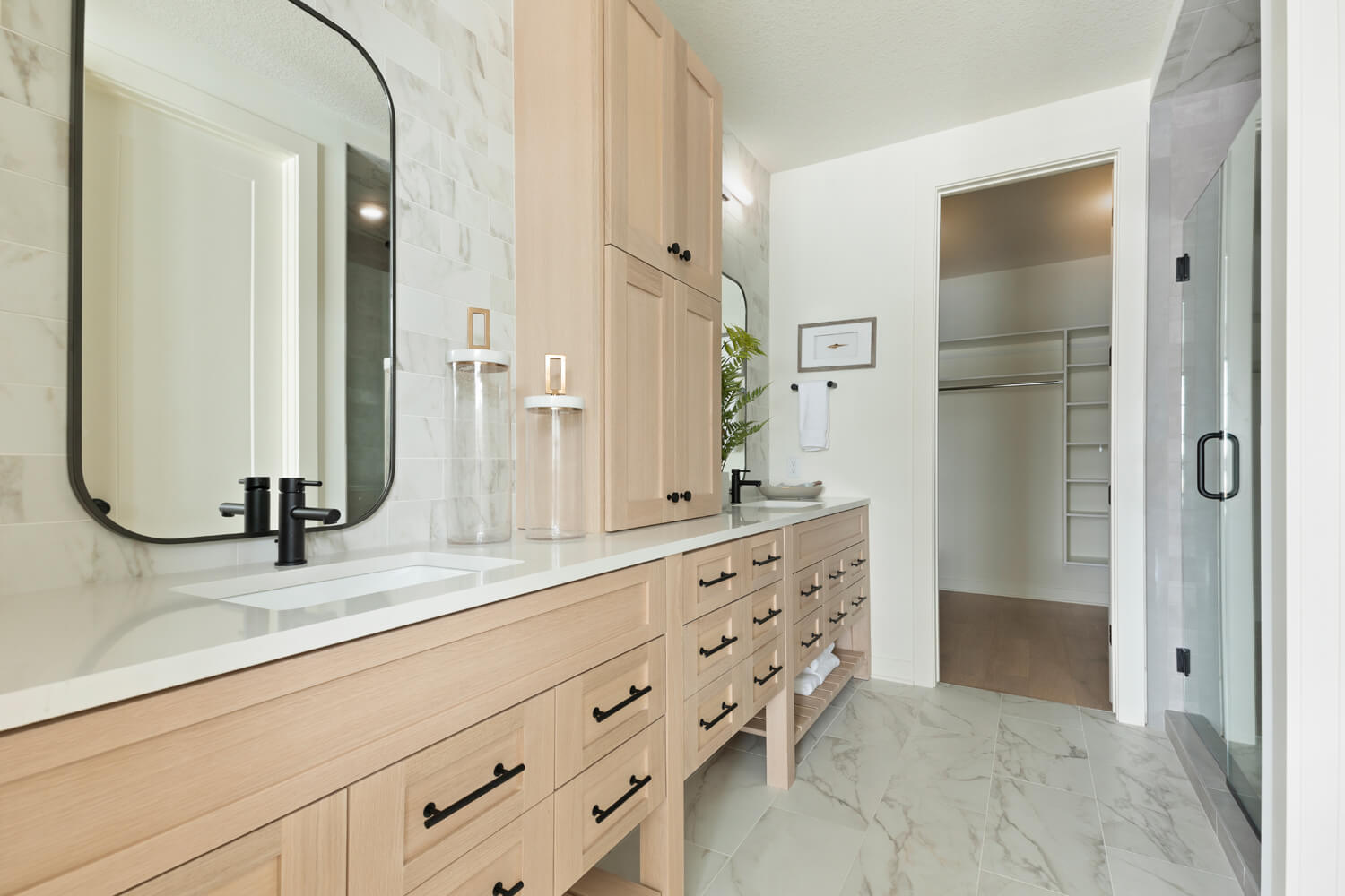 - Tranquil main level owner’s retreat with spa bath includes double vanity, walk-in tile with ceramic tile and heavy glass door, private water closet and spacious walk-in closet