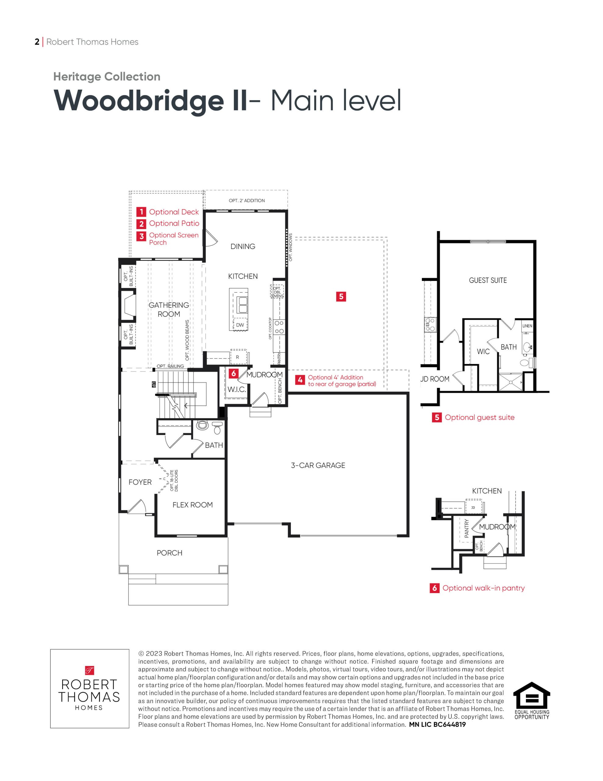 - Gathering room open to kitchen with center island and rear dining room with access to optional deck or screen porch