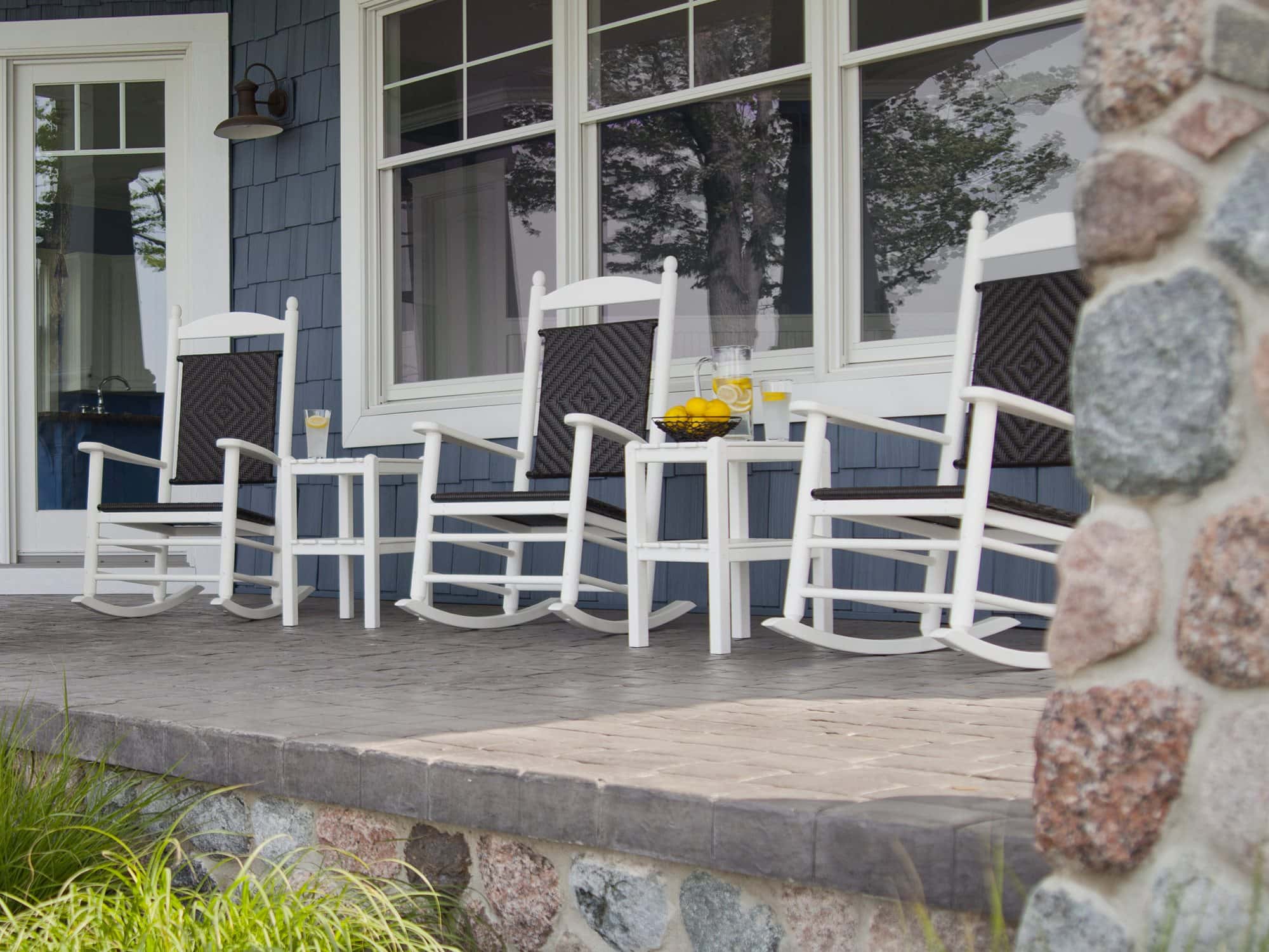 A cozy farmhouse porch is both serene and stylish. A trio of wooden rocking chairs lends a sophisticated air, while a couple of end tables cap off a warm and welcoming outdoor space. A sprinkle of fresh fruit adds a pretty pop of citrus to a mellow porch.