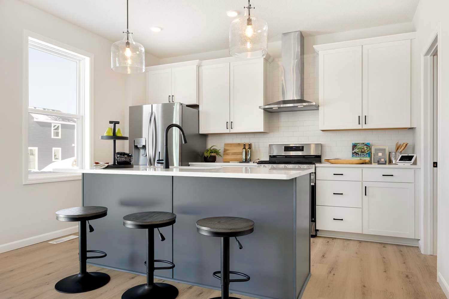 - Kitchen offers 42″ upper cabinets, stainless steel hood above gas range, upgraded French door refrigerator, and double garbage rollout