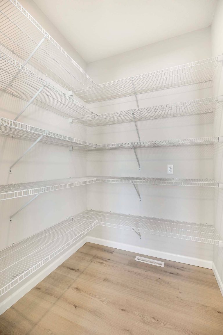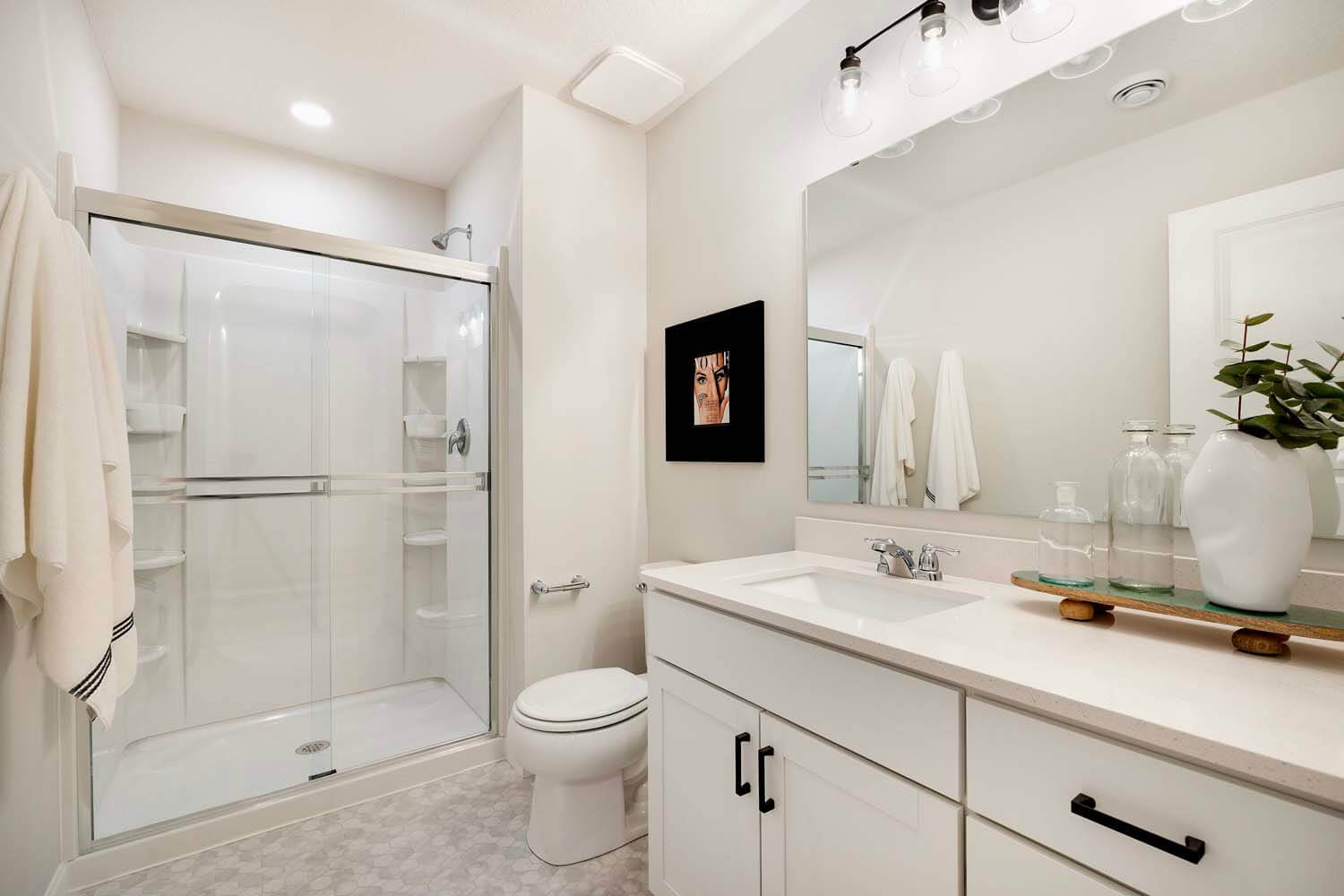 - Primary suite features double vanity, large shower with tiled walls, and semi-frameless swing door, and spacious walk-in closet