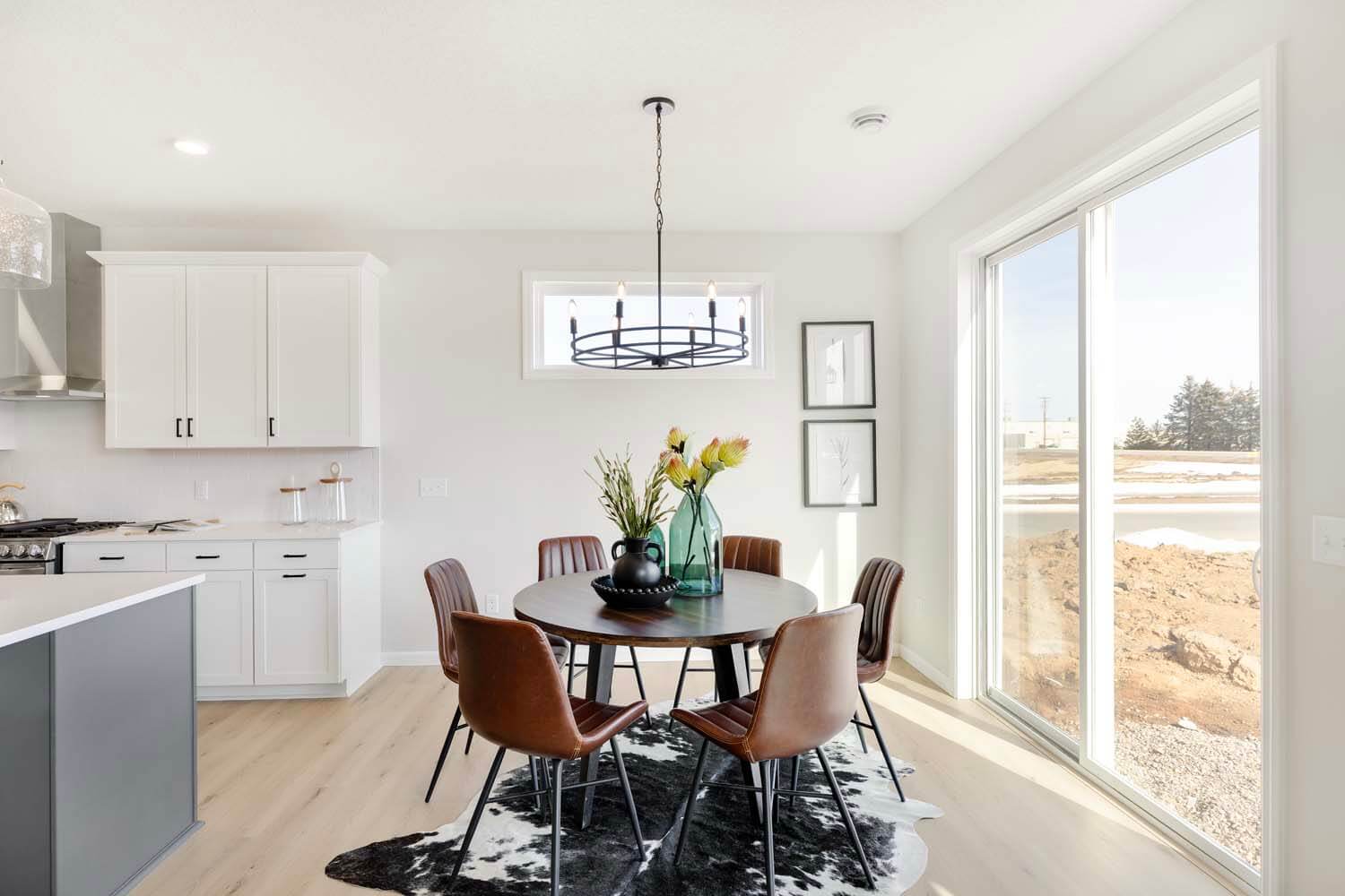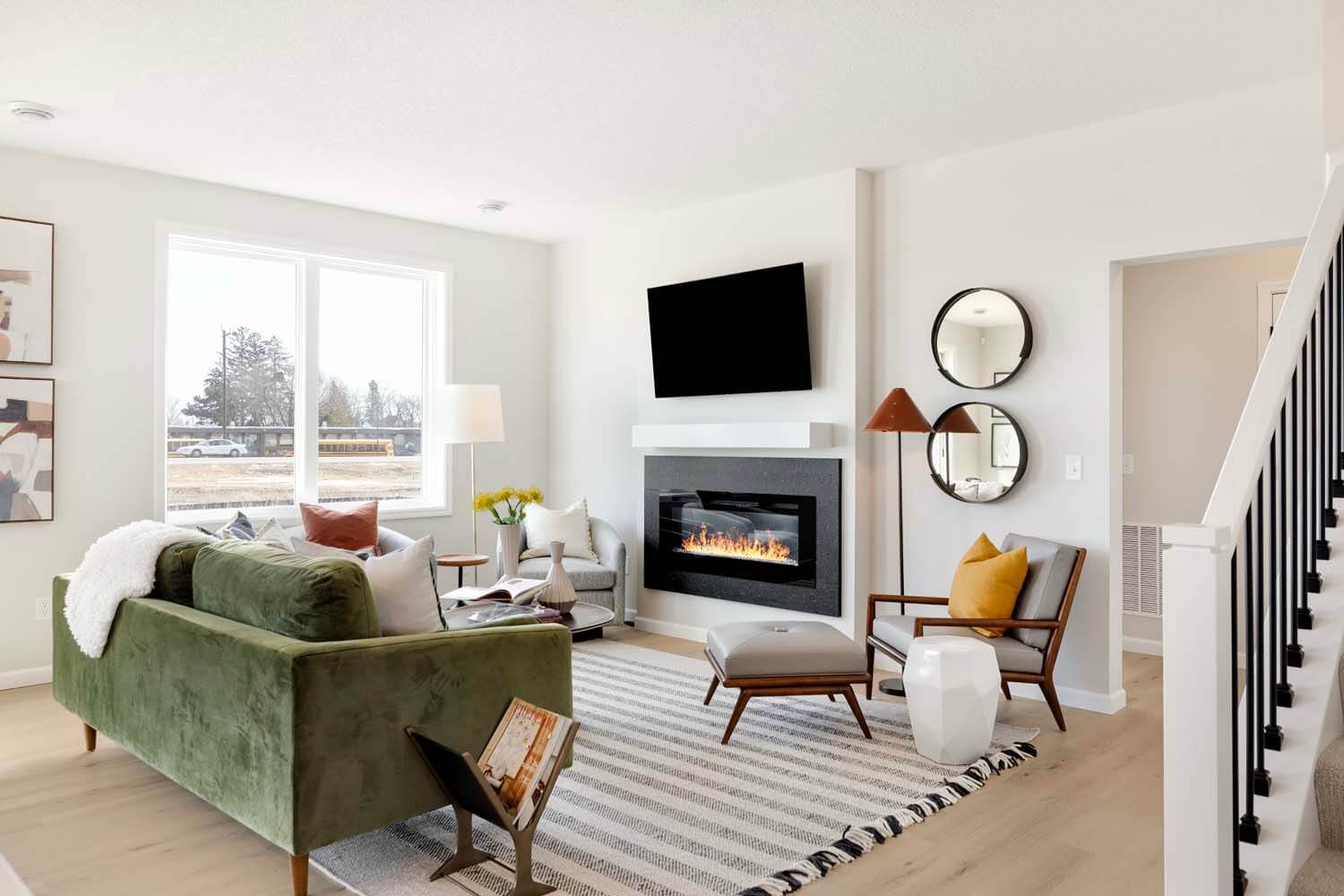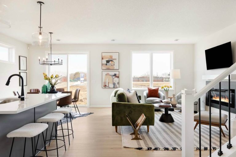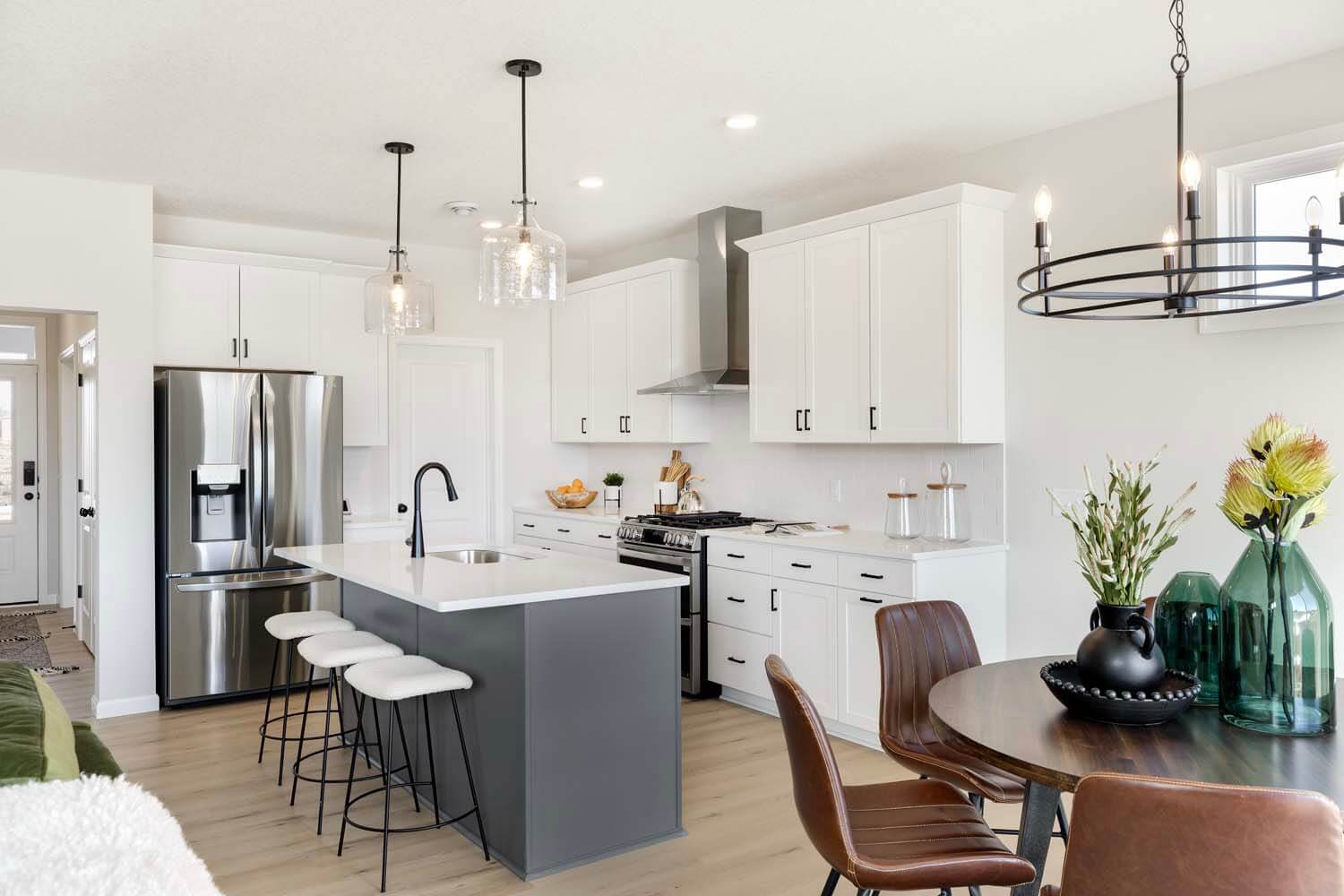 - Light-filled open-concept floorplan with main floor bedroom, flex room with doors for privacy and spacious mudroom