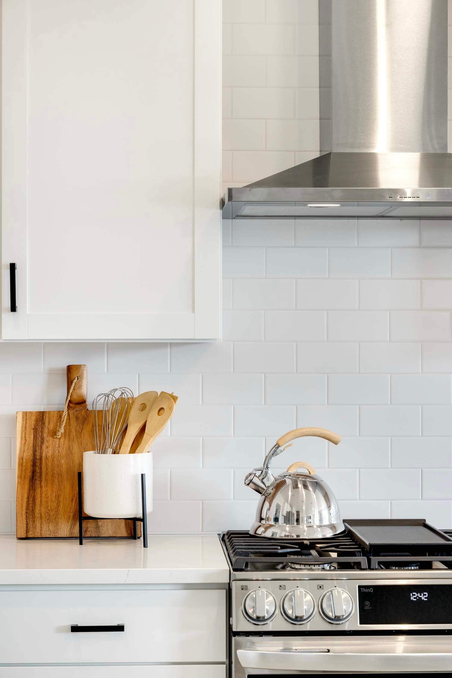 - Kitchen offers 42″ upper cabinets, stainless steel hood above gas range, upgraded French door refrigerator, double garbage rollout, and morning room pantry