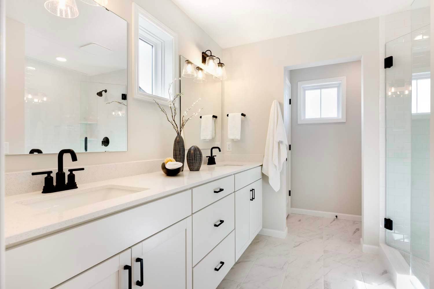 - Primary suite features double vanity, large tiled shower with glass swing door, and large walk-in closet