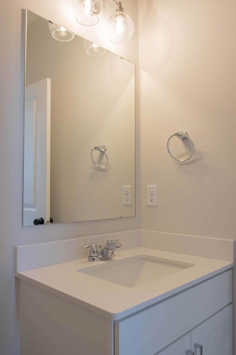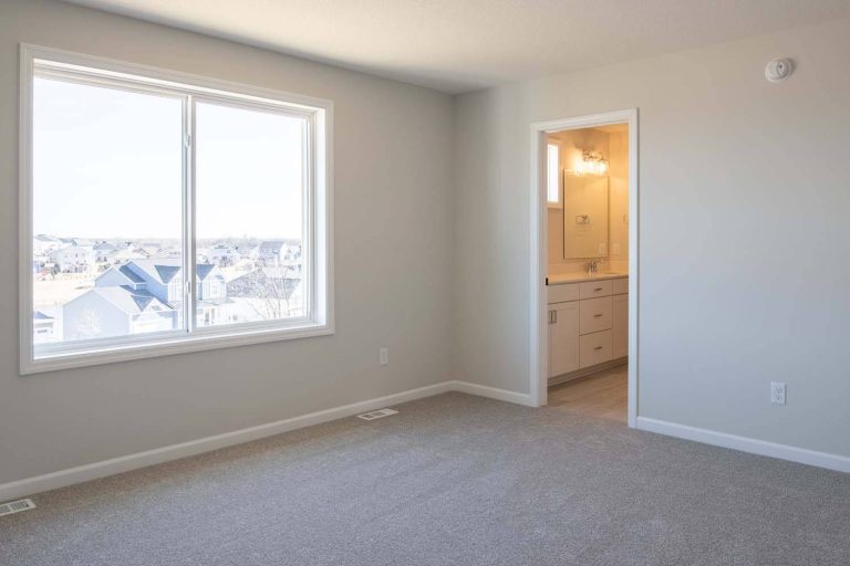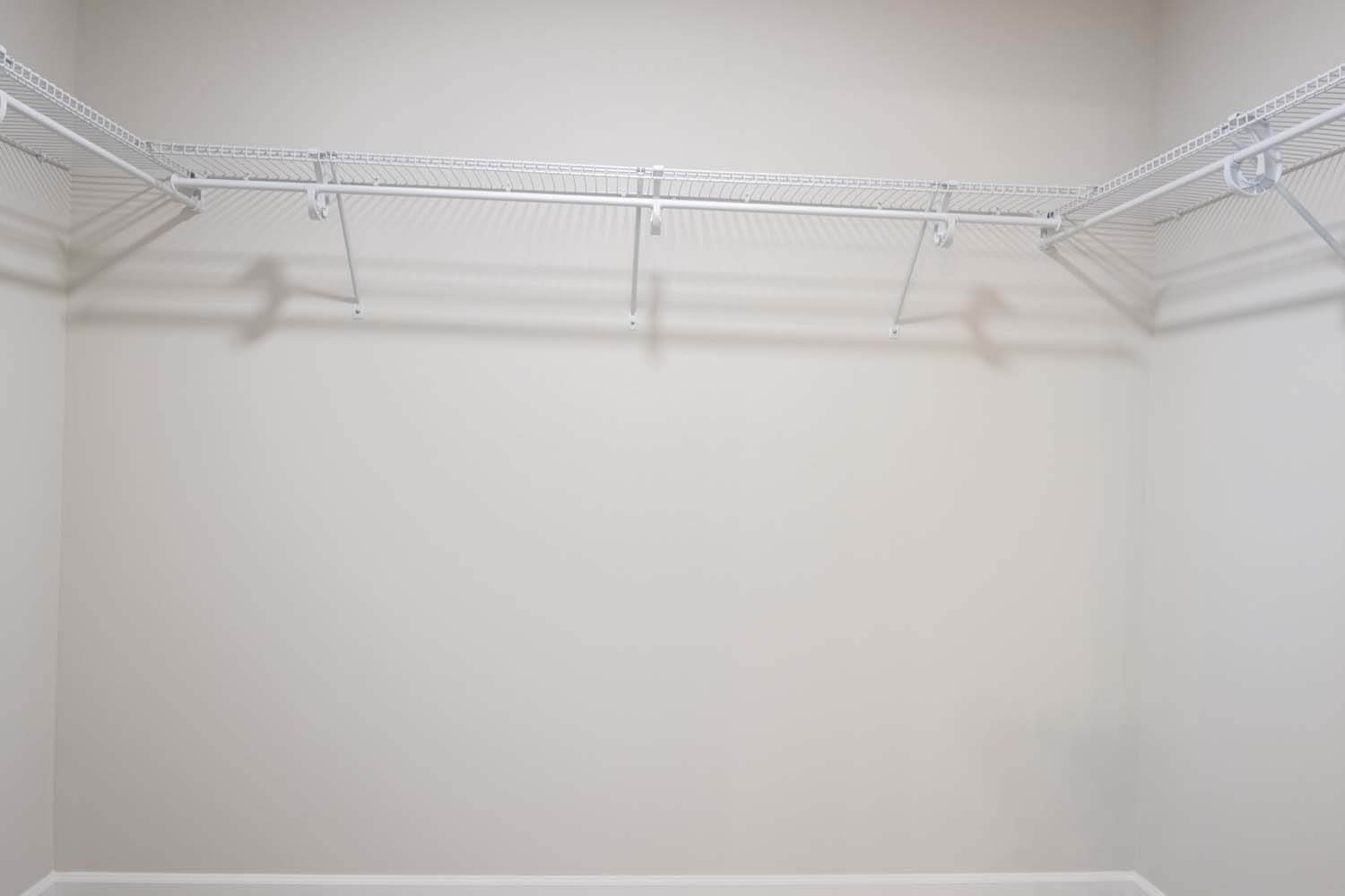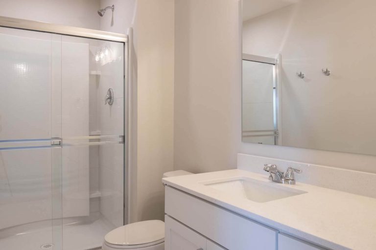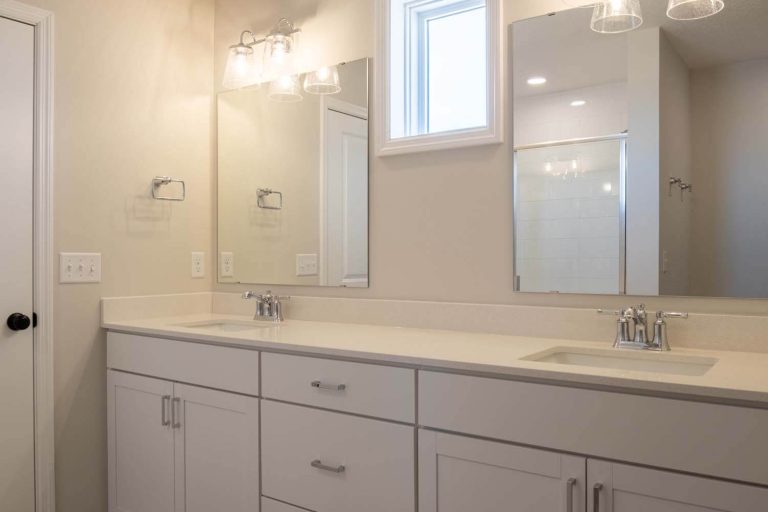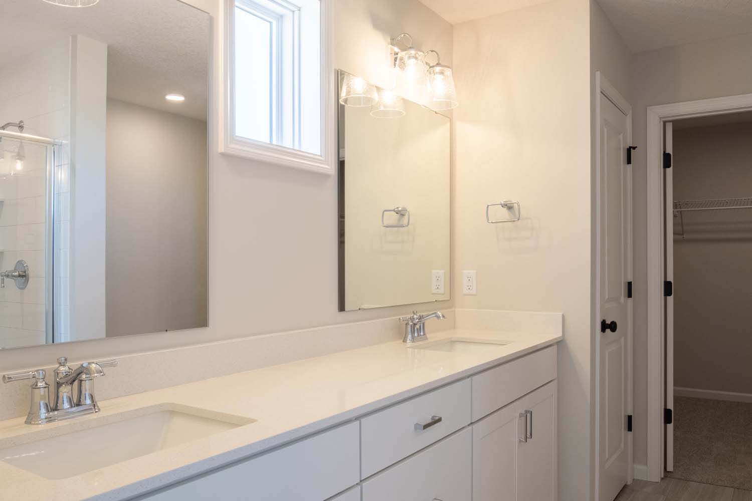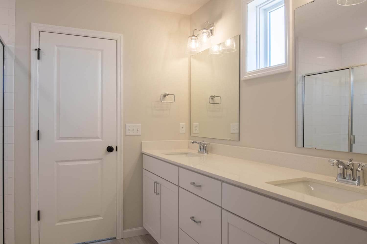 - Owner’s suite features double vanity, large shower with tiled walls, and semi-frameless sliding door, and large walk-in closet