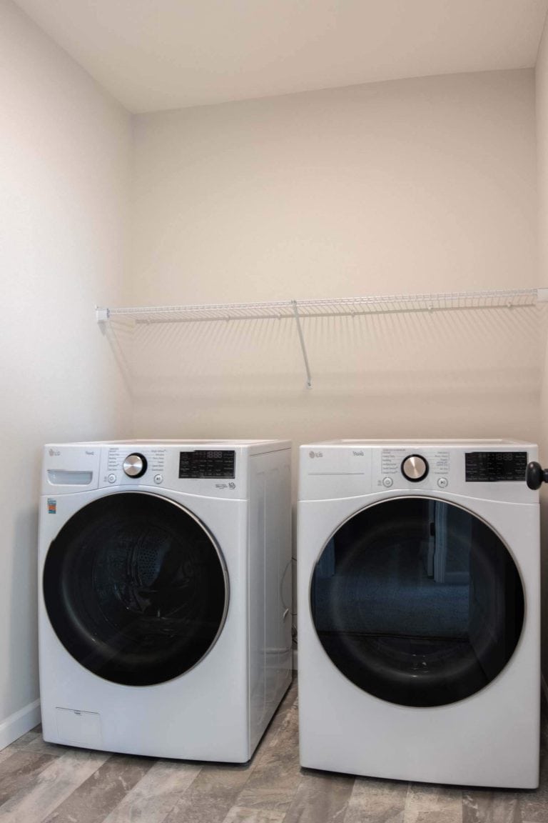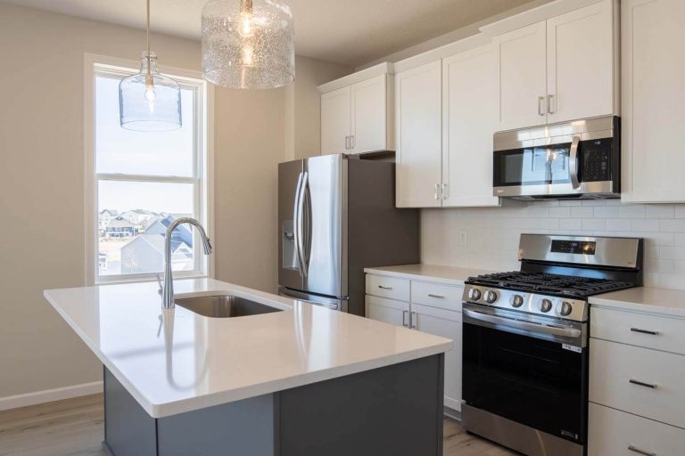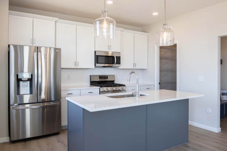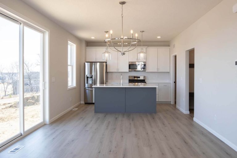 - Kitchen offers 42″ upper cabinets, gas range, upgraded French door refrigerator, and double garbage rollout