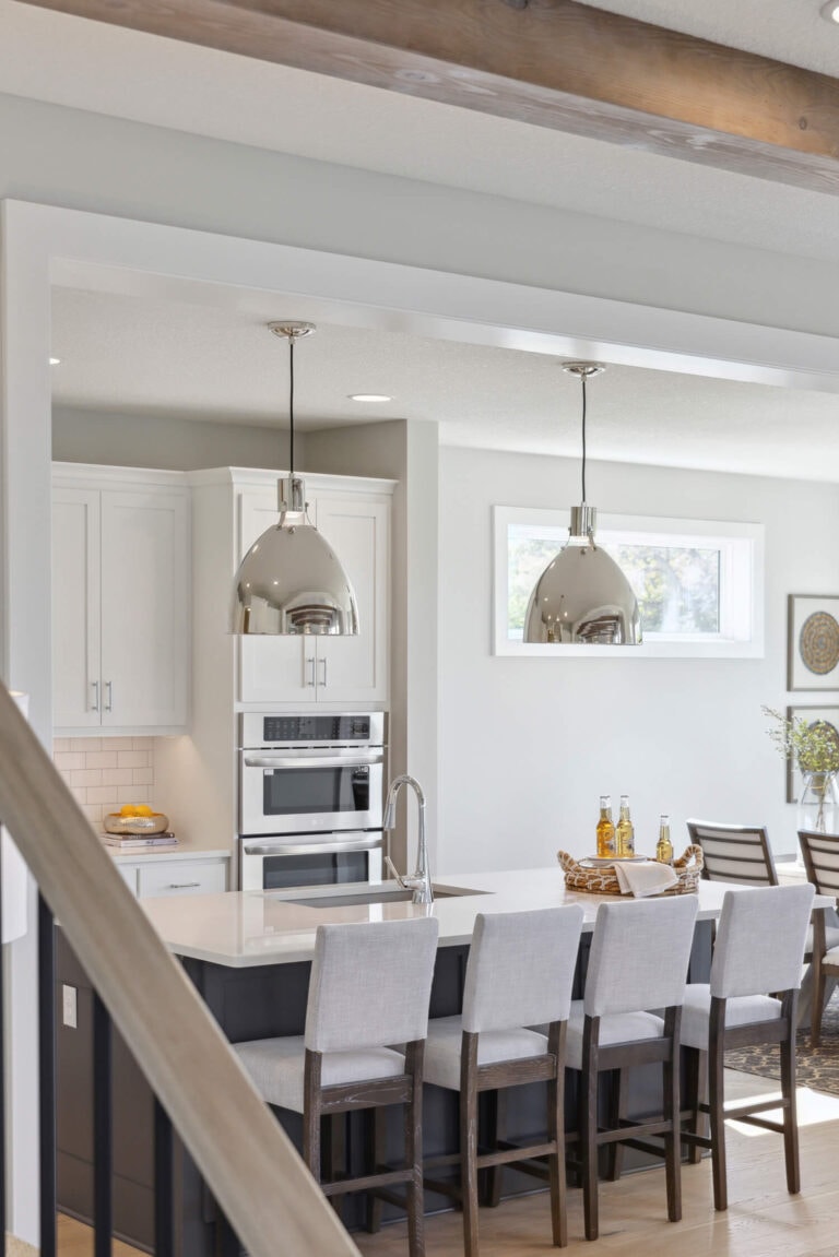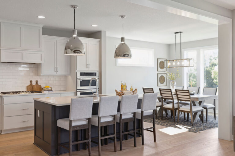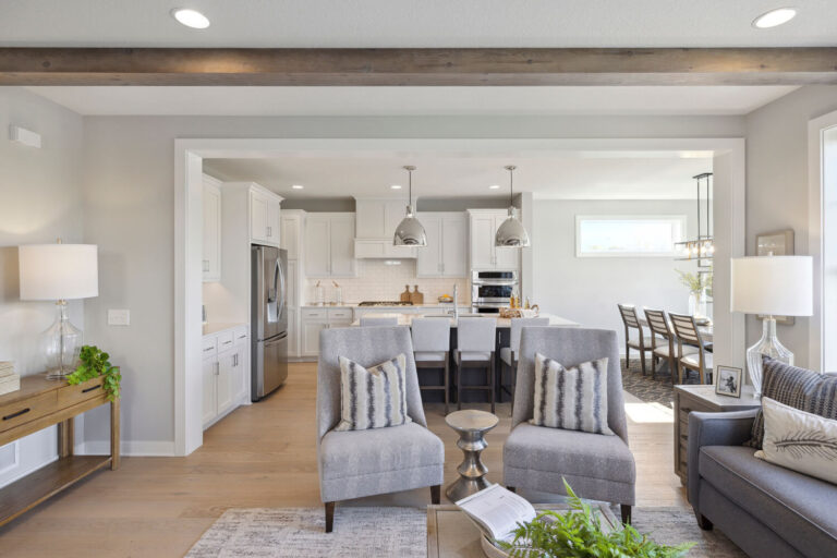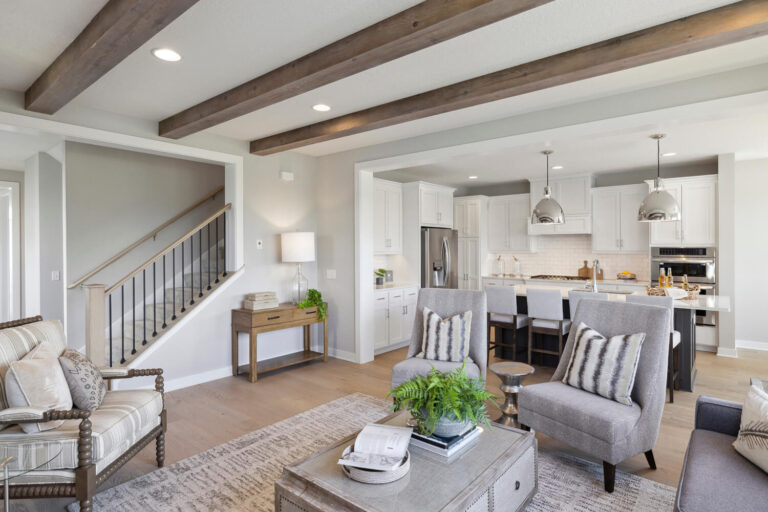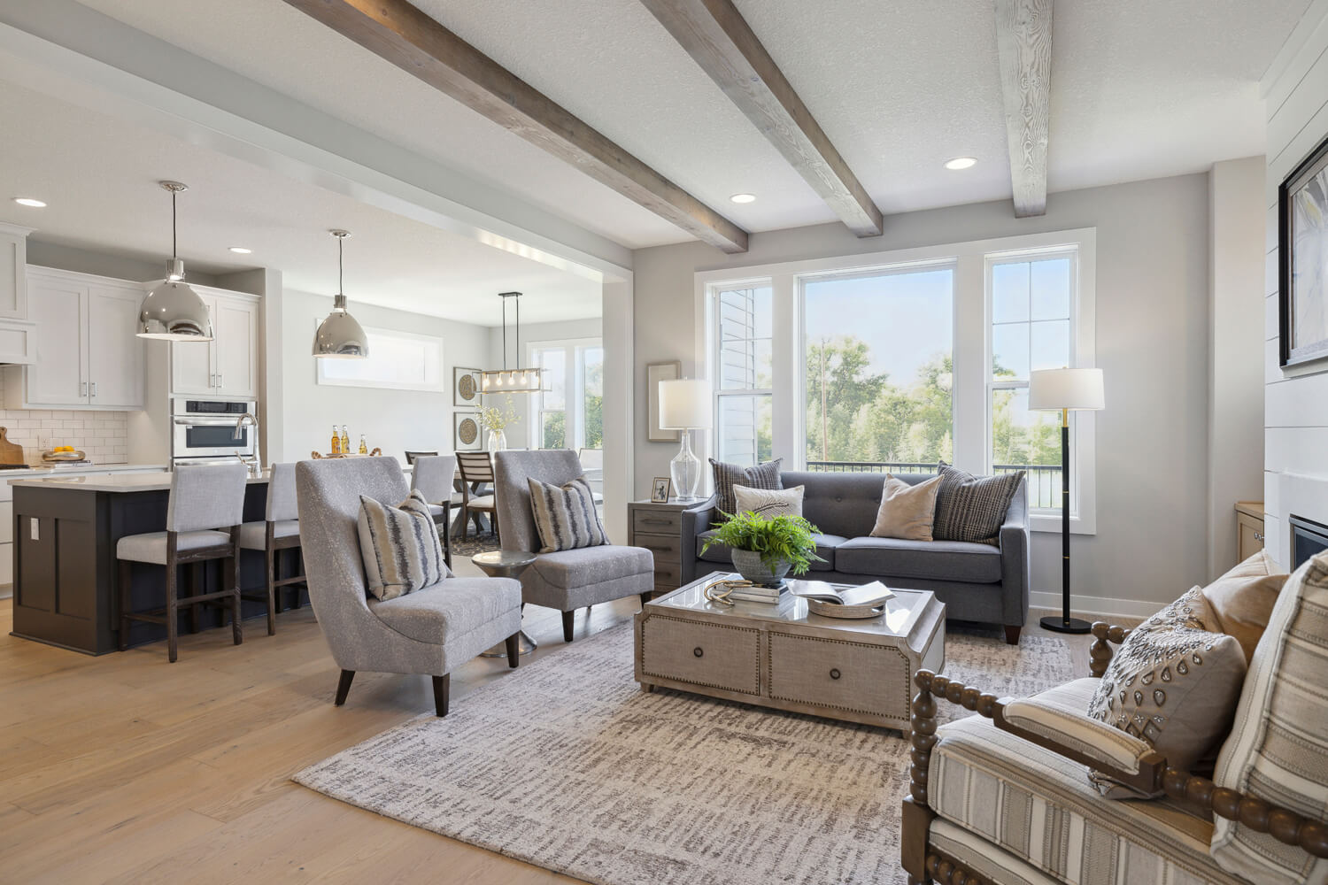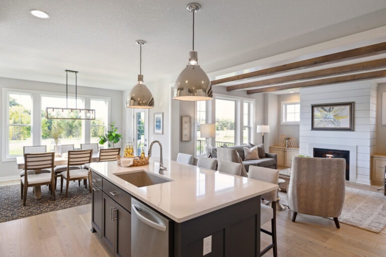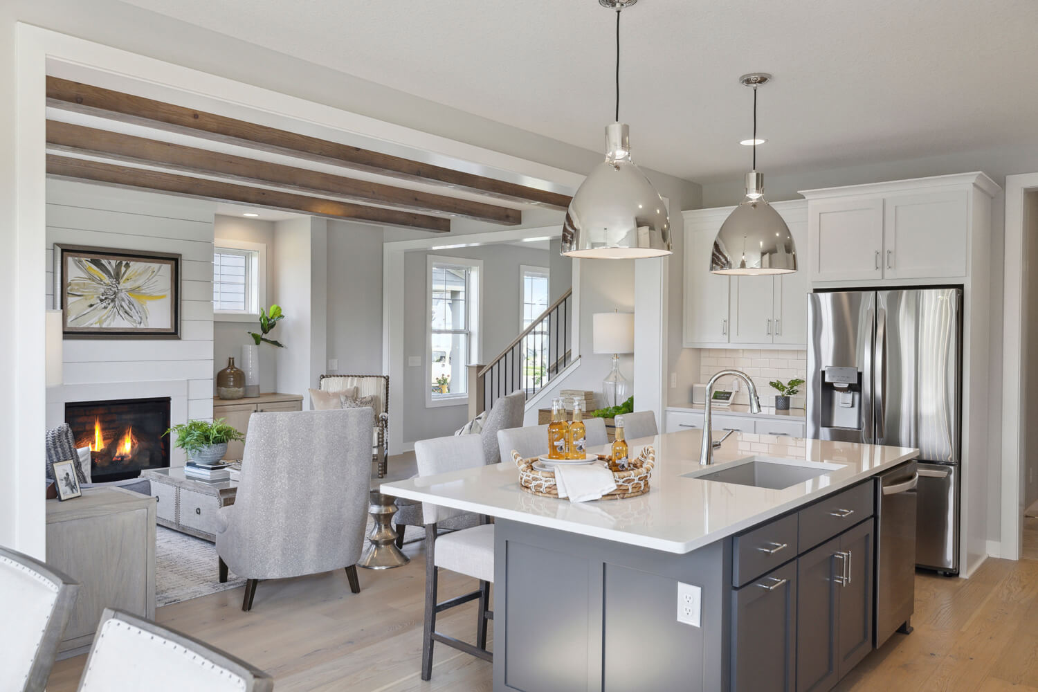 - Gathering room open to kitchen with enlarged center island with sink, designer wood hood, and adjacent dining room