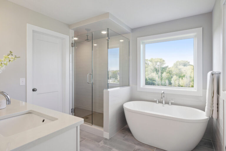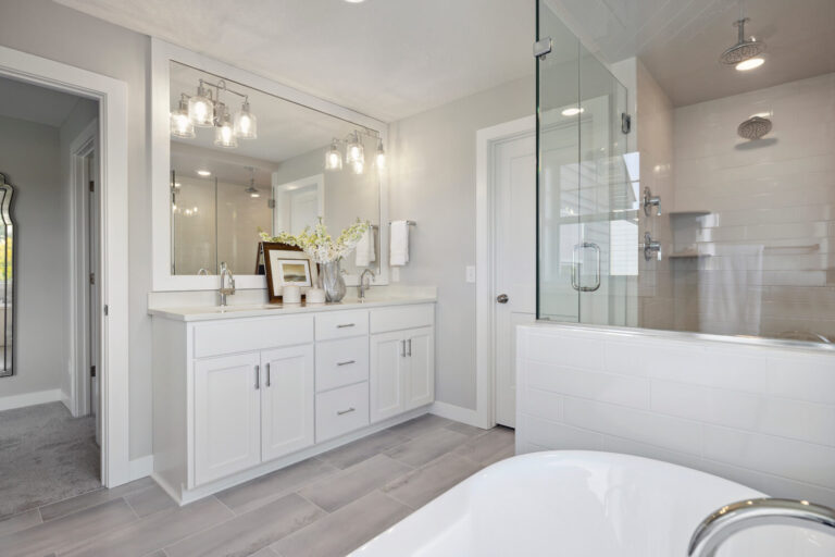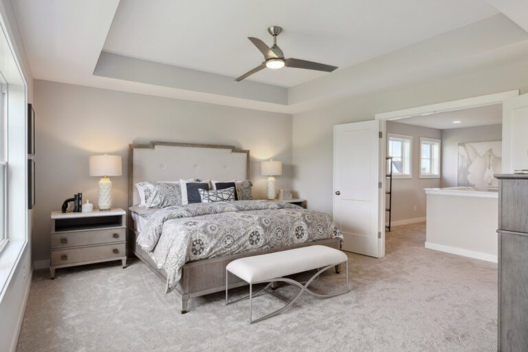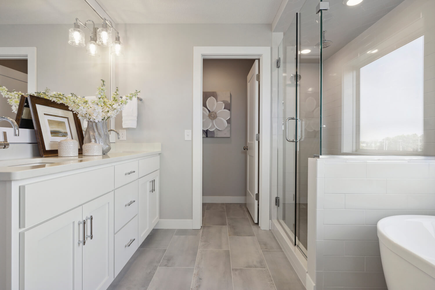 - Exceptional Owner’s suite features double doors, double sink vanity, seperate tub, ceramic tiled shower walls, linen closet and large walk-in closet