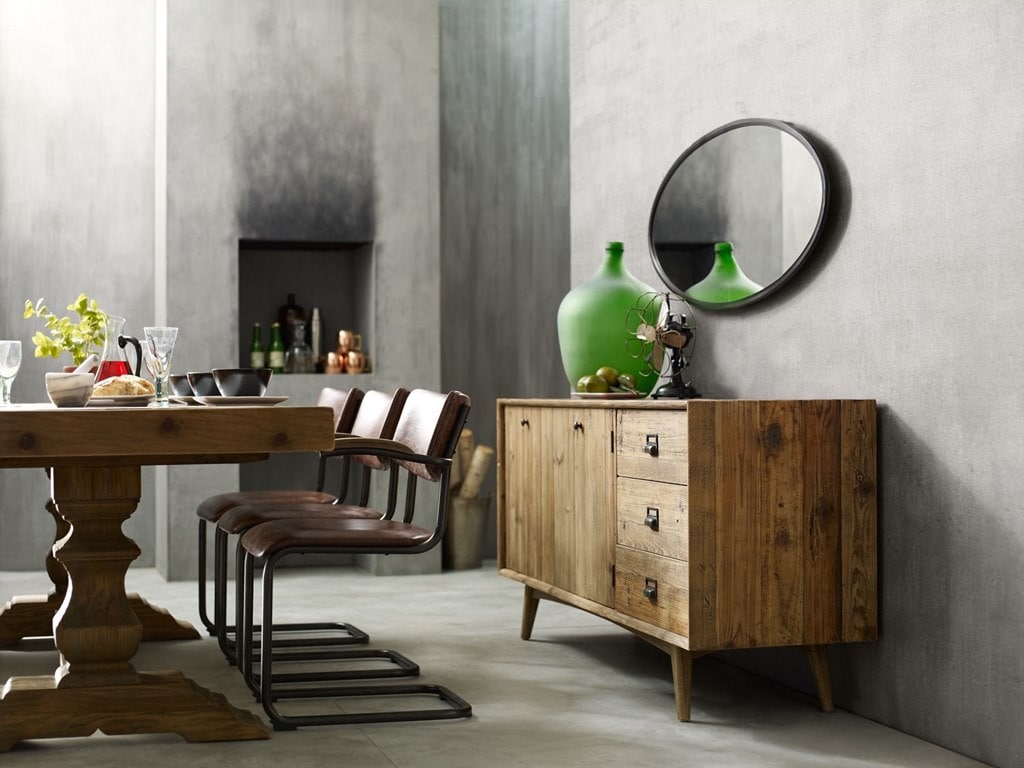 Concrete walls give a contemporary dining space a hint of edginess while also offering industrial flair. A mid century modern crezenda and vintage-look dining chairs further the contemporary chic look while paying tribute to classic styles.