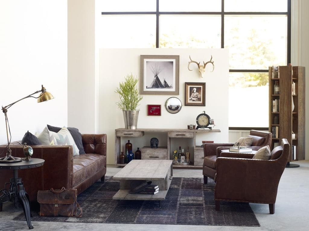 If a home remodel isn’t in your plans, add natural flair to your space by incorporating elemental decor. A chic gallery wall that includes a house plant and animal skull offers a subtle nod to the raw material trend. Furnish your space with leather sofas, wood tables, and brass industrial lighting to complement edgy accents.